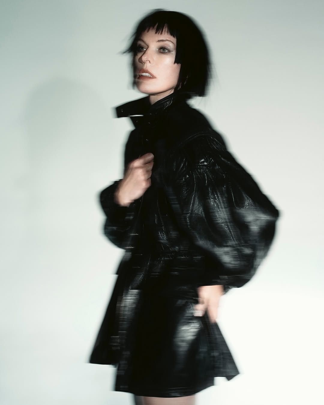 Posant sur une chaise comme une guerrière futuriste, elle défie la gravité avec des ceintures à œillets qui semblent sorties d’un vaisseau spatial en panne.