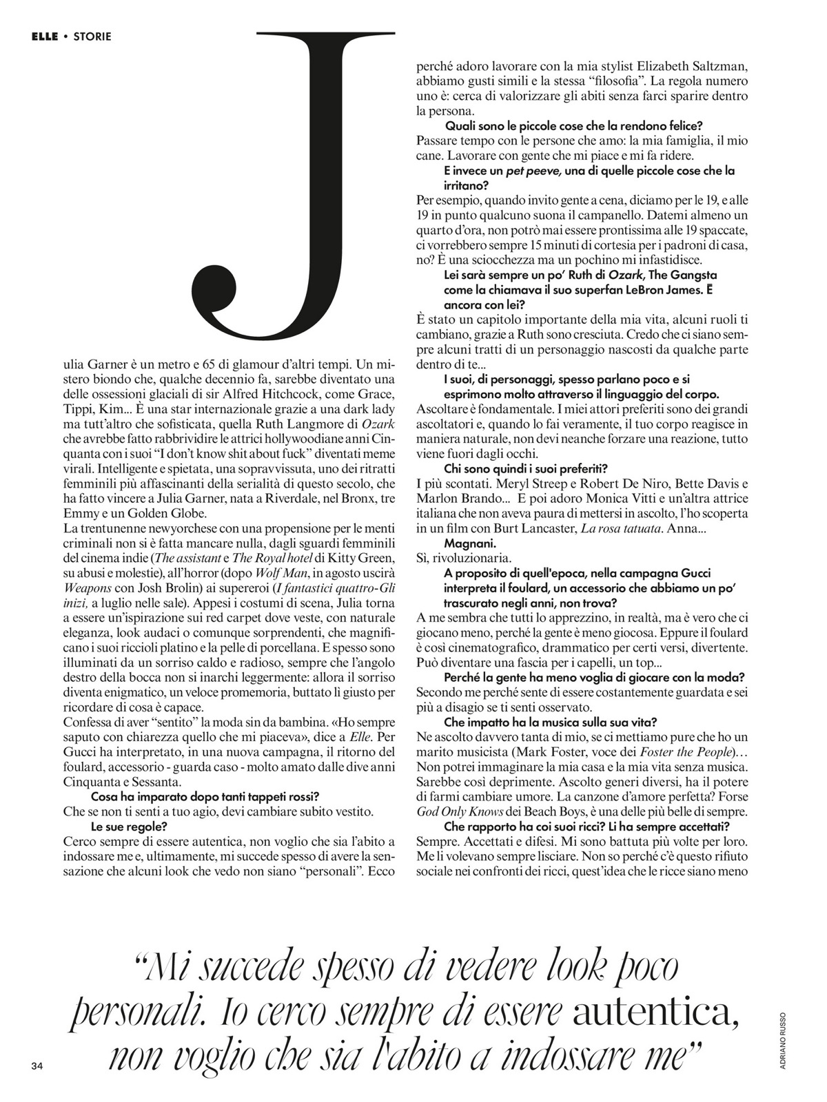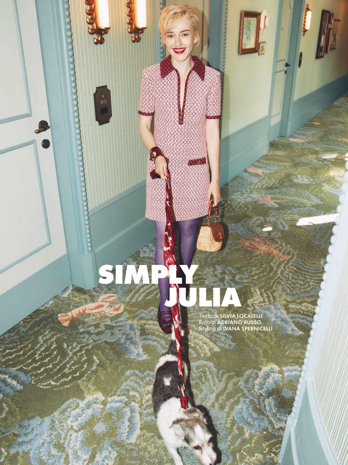 Julia Garner transforme Elle Italia en défilé de tricot glamour ! Dans un couloir, elle promène un chien avec une dégaine de star des années 70, comme si elle auditionnait pour un remake de Grease.