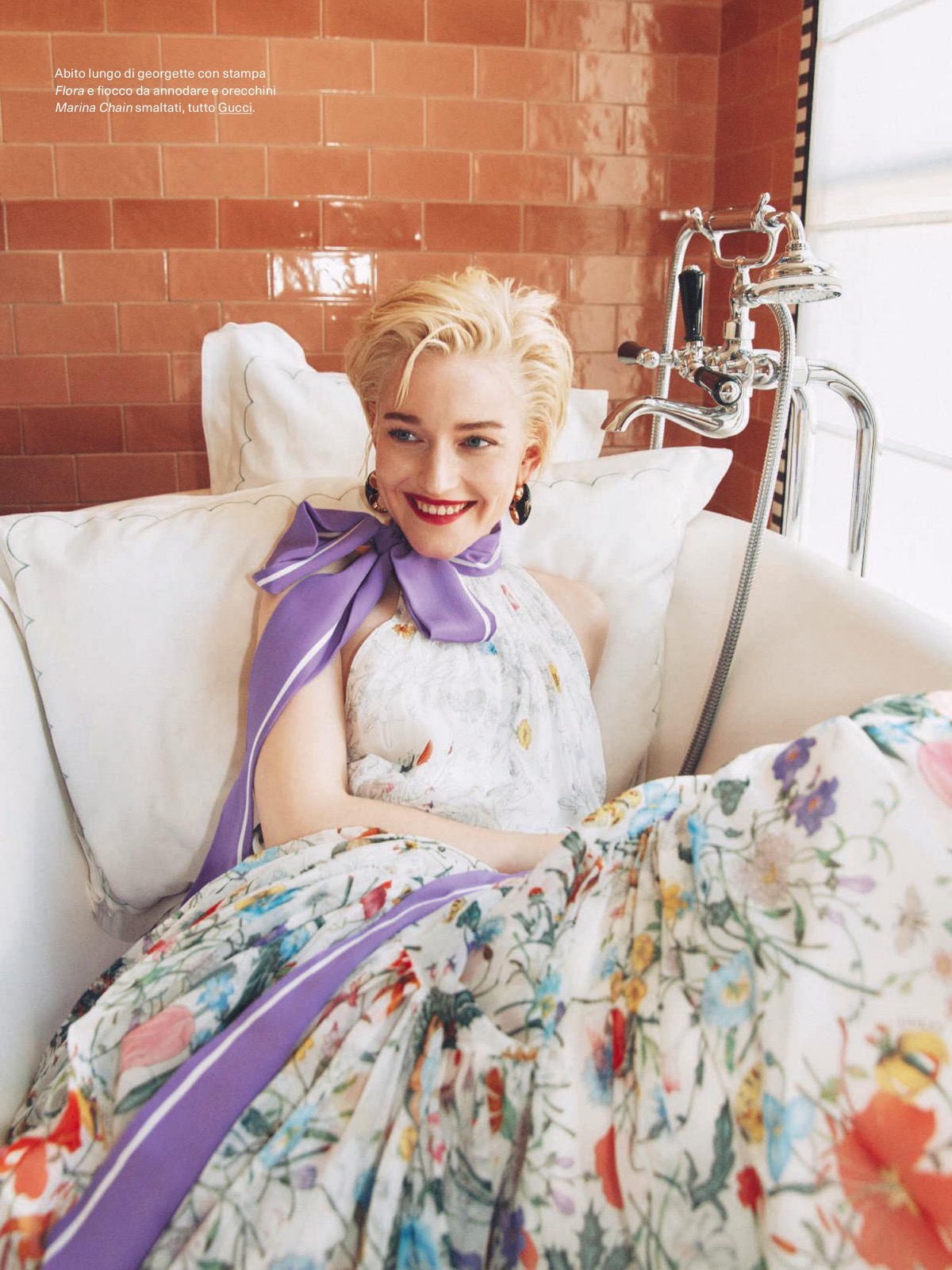 Et que dire de cette baignoire fleurie où elle pose comme une diva en vacances ? On jurerait qu’elle a dit : « La mode, c’est moi qui la fais mousser ! »