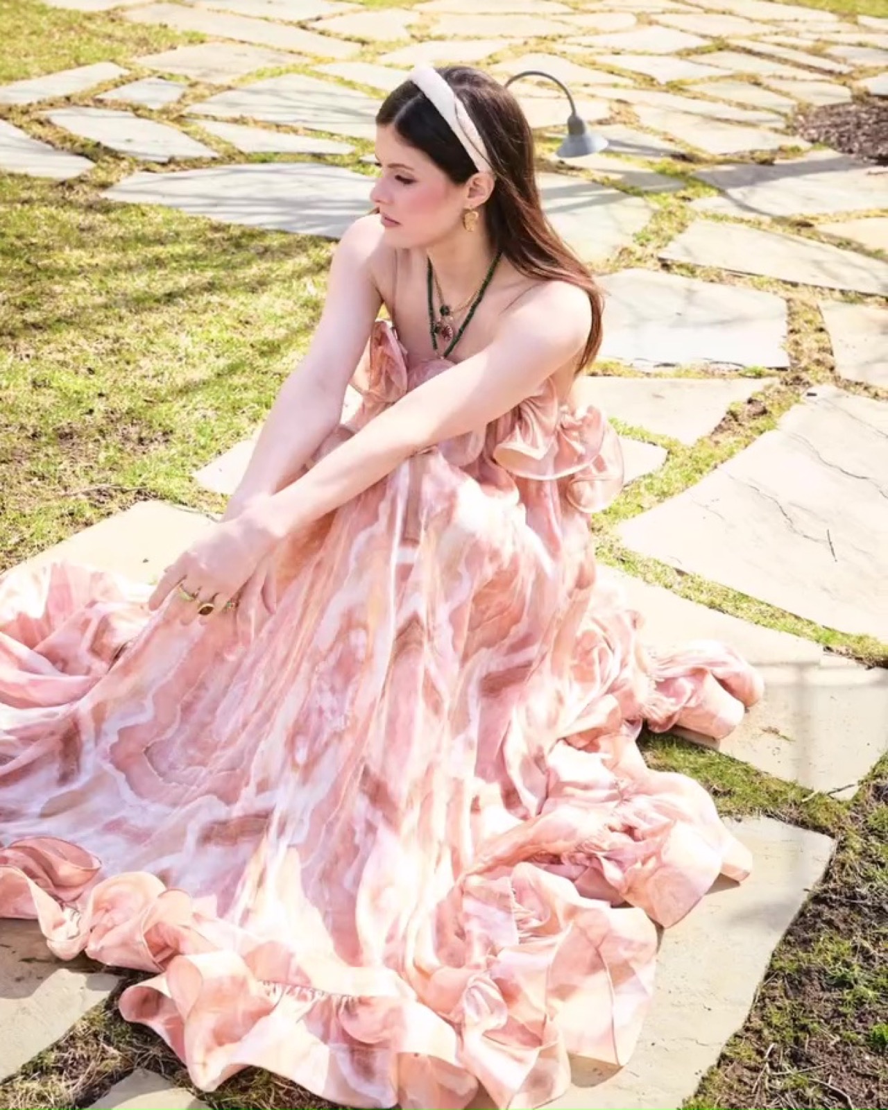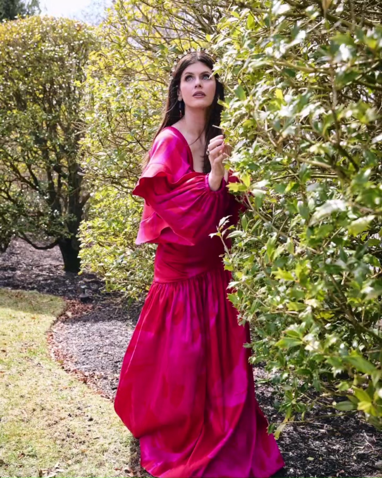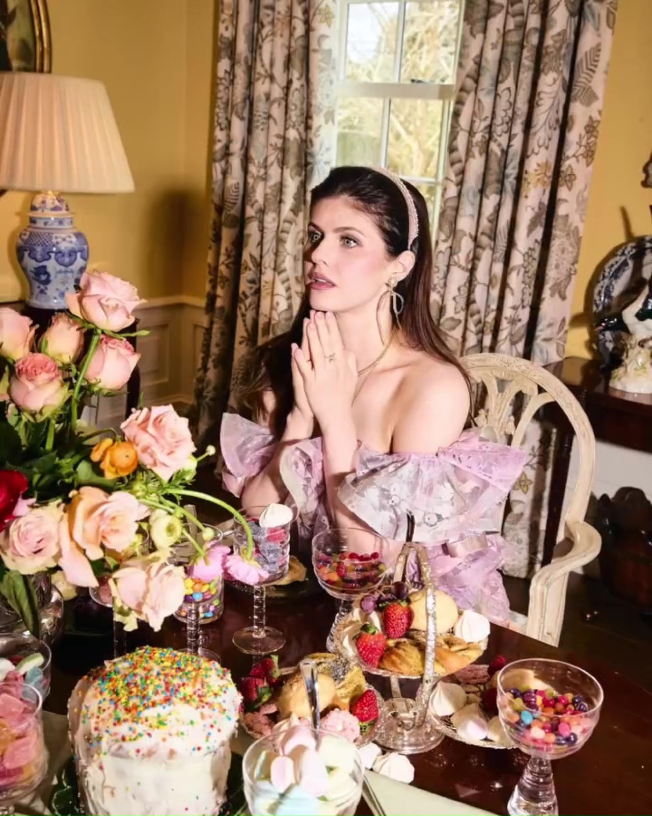 Et que dire des roses pastel qu’elle tient comme si elle allait les offrir à un lapin d’Alice au Pays des Merveilles ?