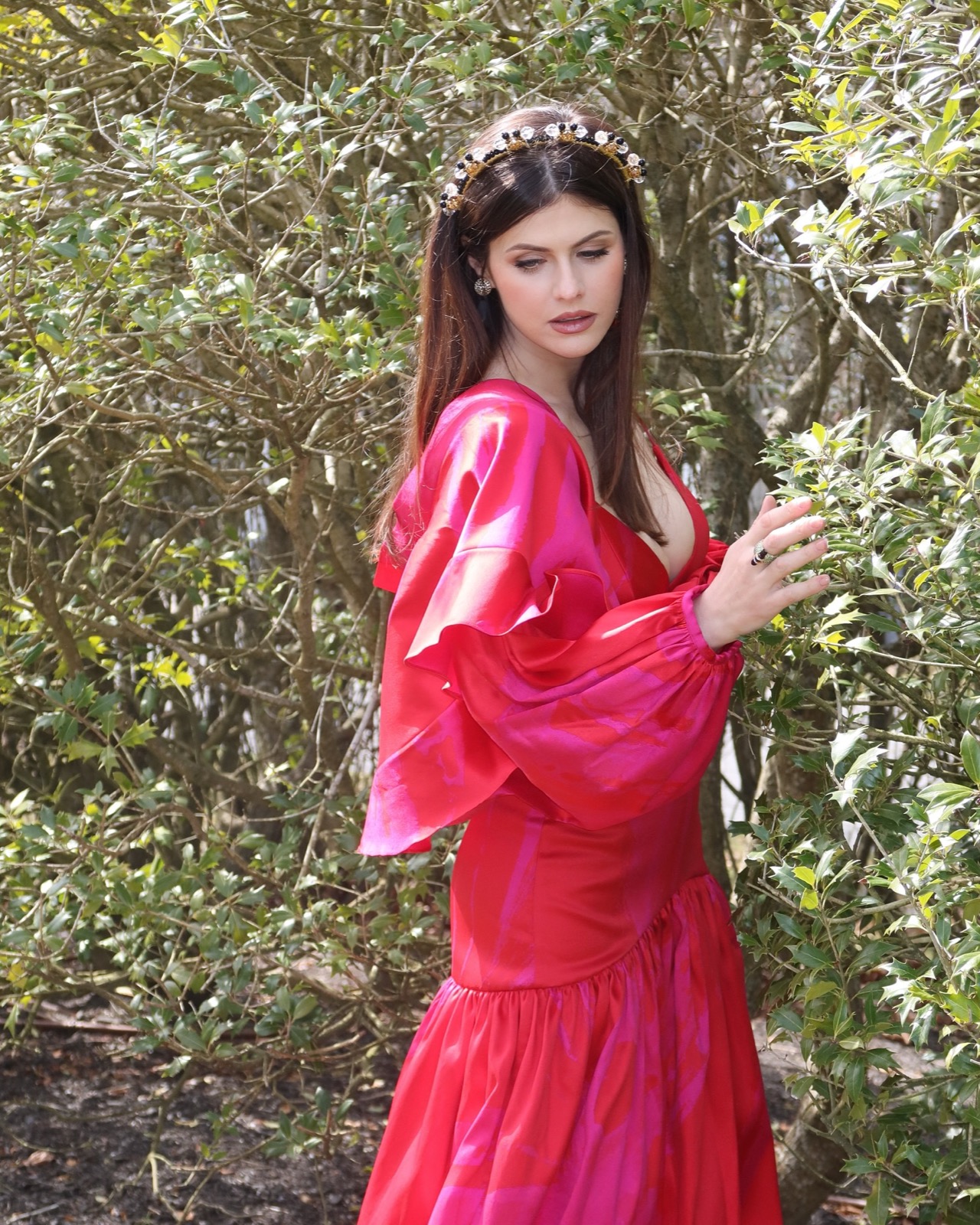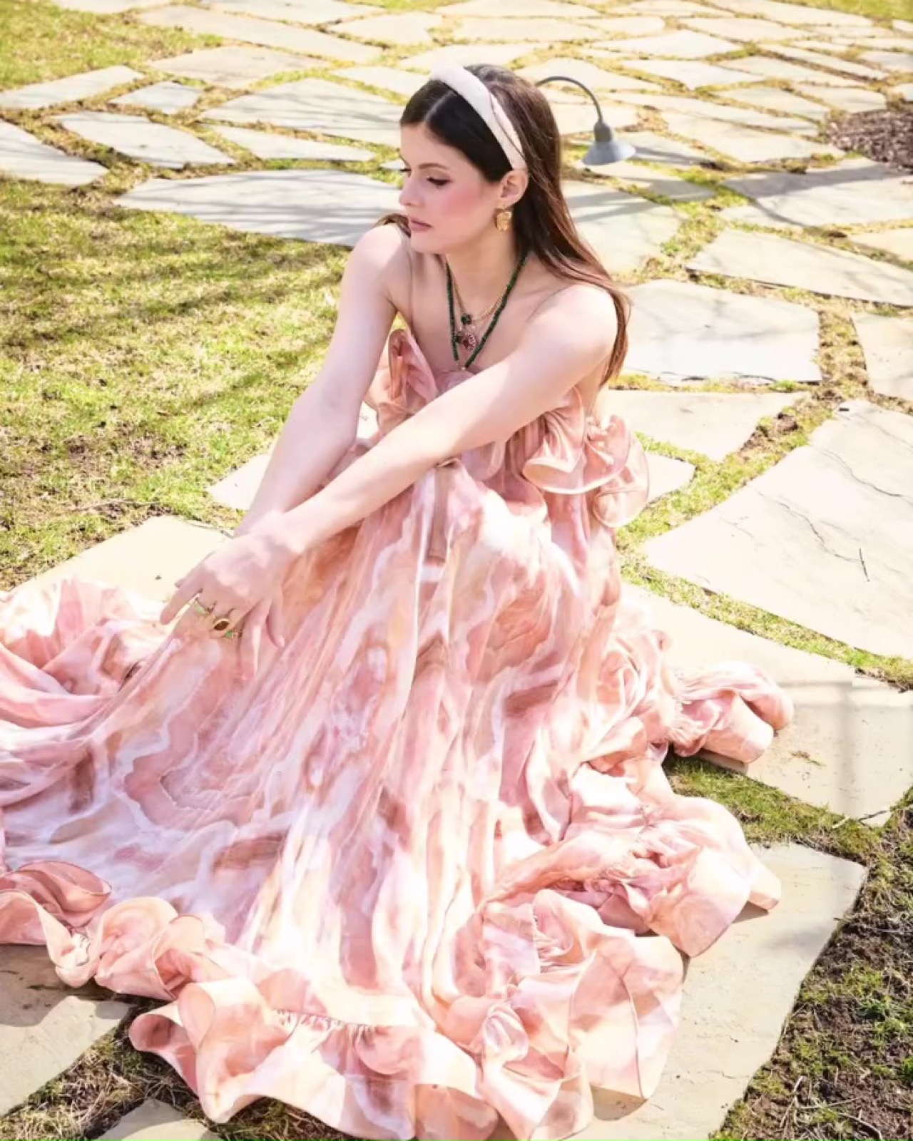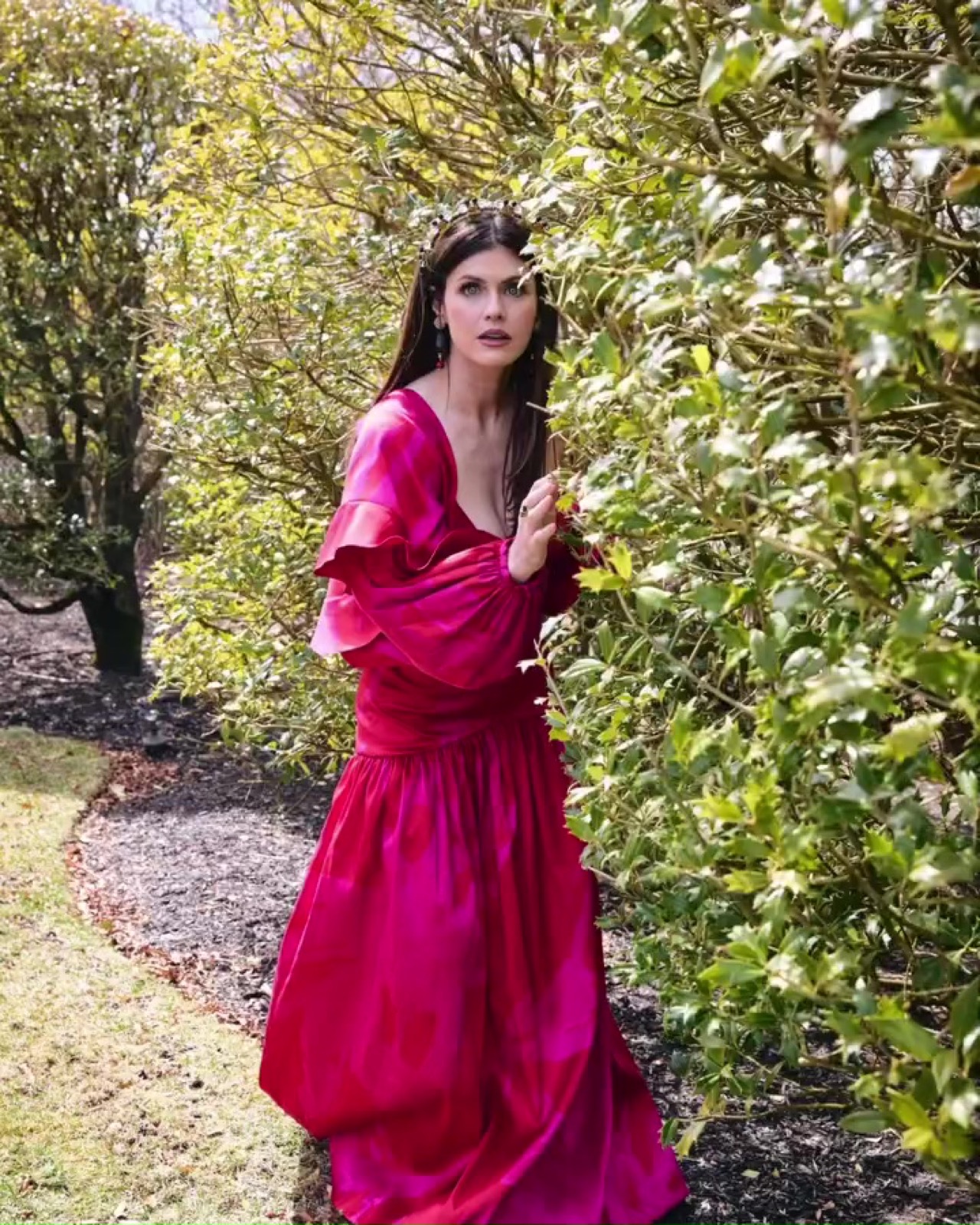Et que dire des roses pastel qu’elle tient comme si elle allait les offrir à un lapin d’Alice au Pays des Merveilles ?