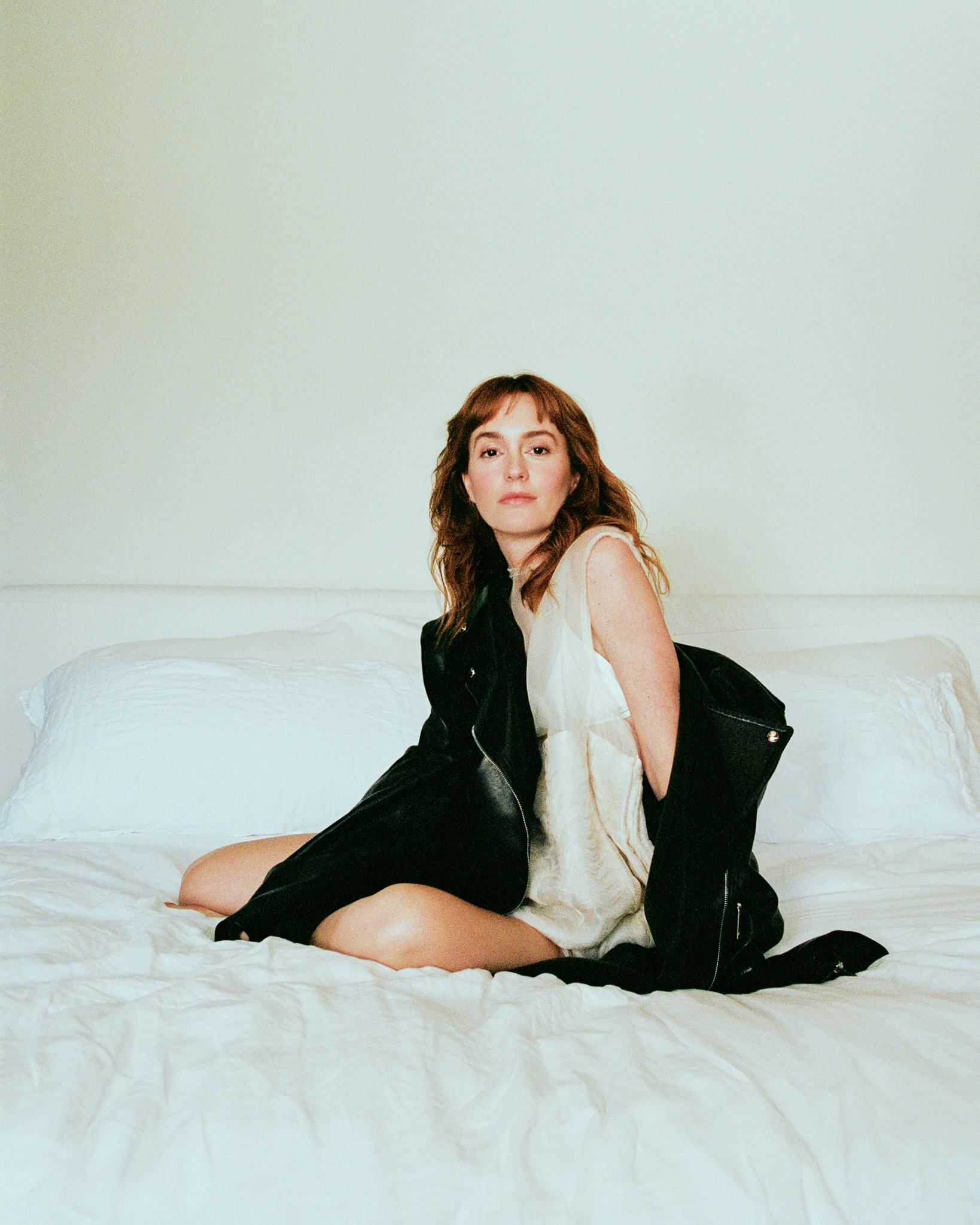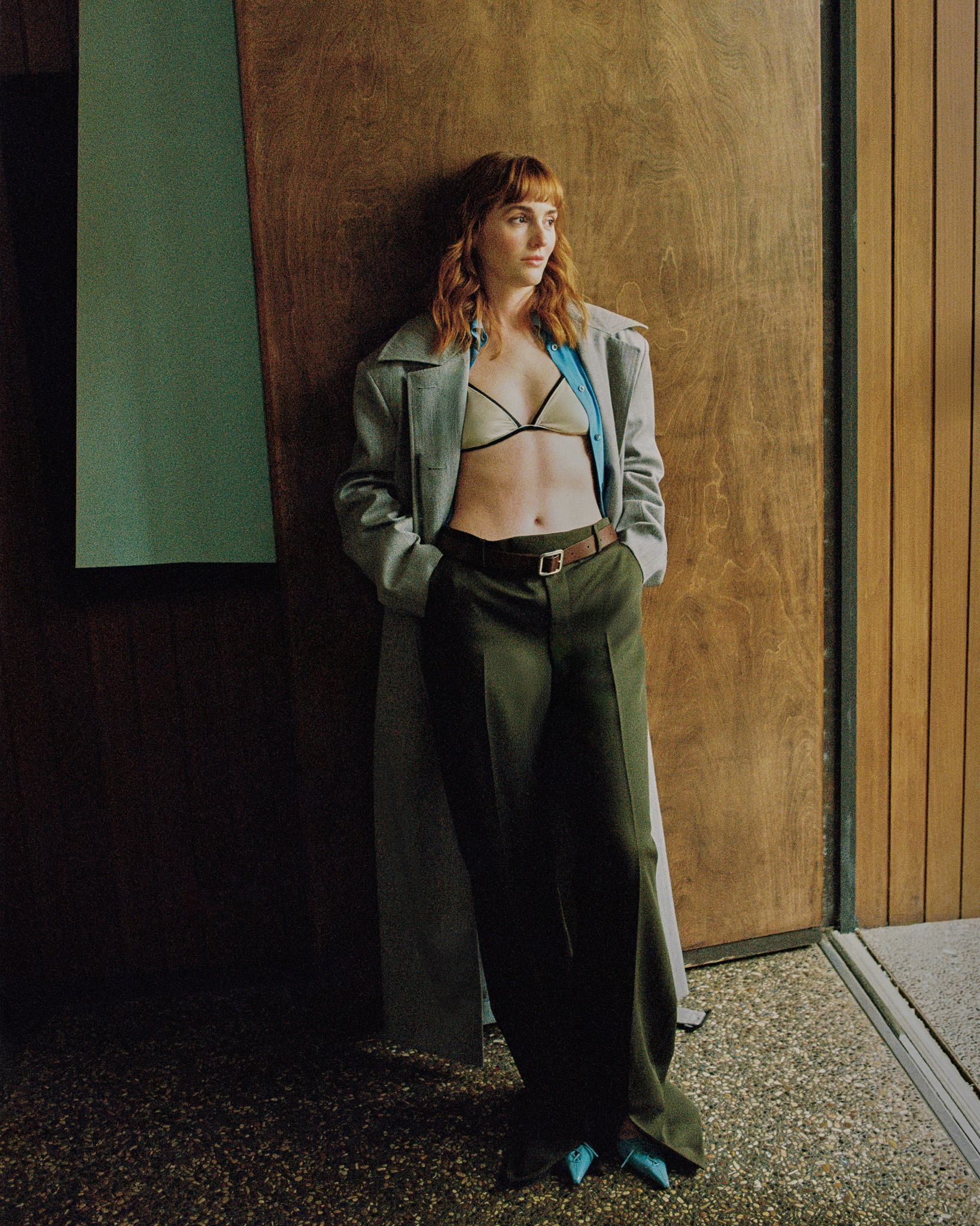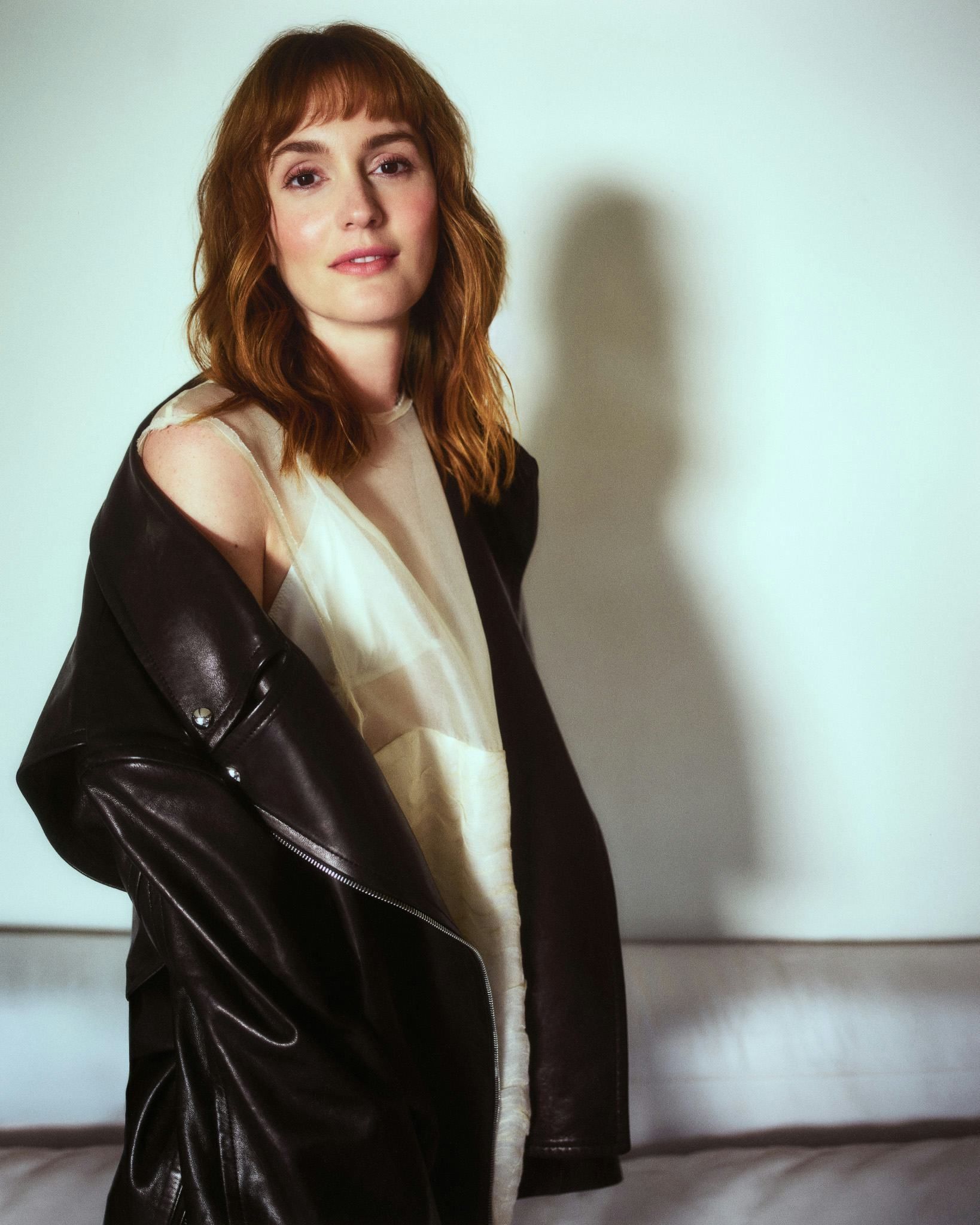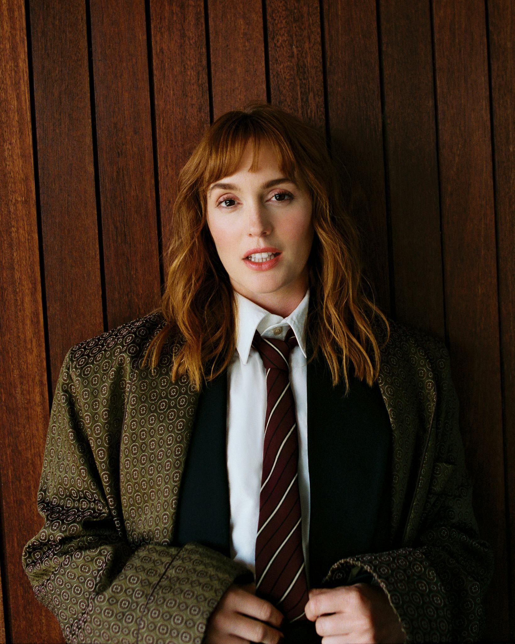 Leighton Meester, qui mélange chic et audace pour Bustle ! Avec son manteau oversized, sa cravate improbable et ce soutien-gorge doré qui clame "je suis là", elle repousse les limites du style décontracté.