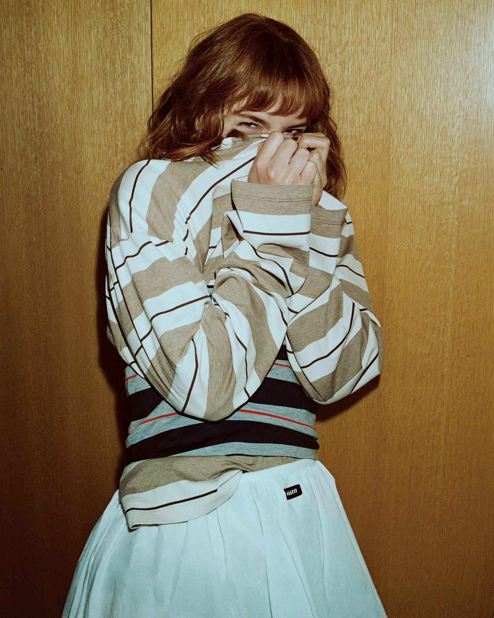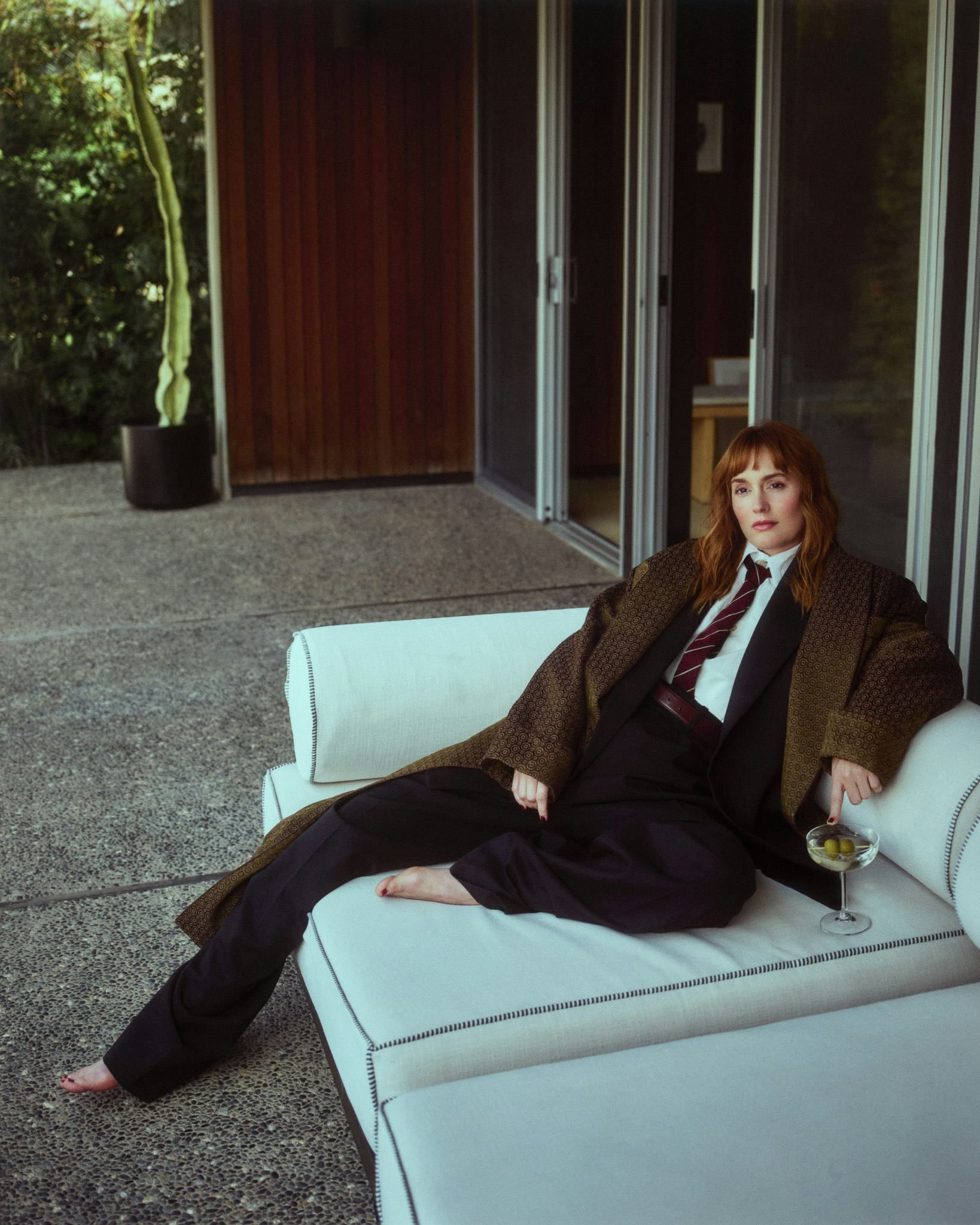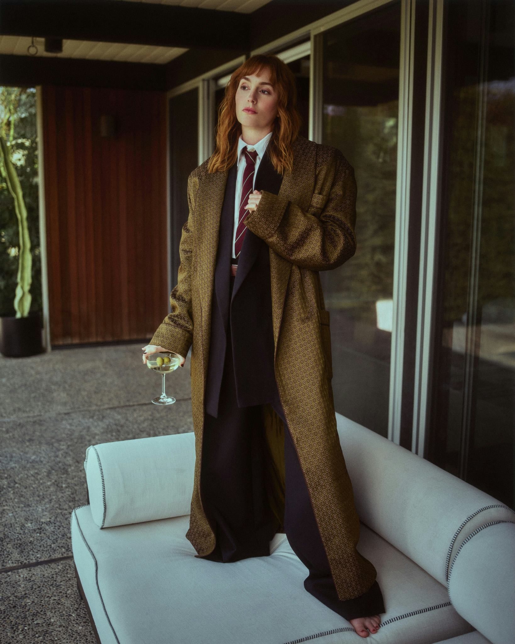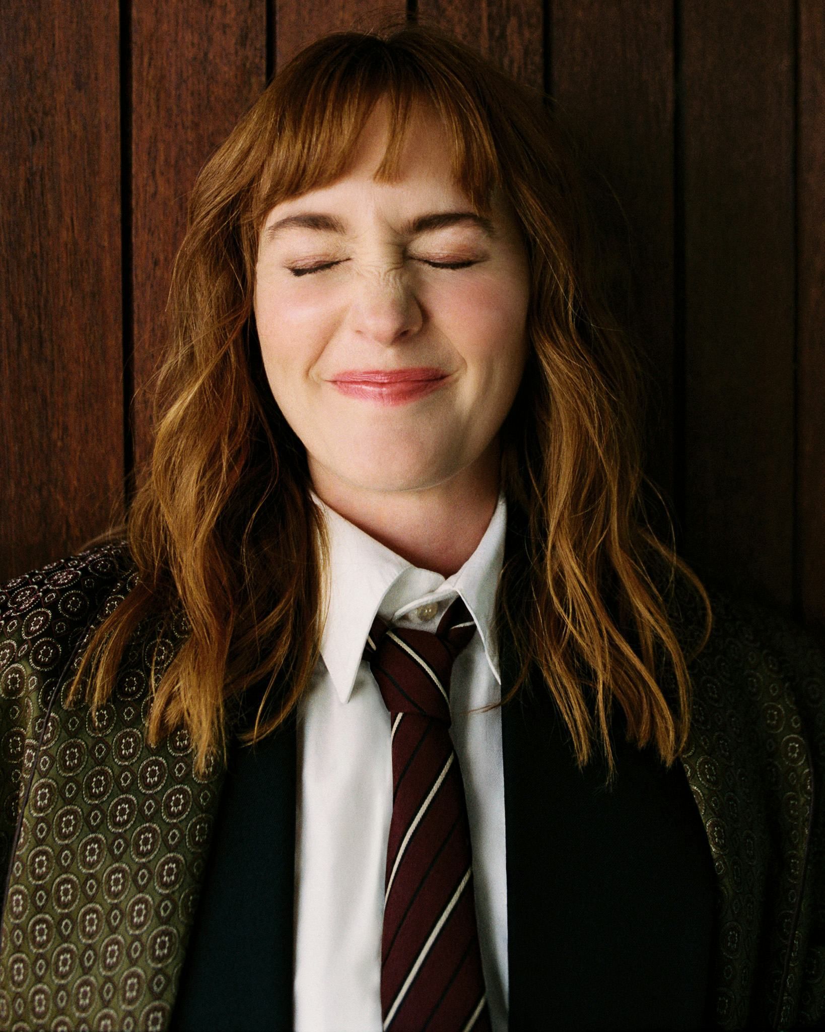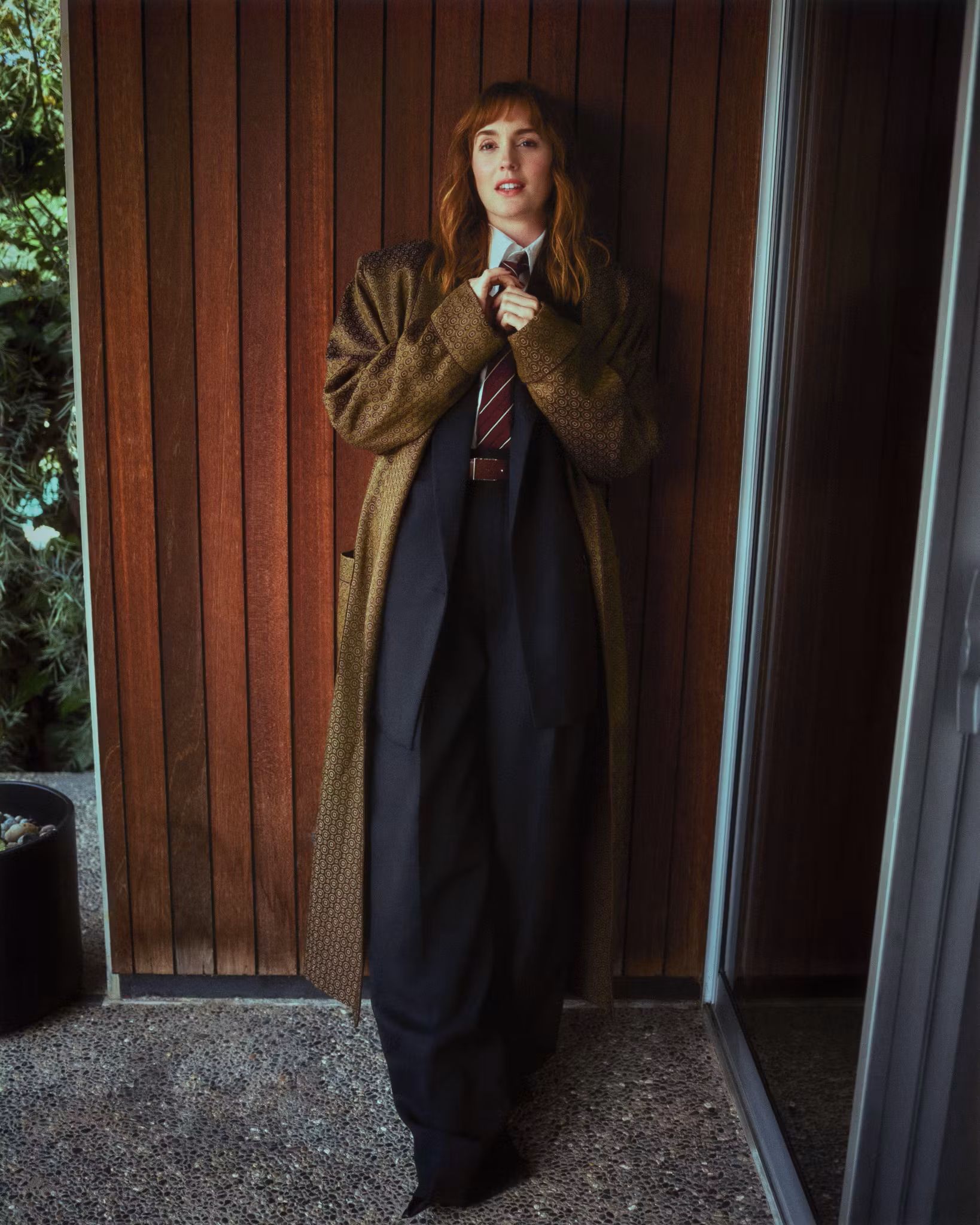 On dirait qu’elle a piqué la garde-robe de son prof de maths pour un shooting improvisé, tout en gardant une touche de Gossip Girl glamour.