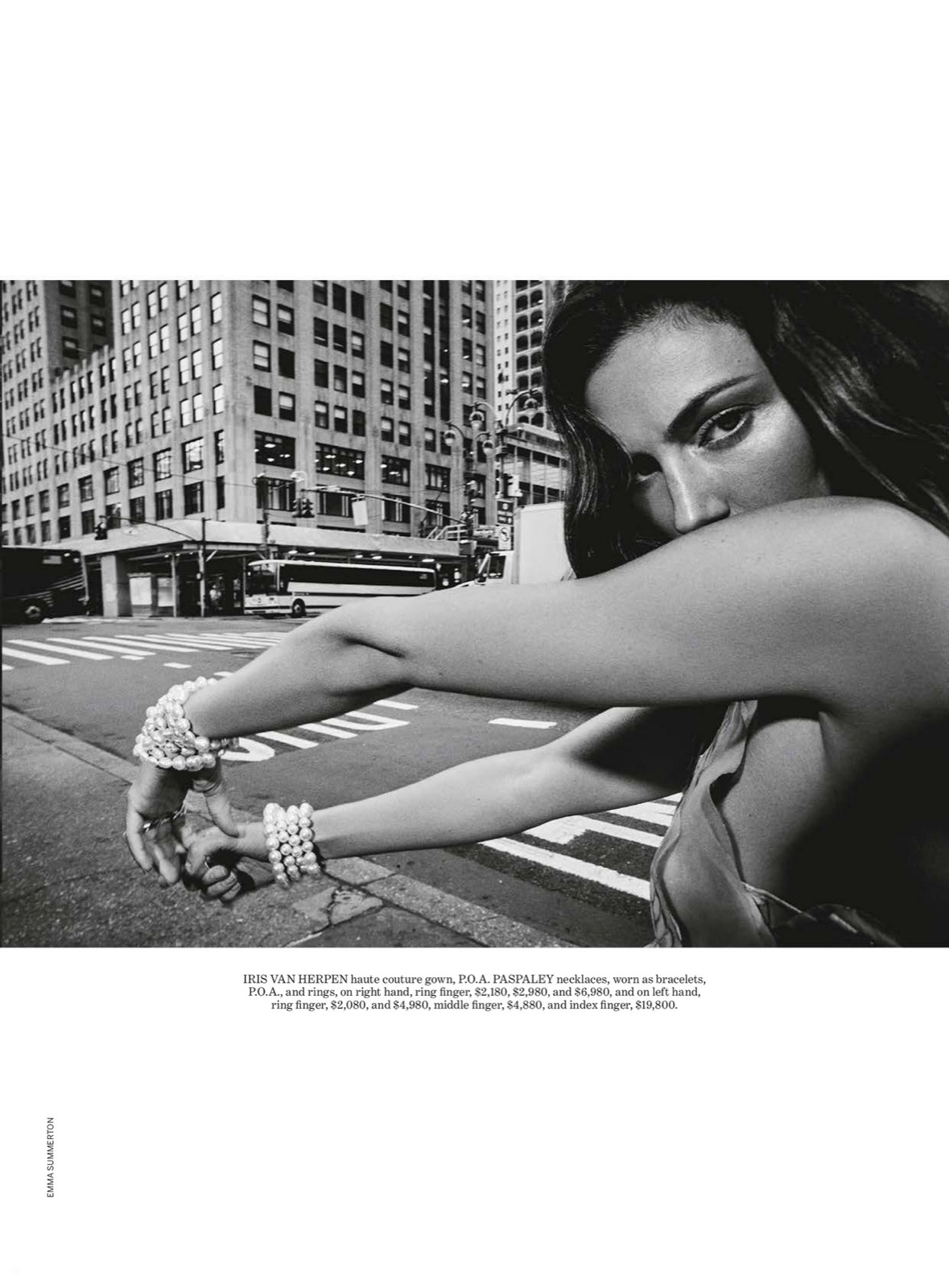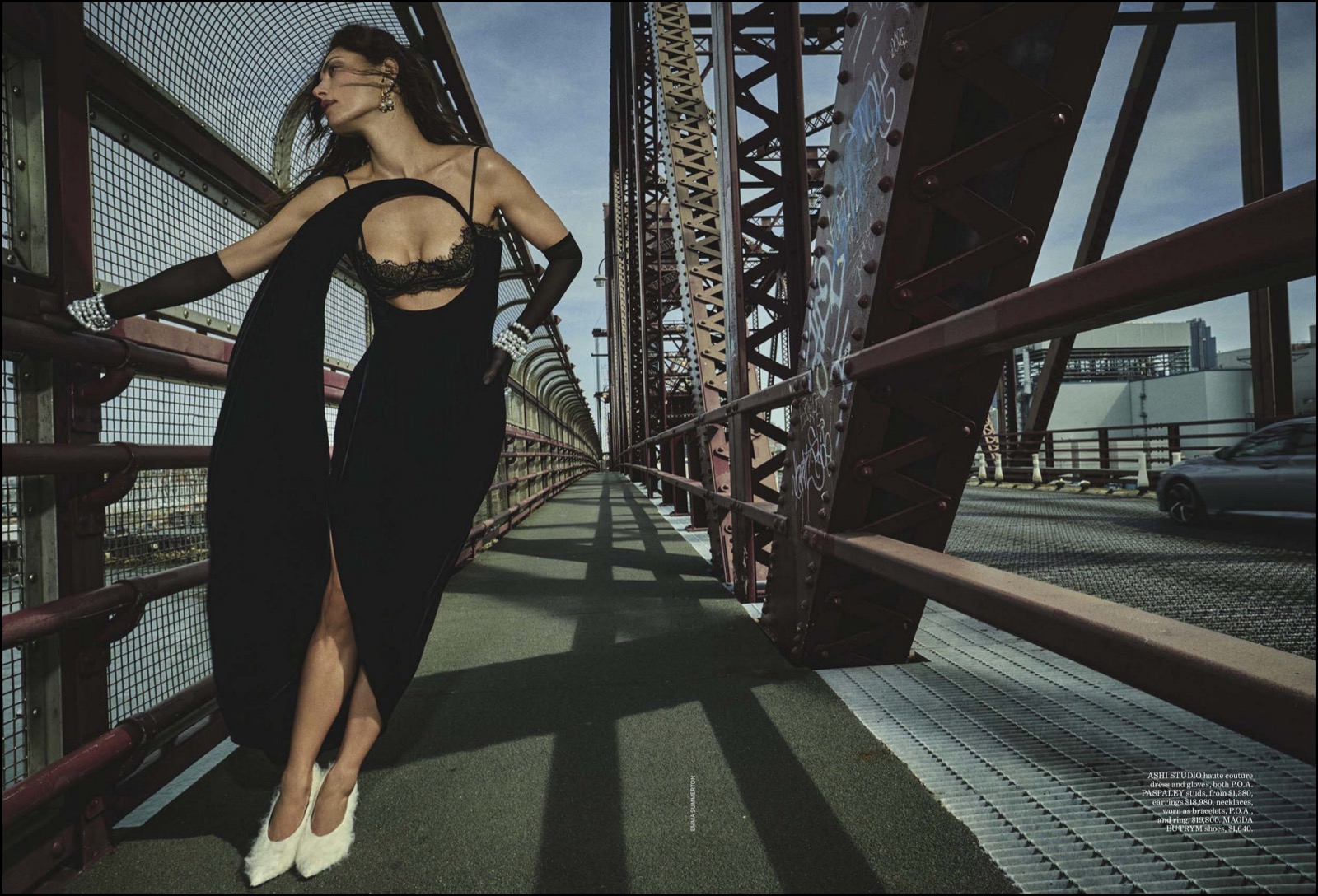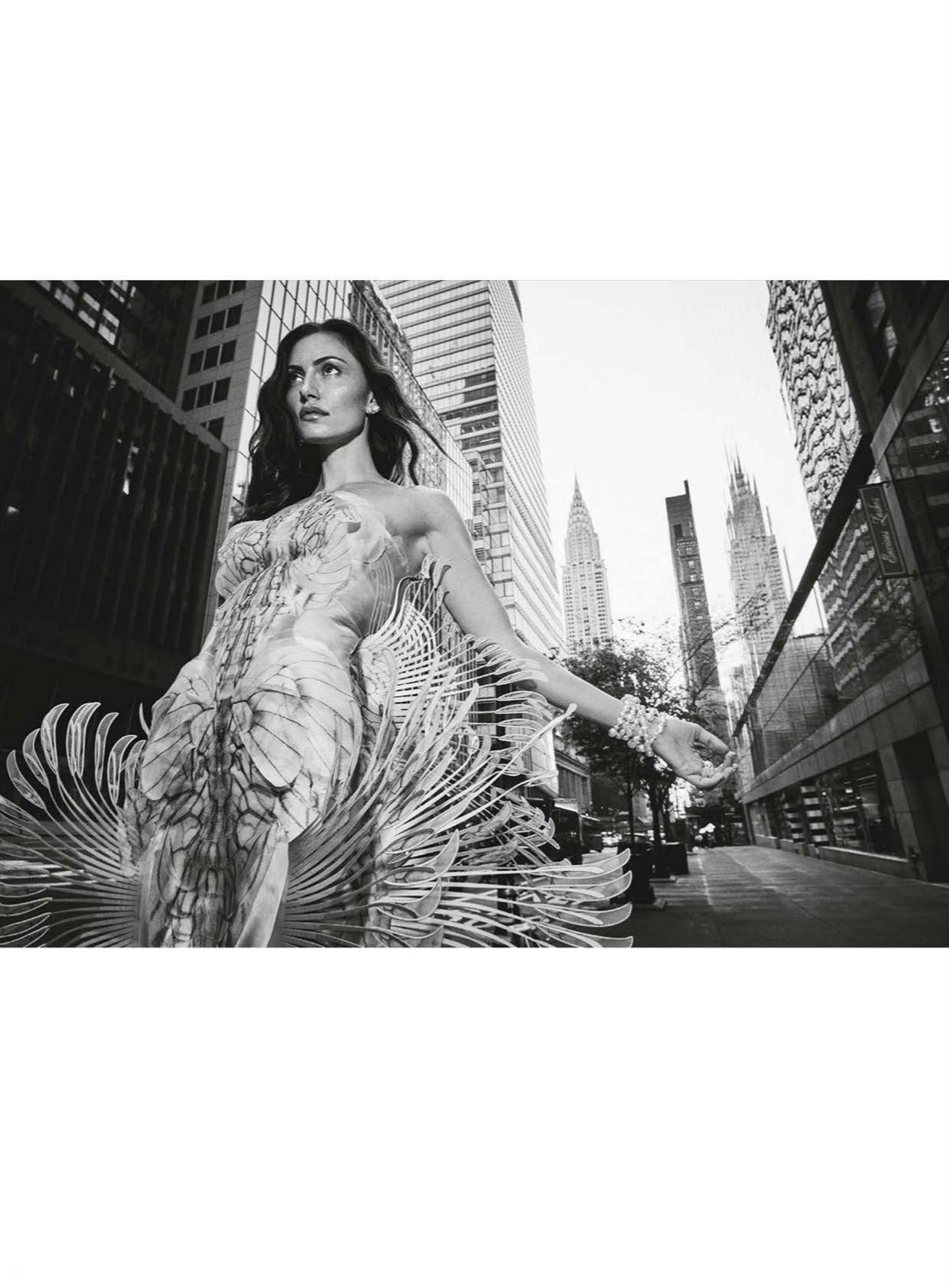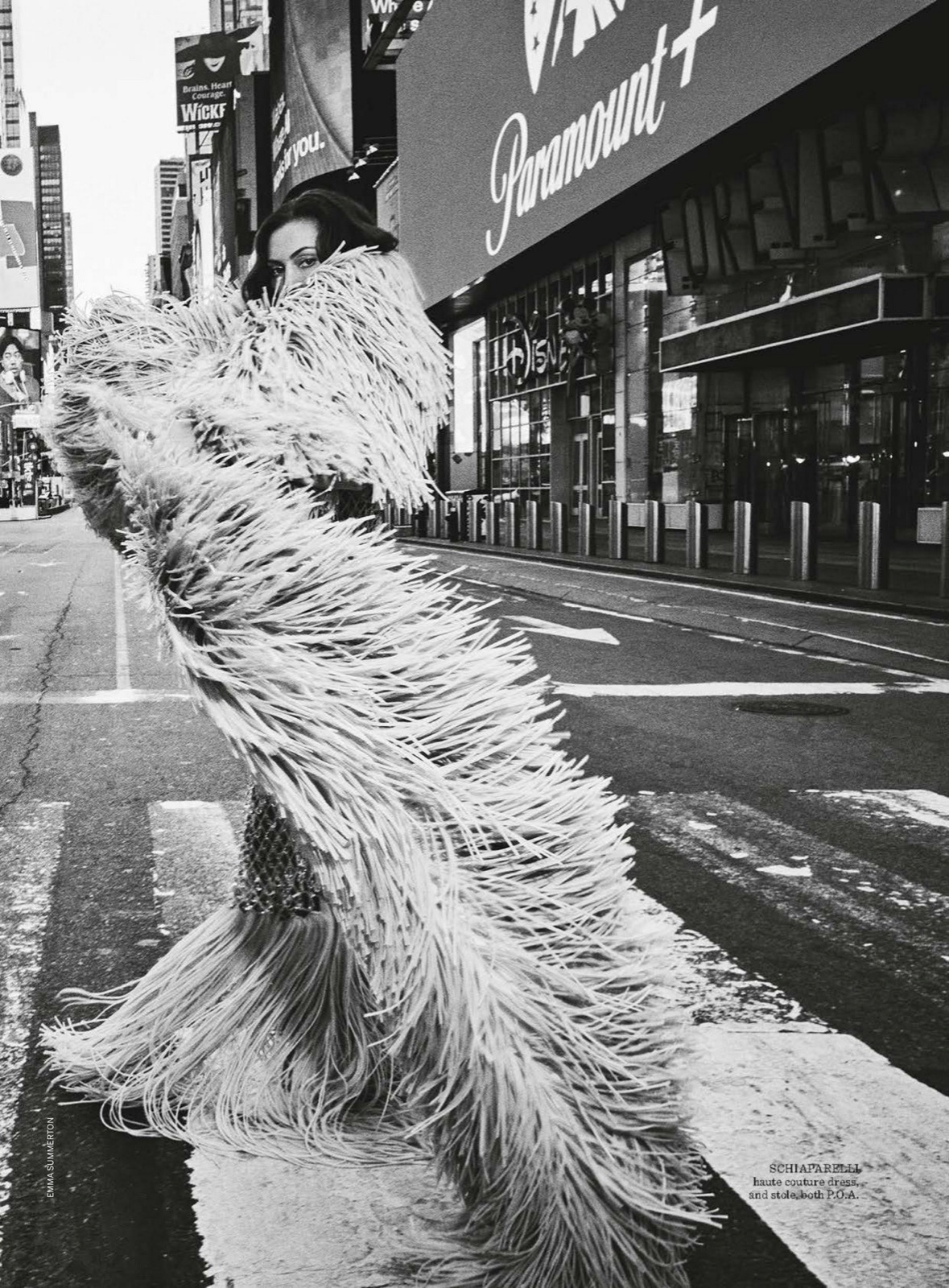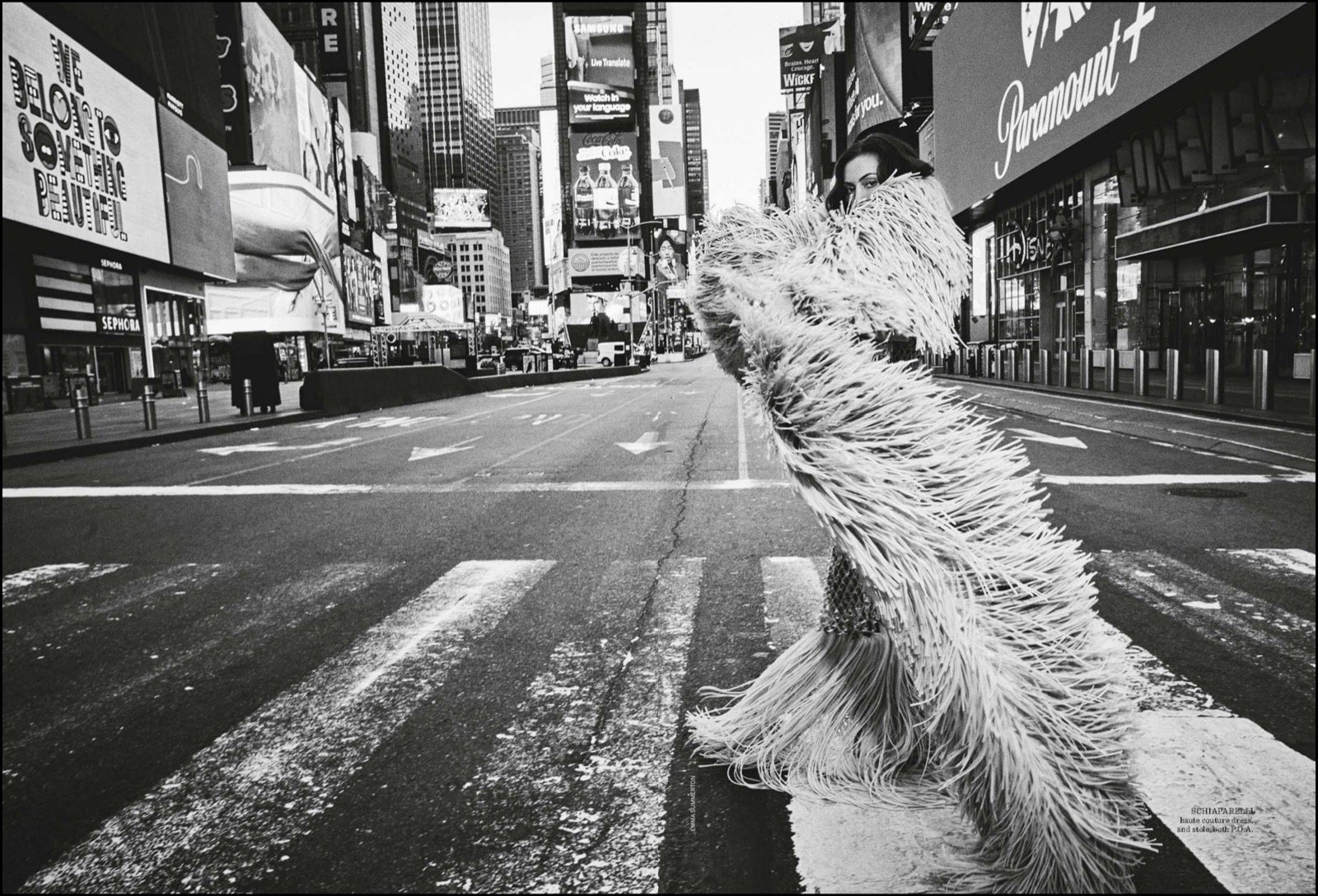 Sur ce pont avec sa robe noire audacieuse, elle joue les divas perchées, défiant le vent avec des escarpins moelleux. À Times Square, elle parade comme si la ville lui appartenait, enveloppée dans une fourrure qui hurle le luxe.