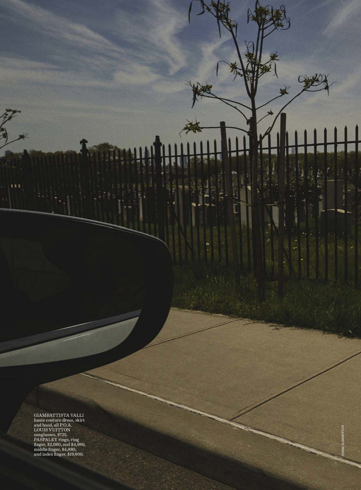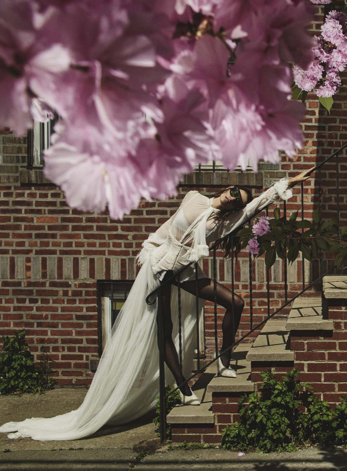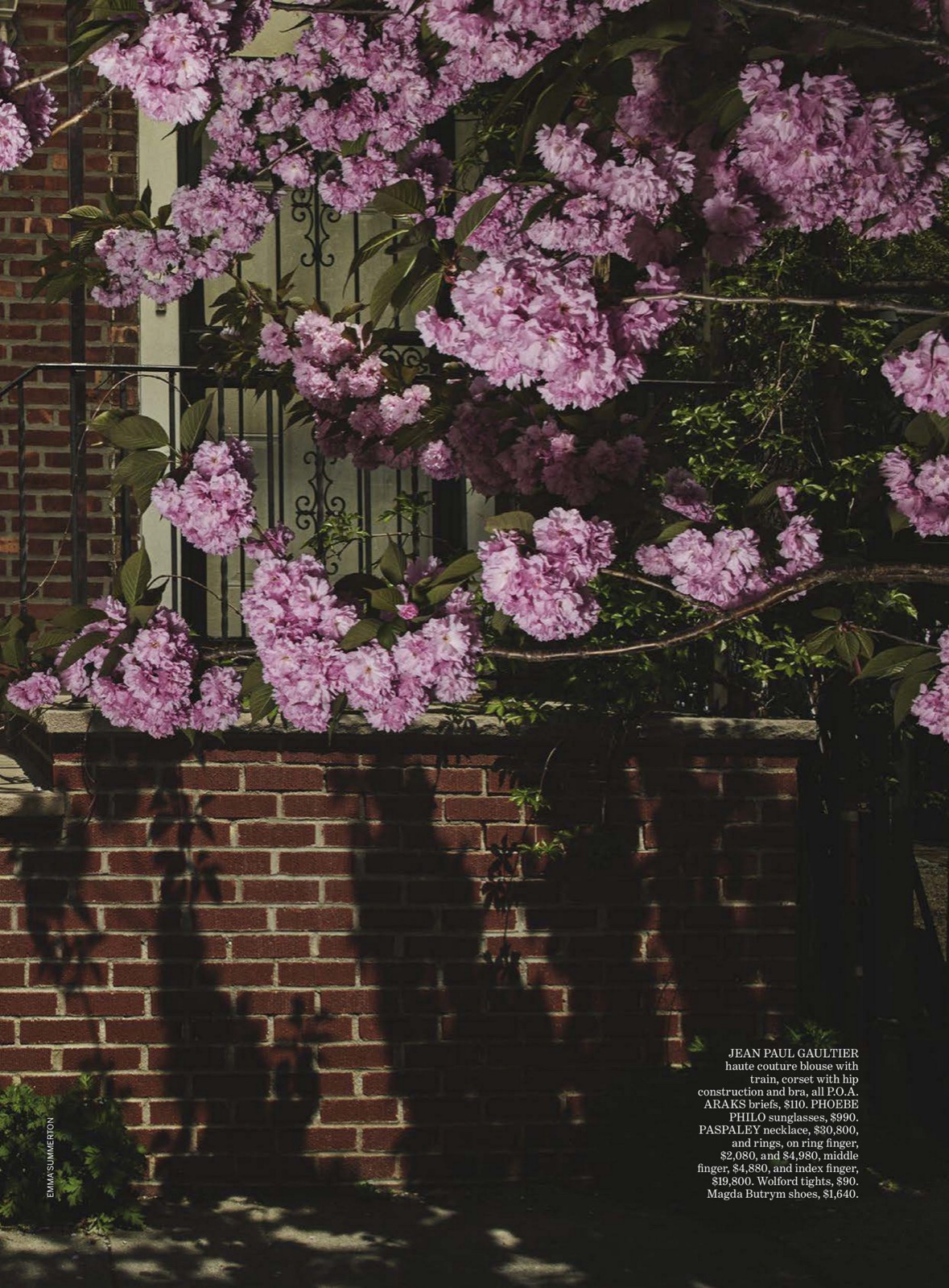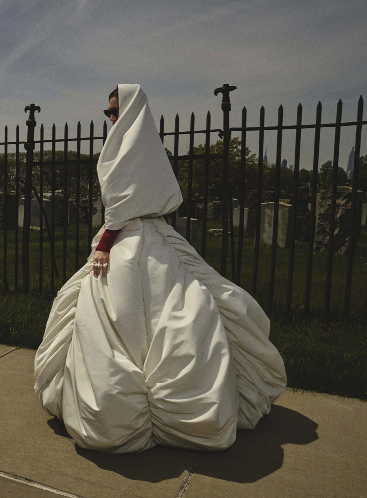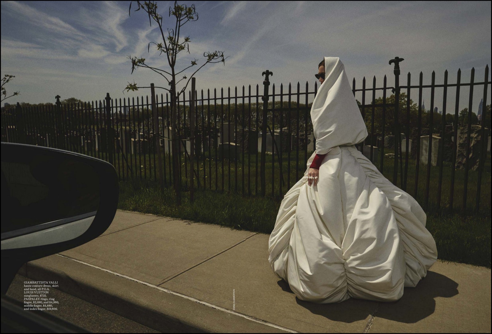 Entre sa robe blanche à fleurs XXL qui semble prête à décoller et ses perles dignes d’une princesse, elle nous fait rêver de mariage… ou de jardin botanique !