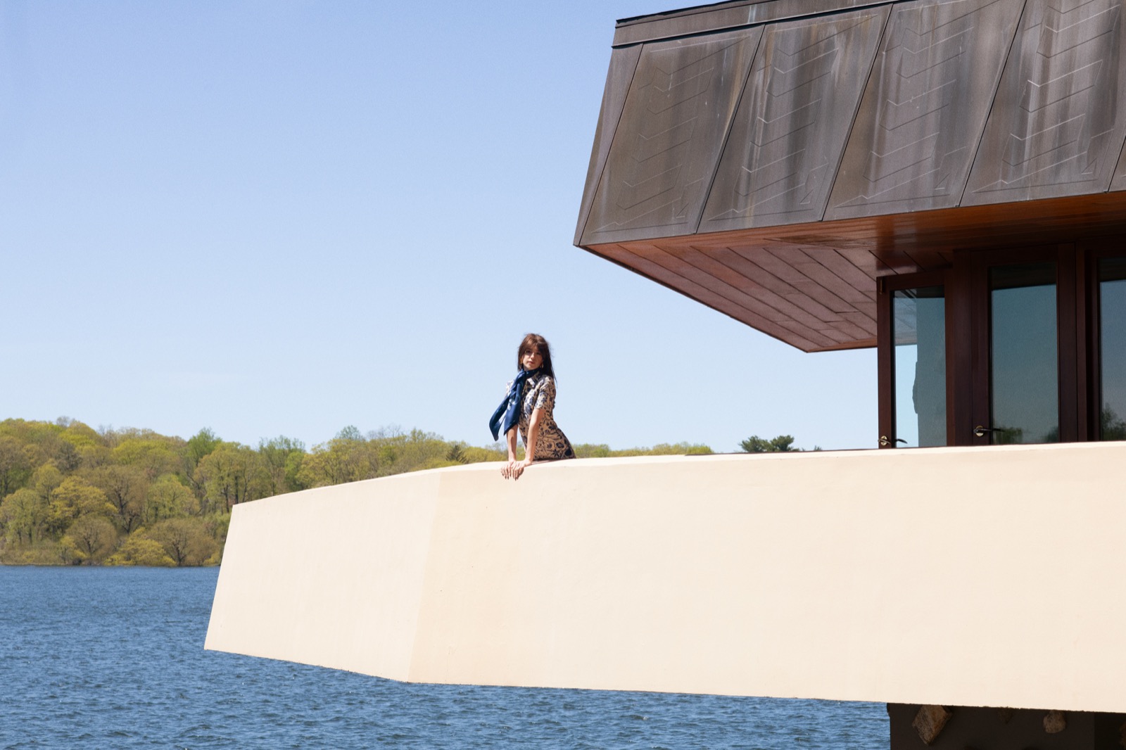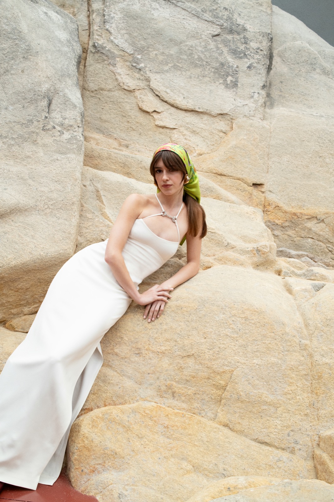 Assise sur un rocher ou au bord d’un lac, elle pose avec une nonchalance étudiée, prête à dompter la nature avec son foulard chic.