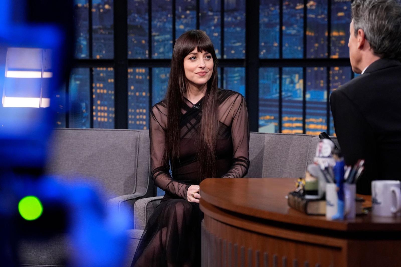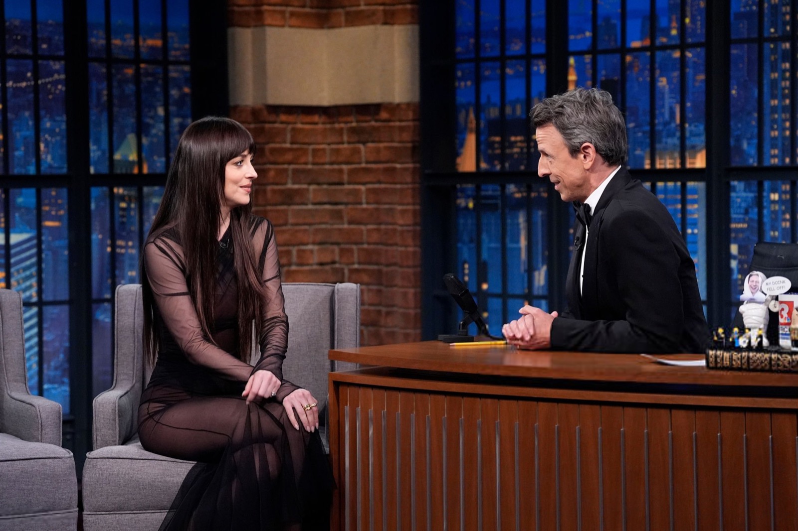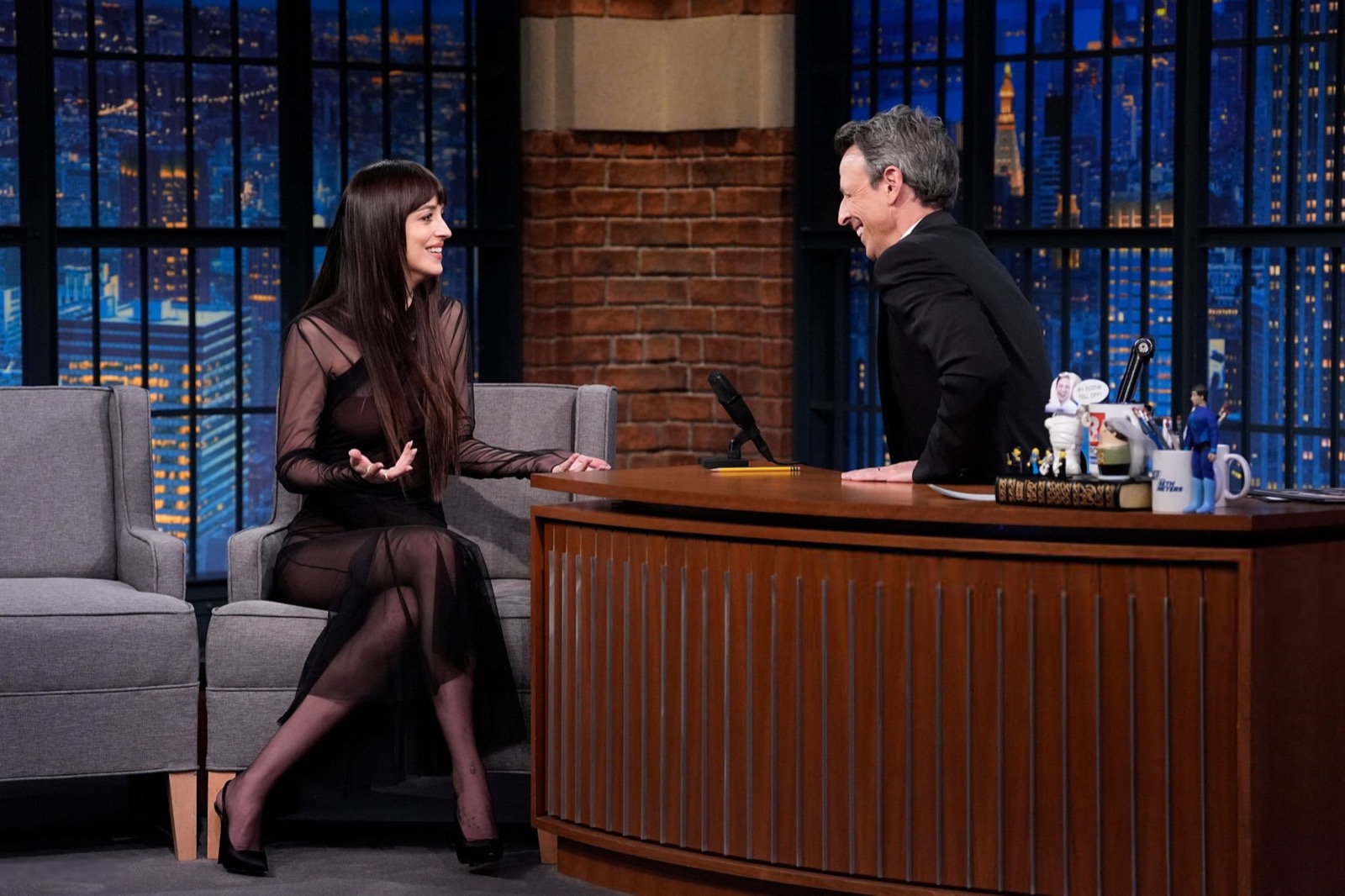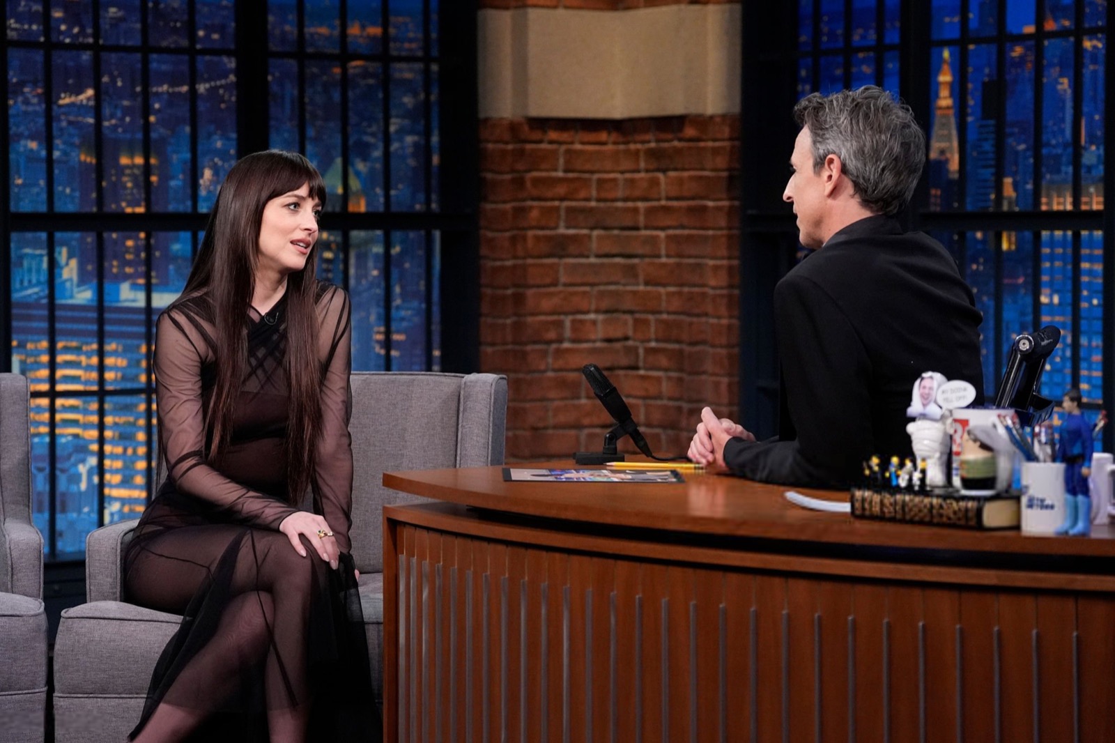 Regardez-moi cette Dakota Johnson, venue hypnotiser Seth Meyers avec une robe si transparente qu’on se demande si elle a oublié de s’habiller !