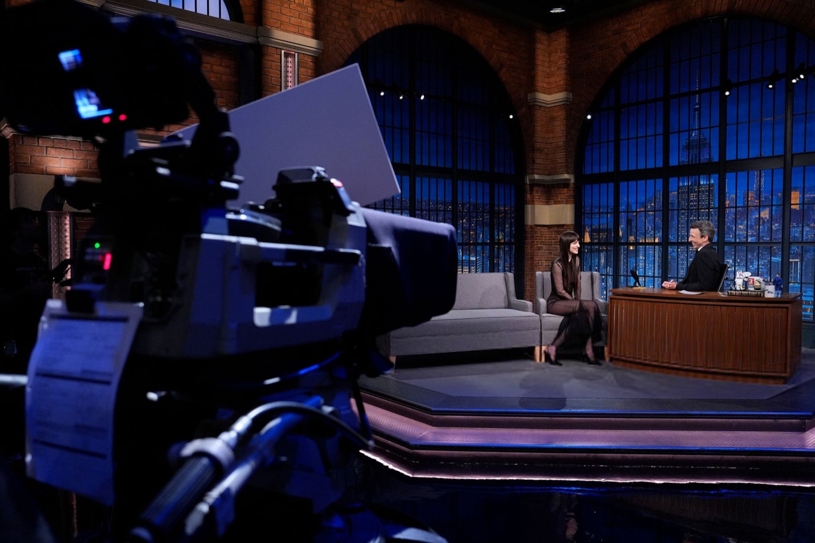 Sur le plateau de Late Night, elle joue les mystérieuses avec ses cheveux de sirène, pendant que Seth tente de garder son sérieux face à ce look audacieux.