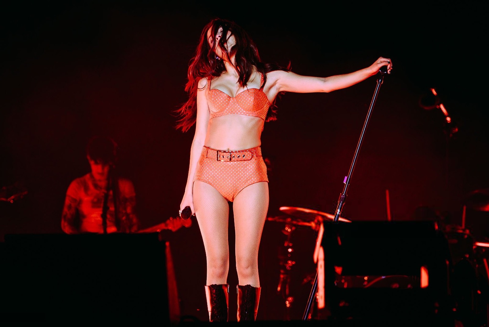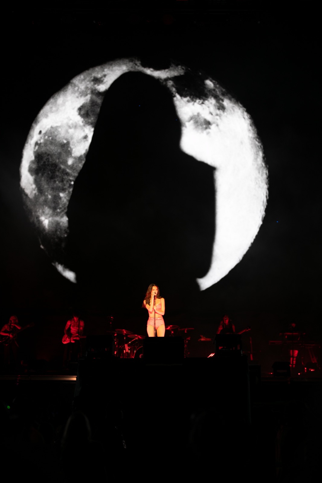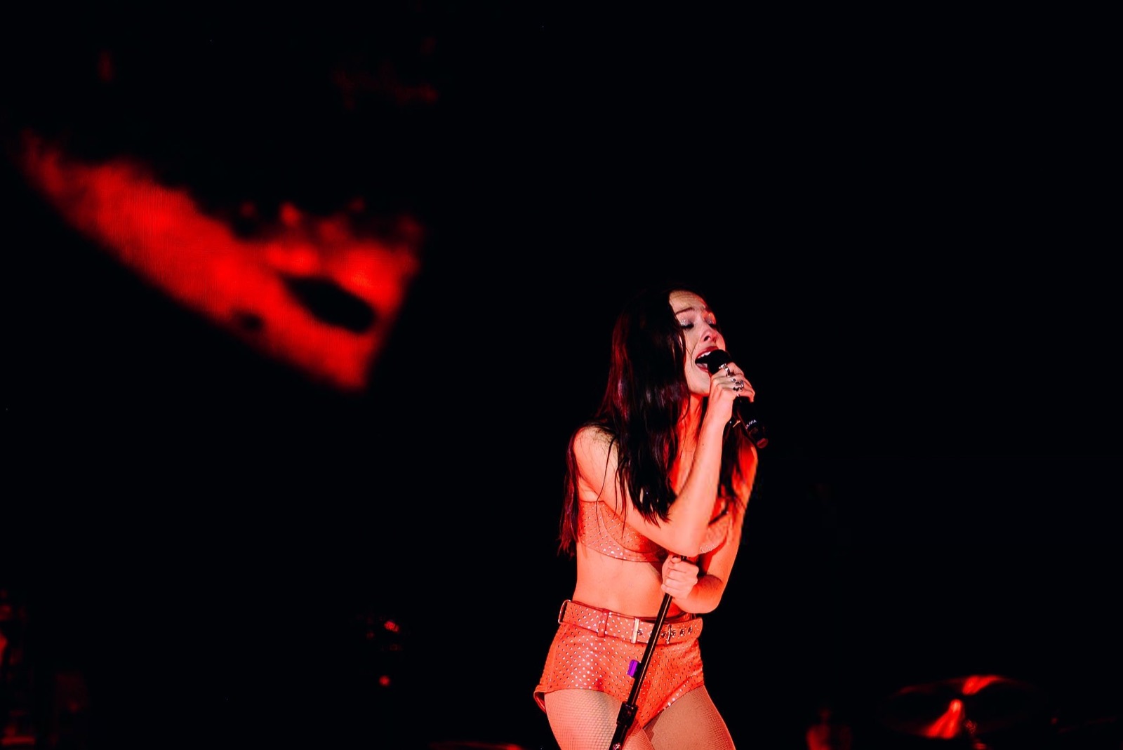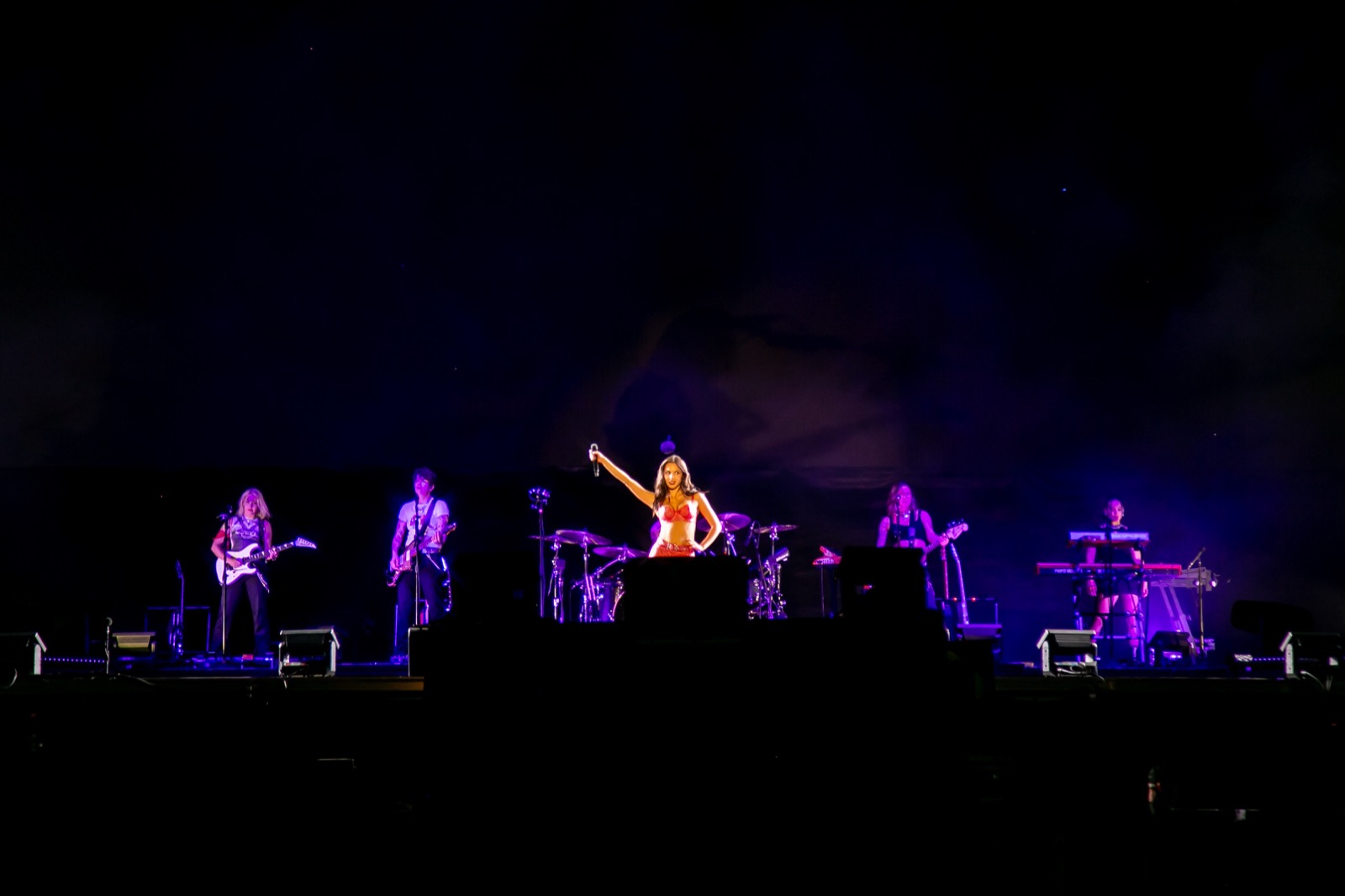 Entre ses poses de rockstar et ce micro qu’elle domine, elle a clairement décidé de faire fondre la foule sous les lumières violettes.