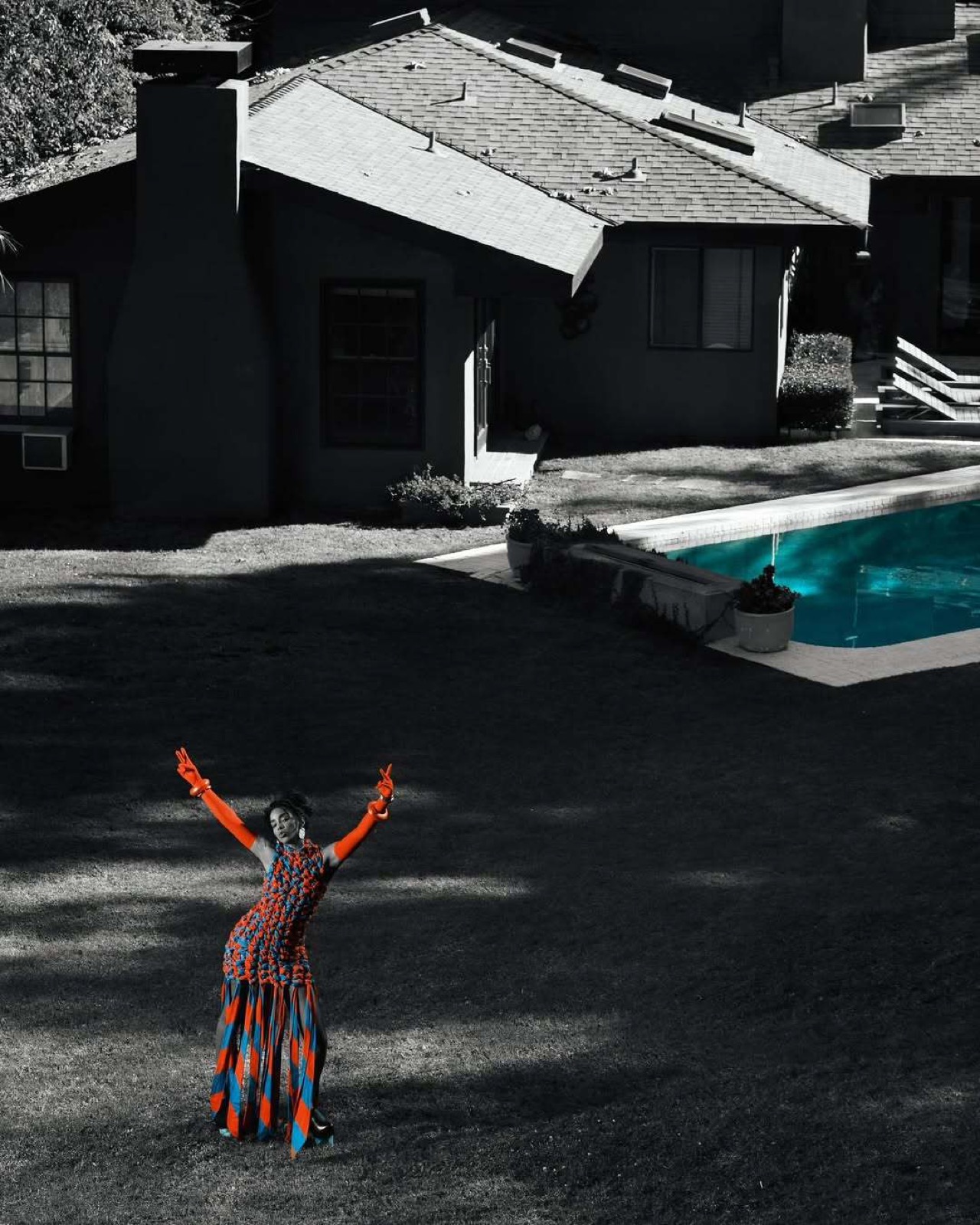 Entre sa robe orange dramatique et son look bleu vintage, elle nous fait croire qu’elle a échappé à un shooting de film hollywoodien.