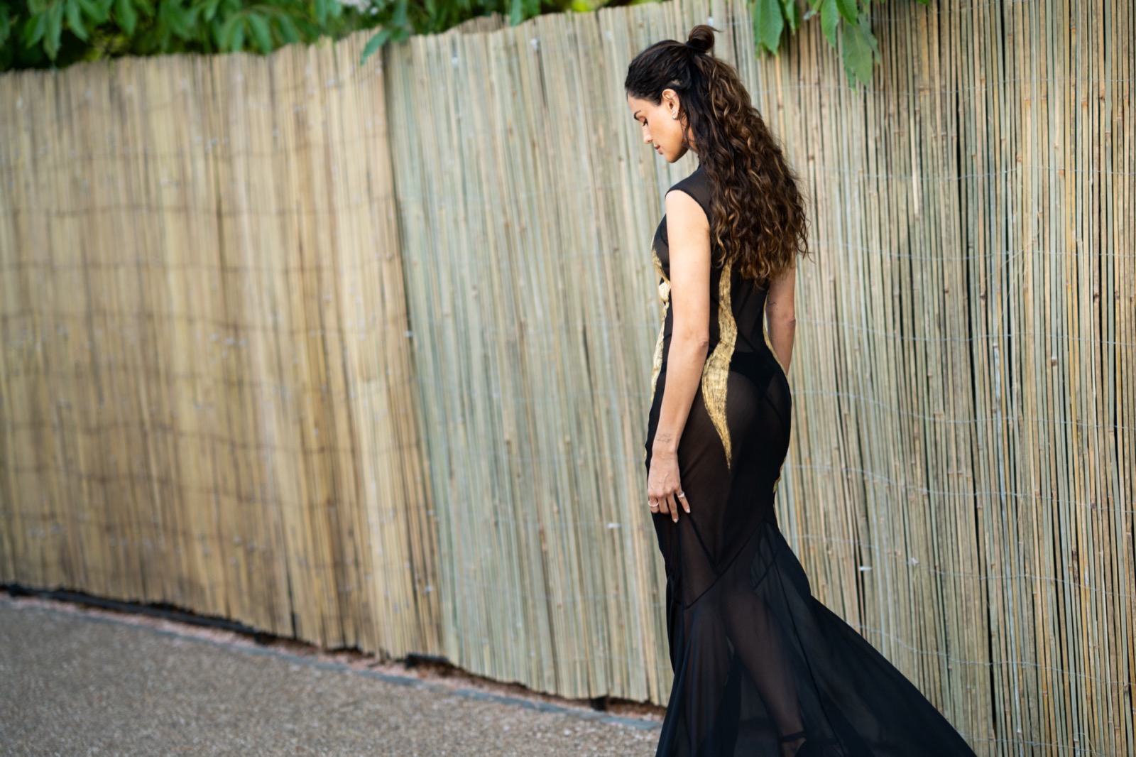 Sa robe transparente à dorures dorées ressemble à un rideau de douche chic qu’elle aurait piqué à une boutique de déguisements. Avec ses talons plateforme, elle défile comme sur un podium de cirque, prête à trébucher avec grâce !