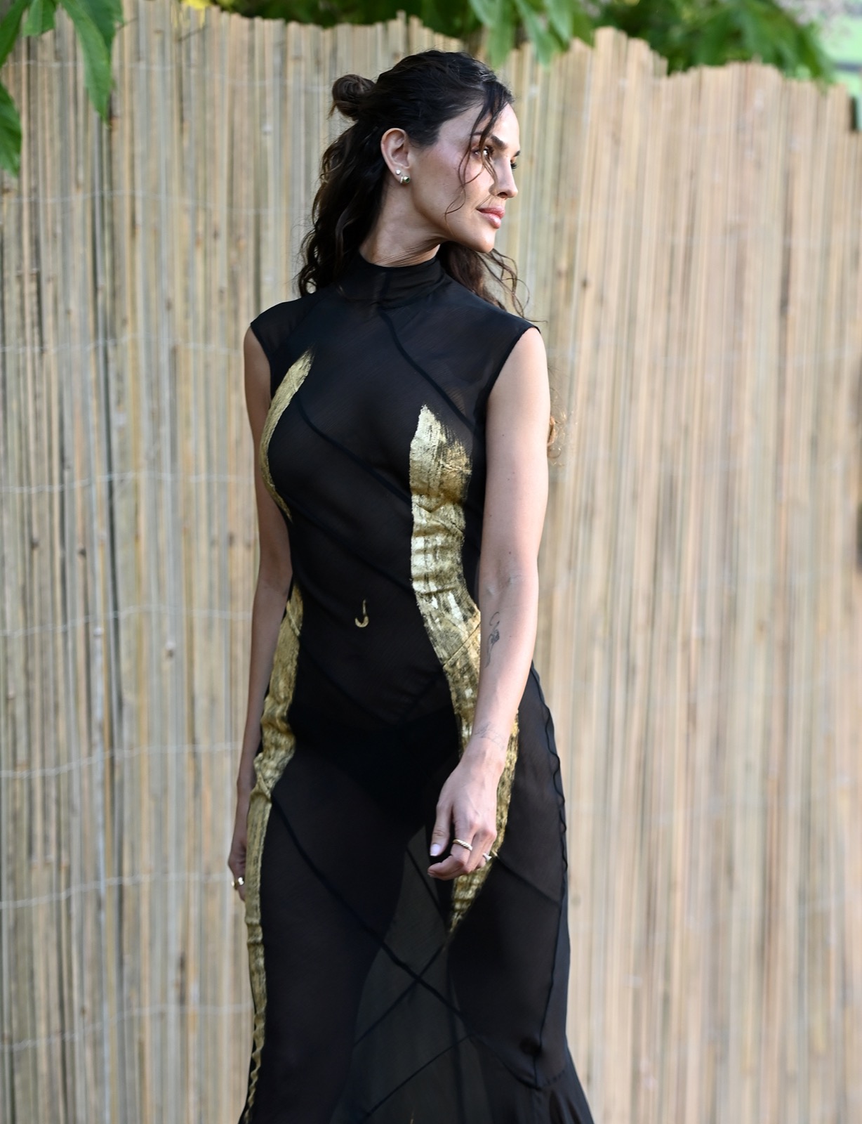Elle tente de briller comme une statue antique, mais on dirait plutôt une star de comédie perdue dans une fête de jardin hilarante. Allez Eiza, fais-nous rire avec ce look décalé !