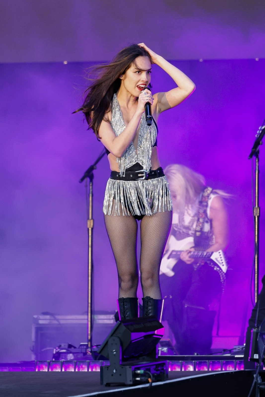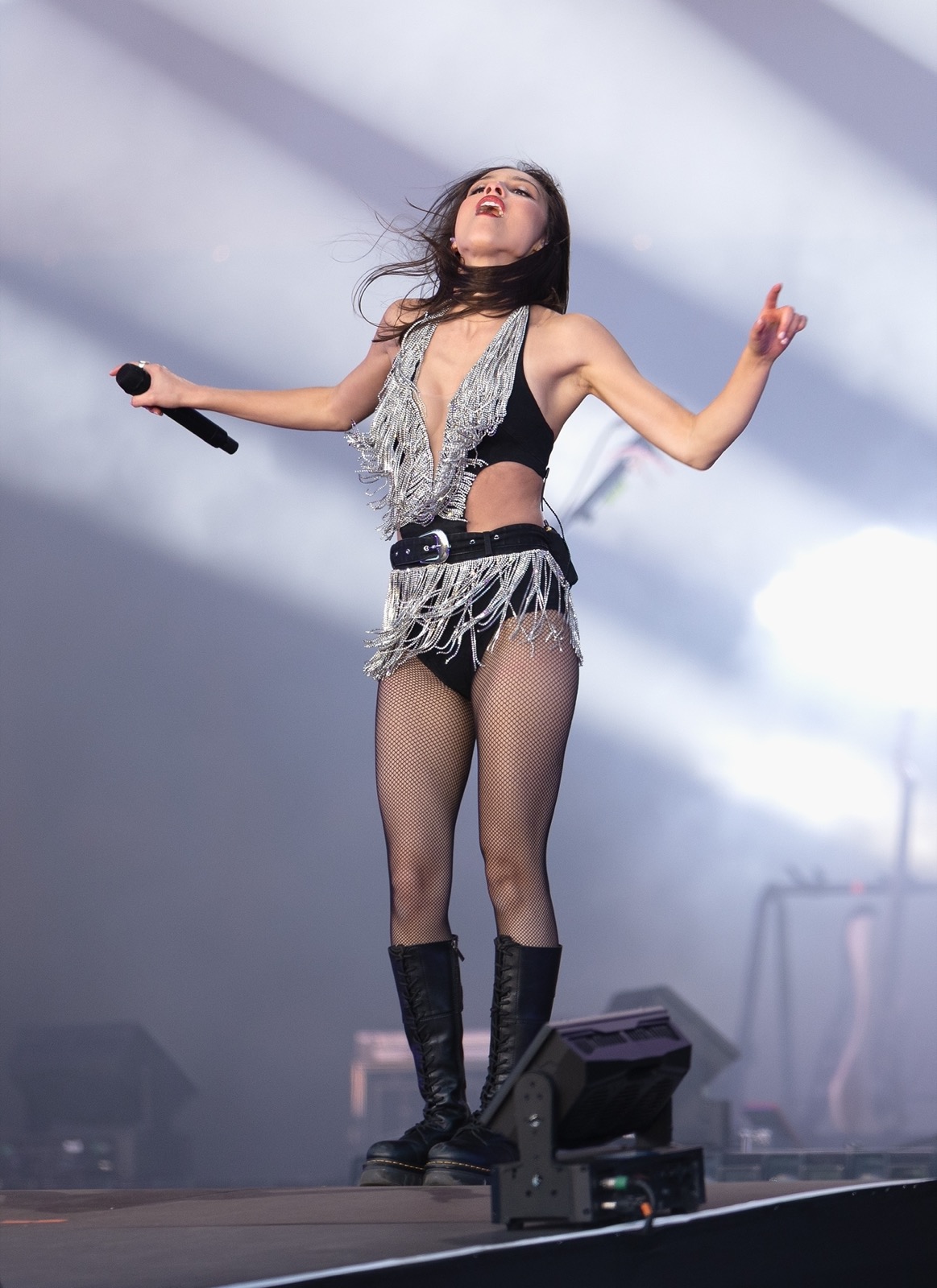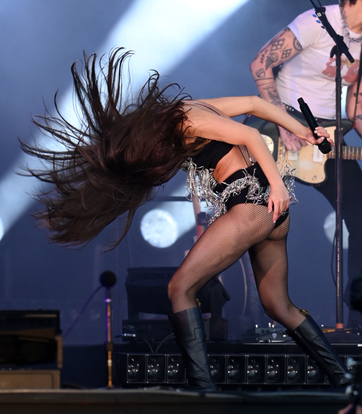 Sur scène, elle dégaine un top noir déchiré et un short ultra-court, comme si elle voulait rivaliser avec les feux d’artifice de l’été britannique.