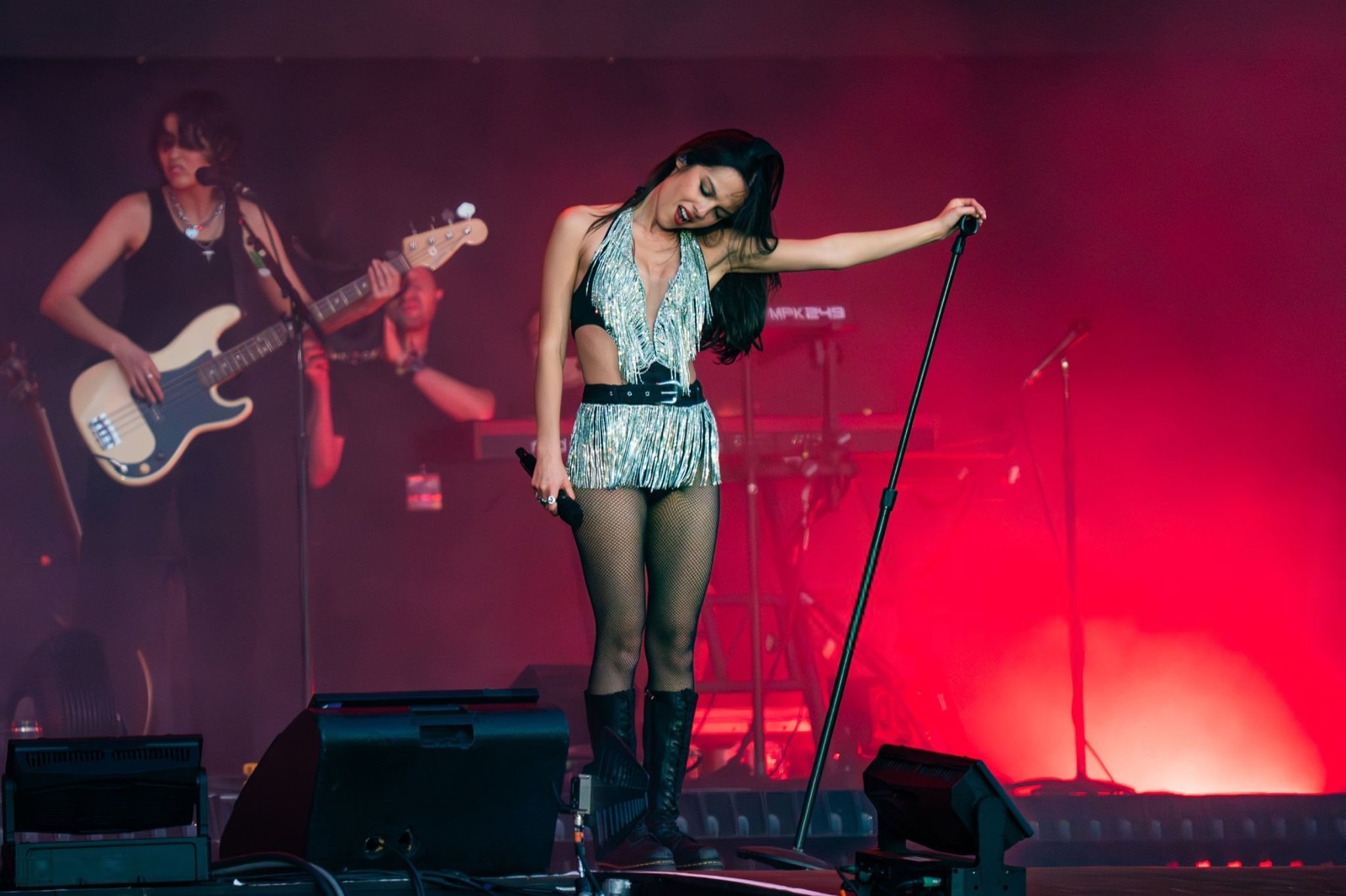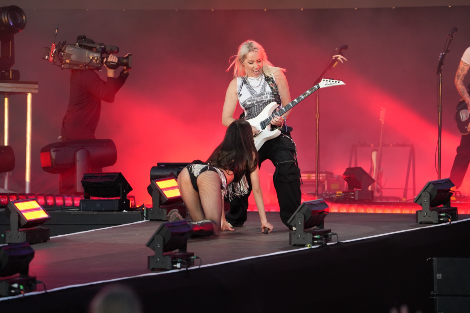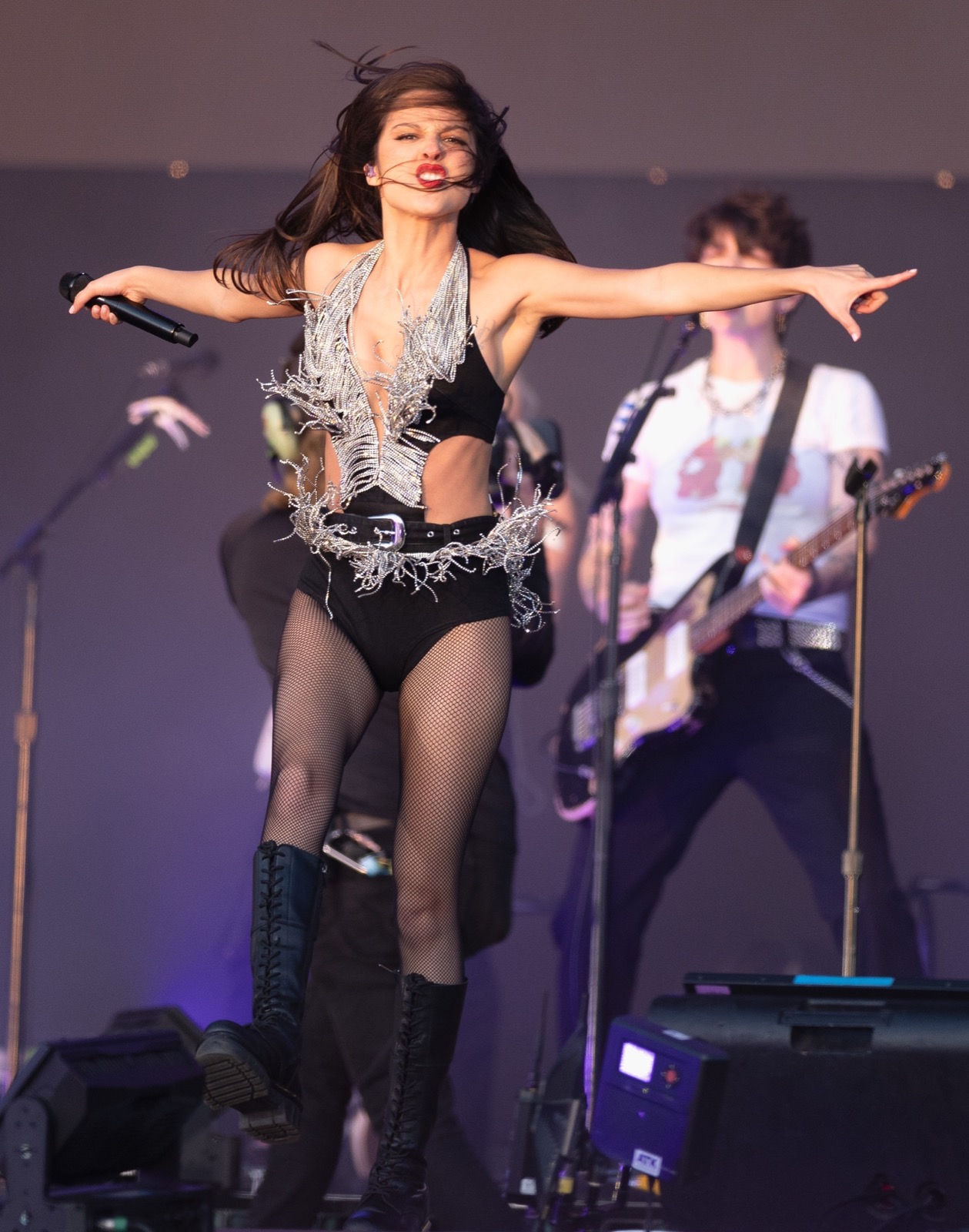 Sur scène, elle dégaine un top noir déchiré et un short ultra-court, comme si elle voulait rivaliser avec les feux d’artifice de l’été britannique.