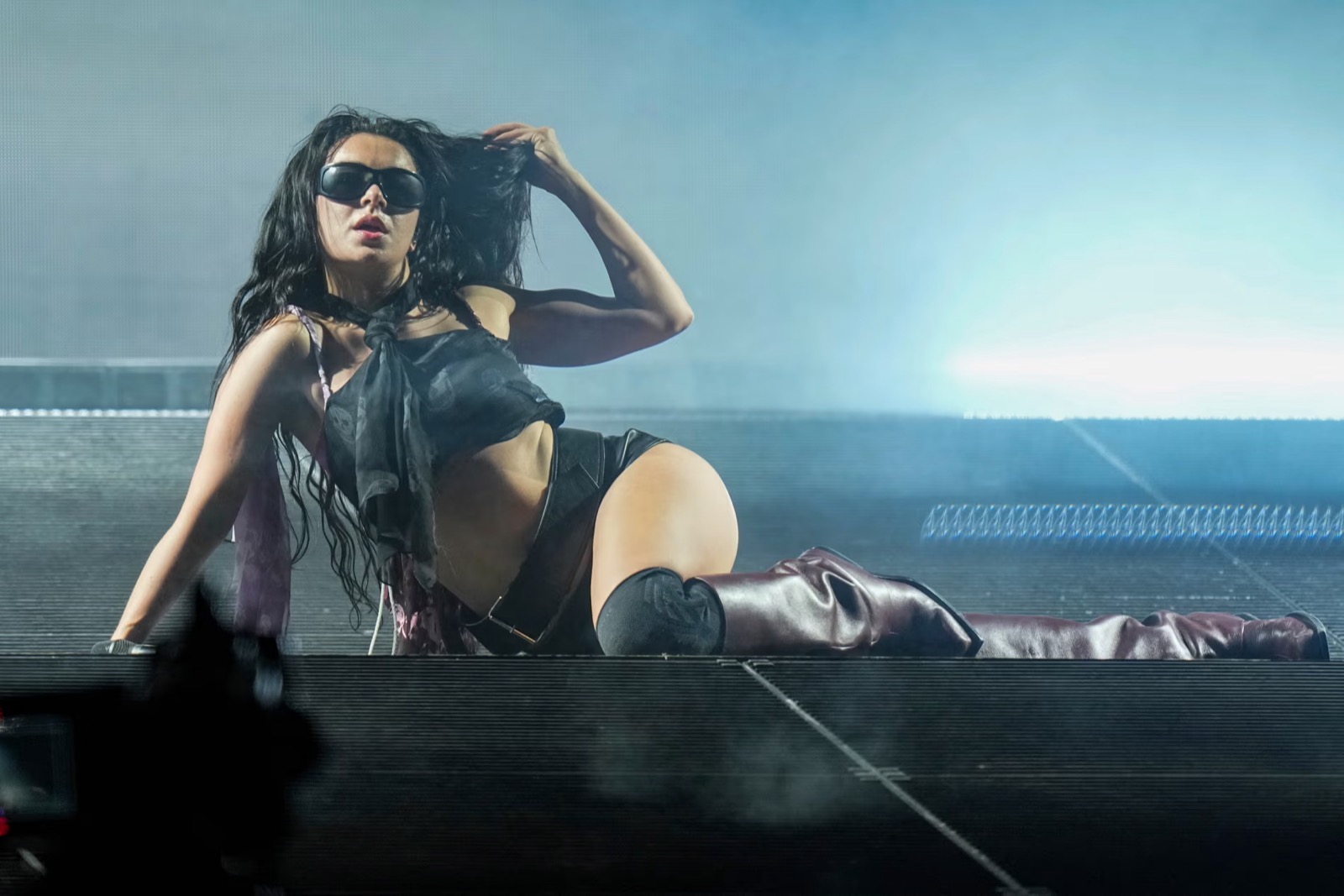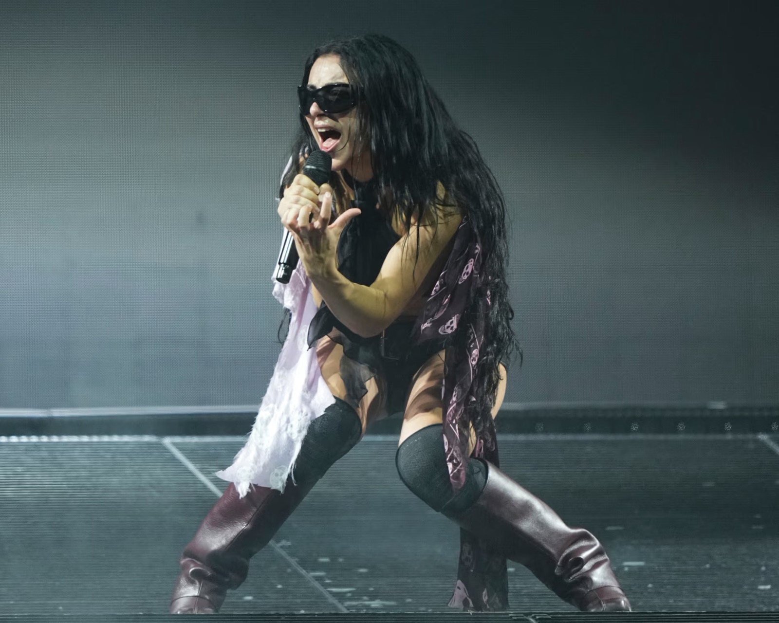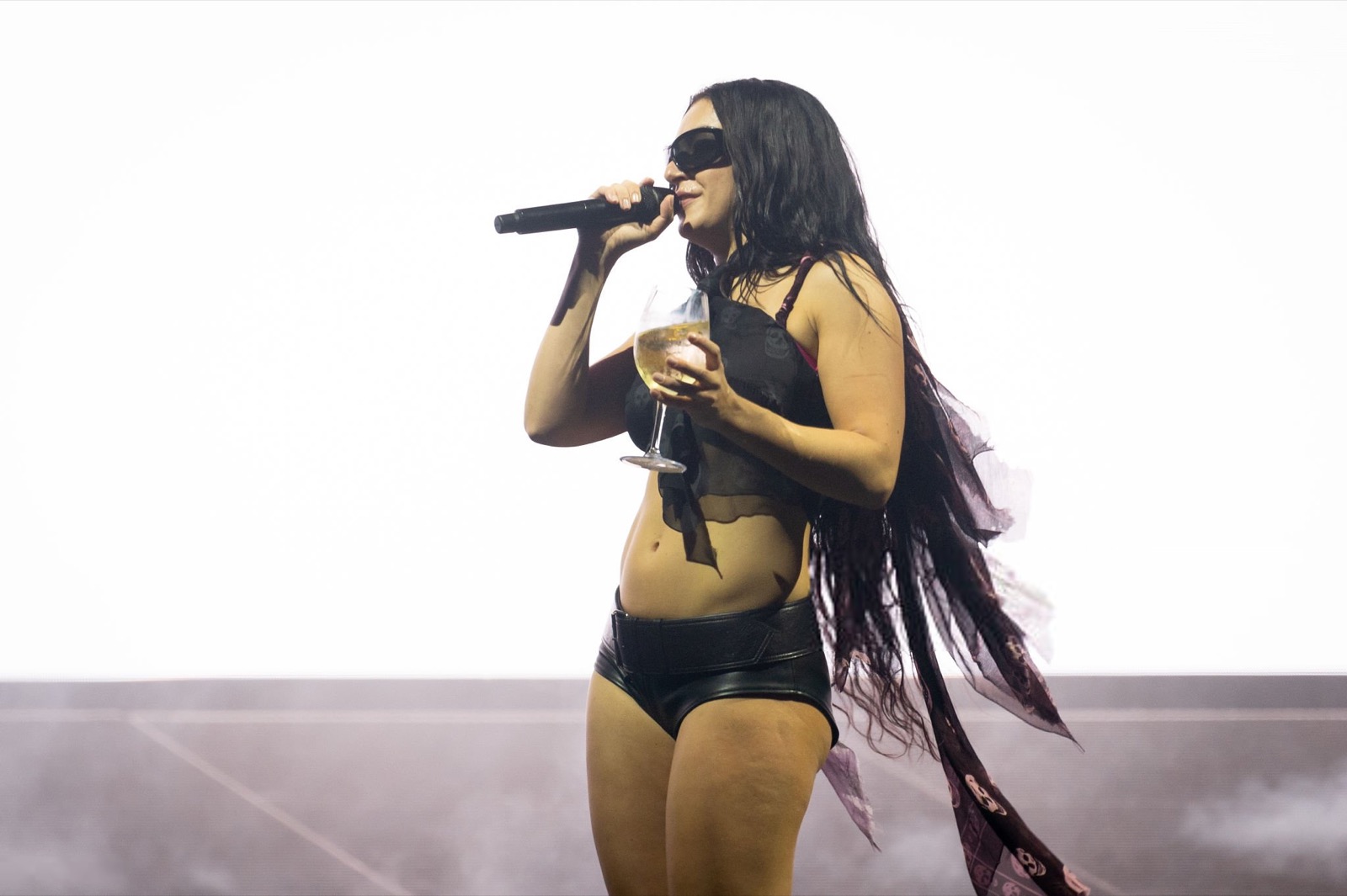 Charli XCX qui domine Glastonbury comme une reine du rock sombre ! Les lunettes de soleil et la cape flottante ajoutent une touche de mystère, comme si elle venait d’un film de science-fiction sexy.