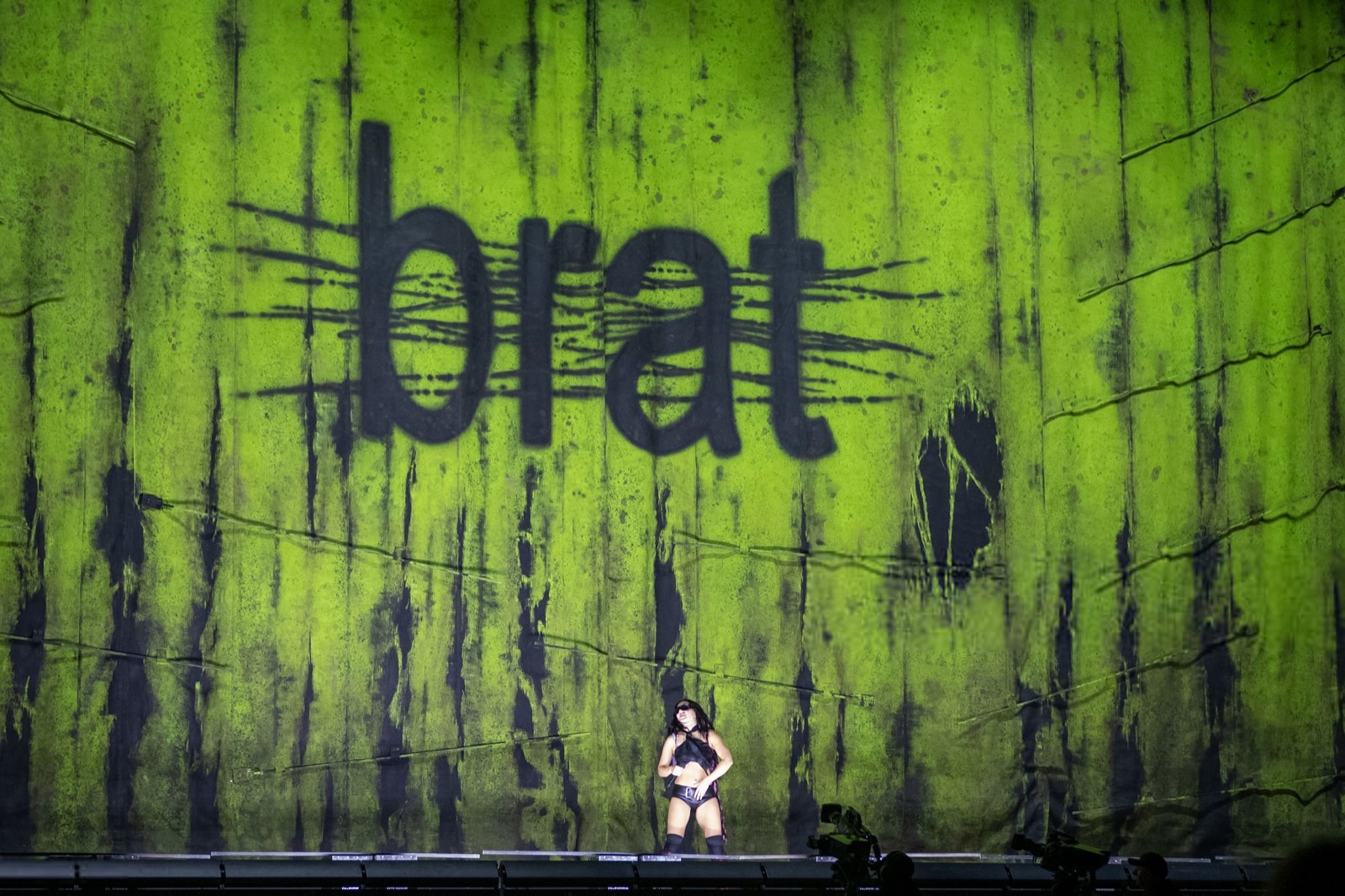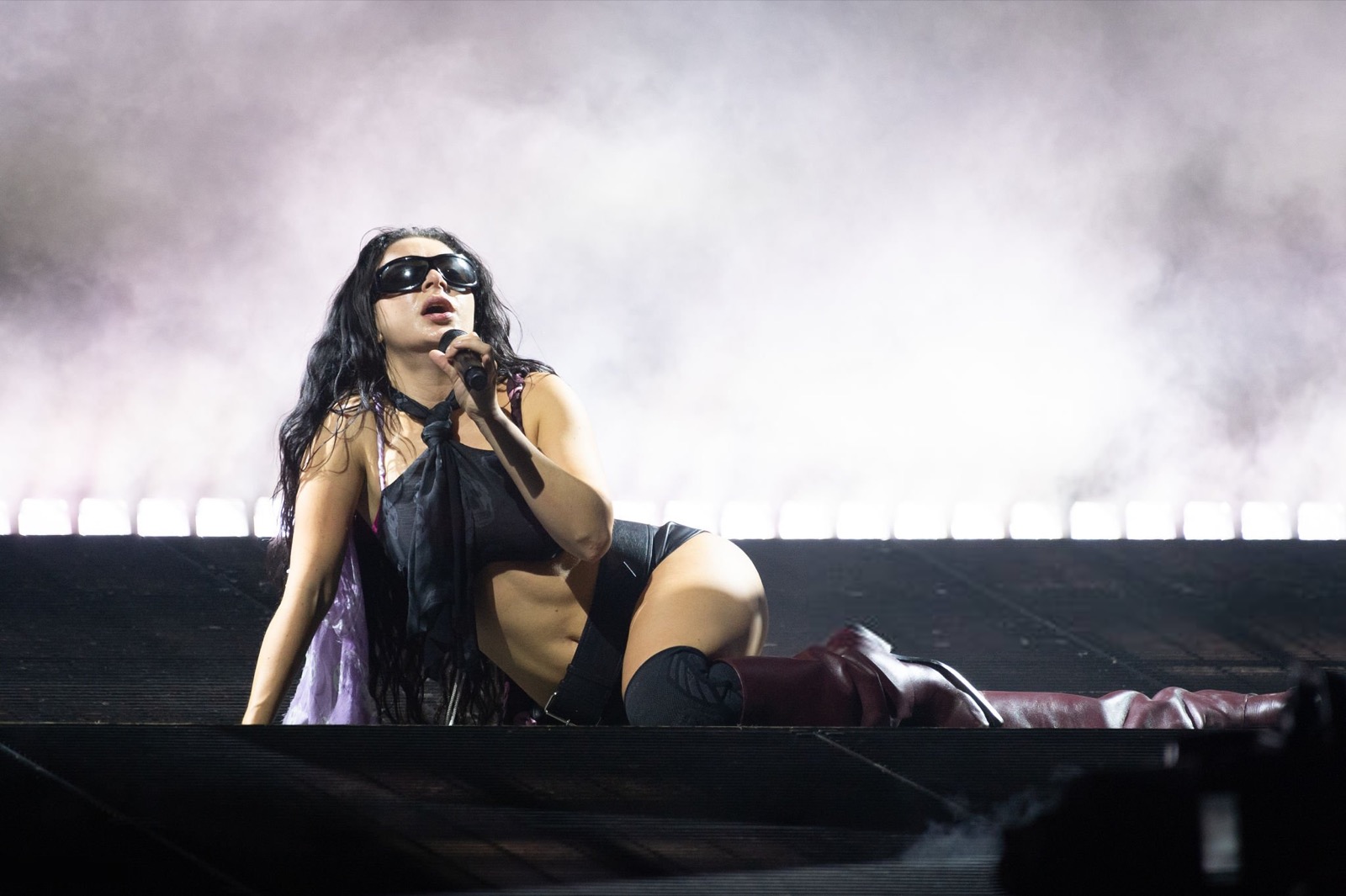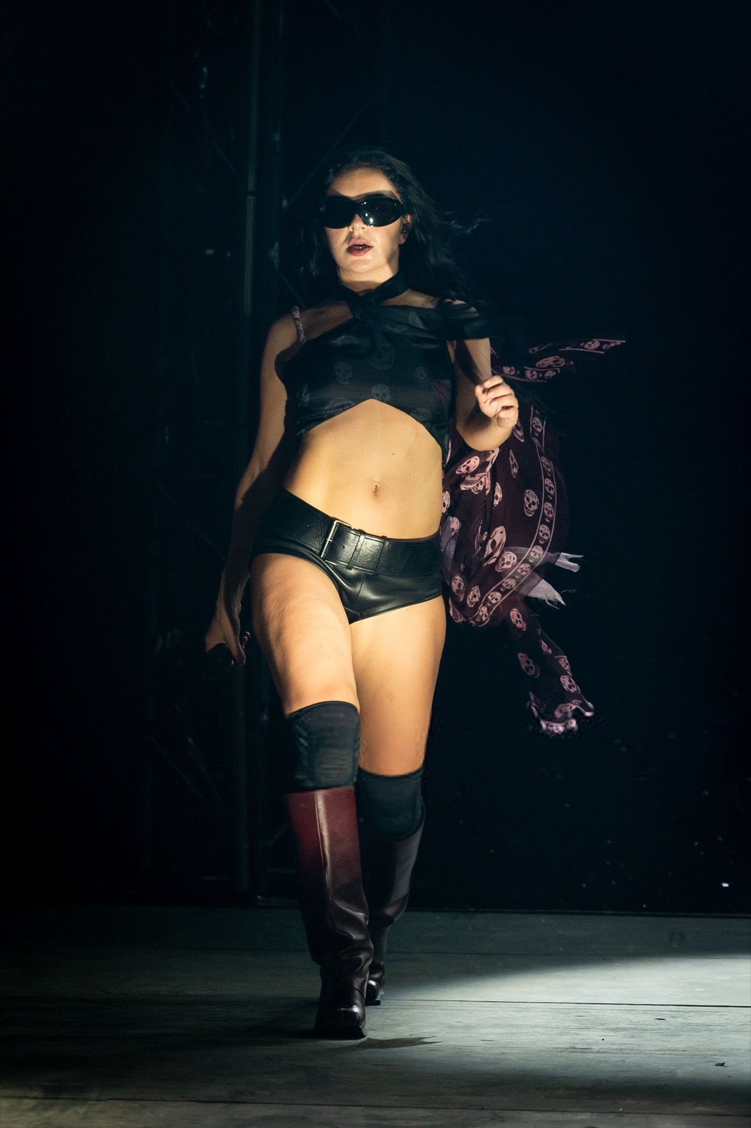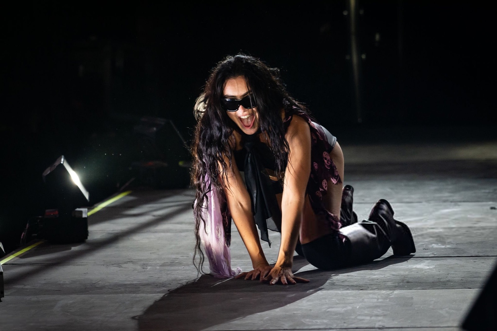 Charli XCX qui domine Glastonbury comme une reine du rock sombre ! Les lunettes de soleil et la cape flottante ajoutent une touche de mystère, comme si elle venait d’un film de science-fiction sexy.