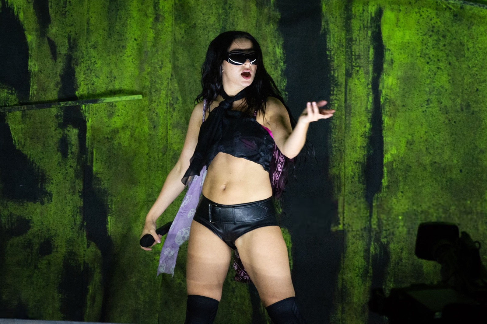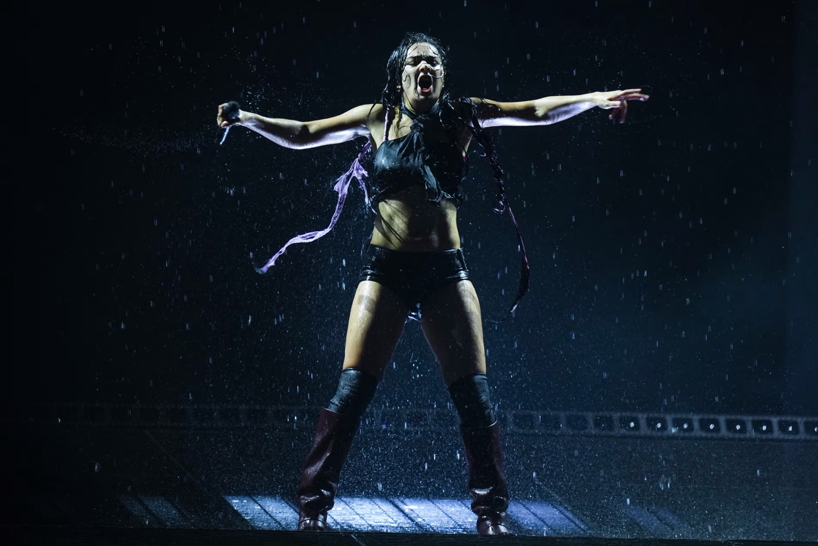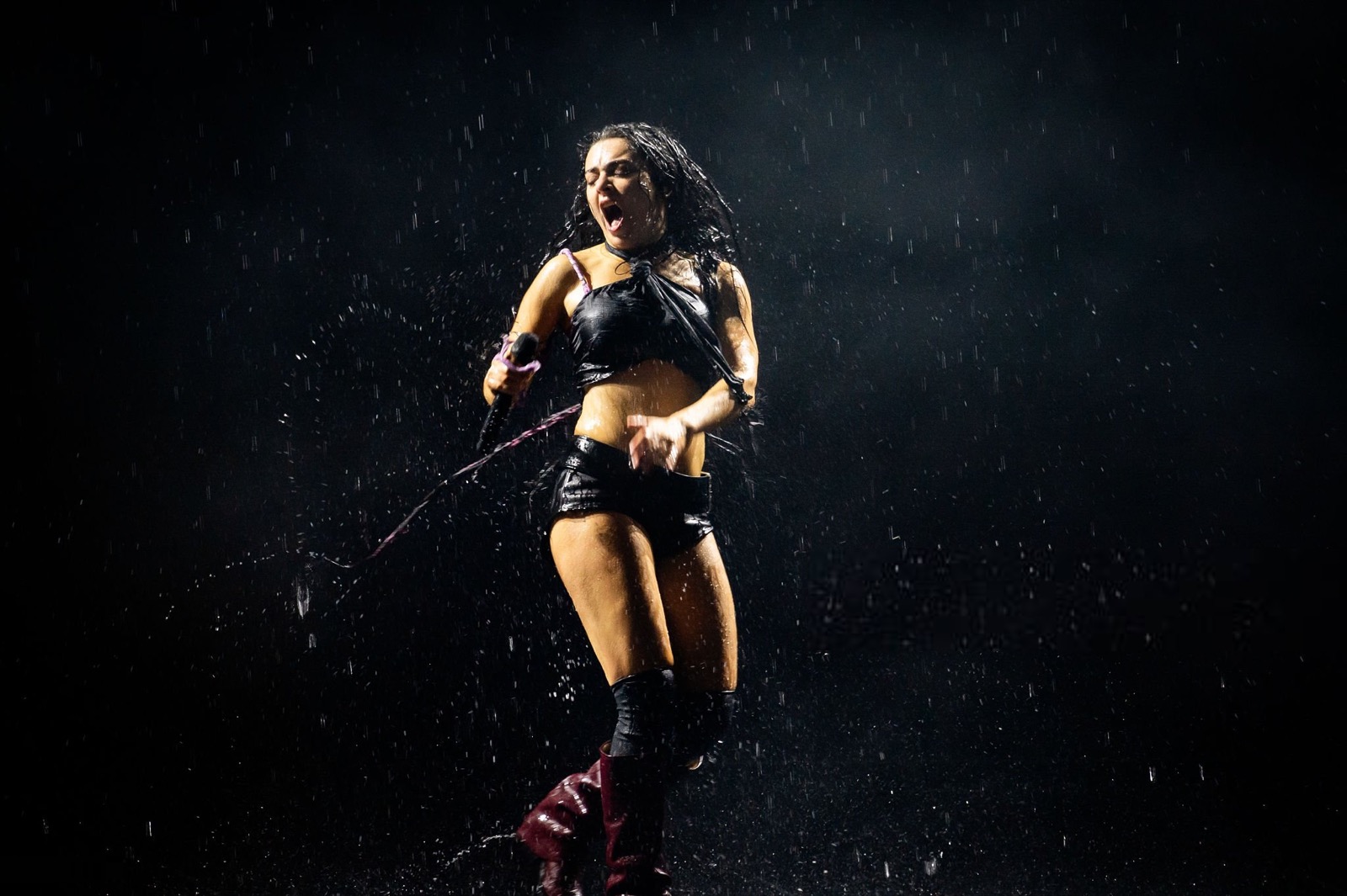 Entre son micro brandi comme une arme et sa tenue minimaliste en cuir, elle semble prête à conquérir le monde… ou à provoquer un scandale vestimentaire.