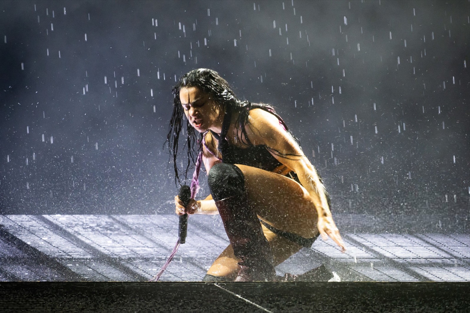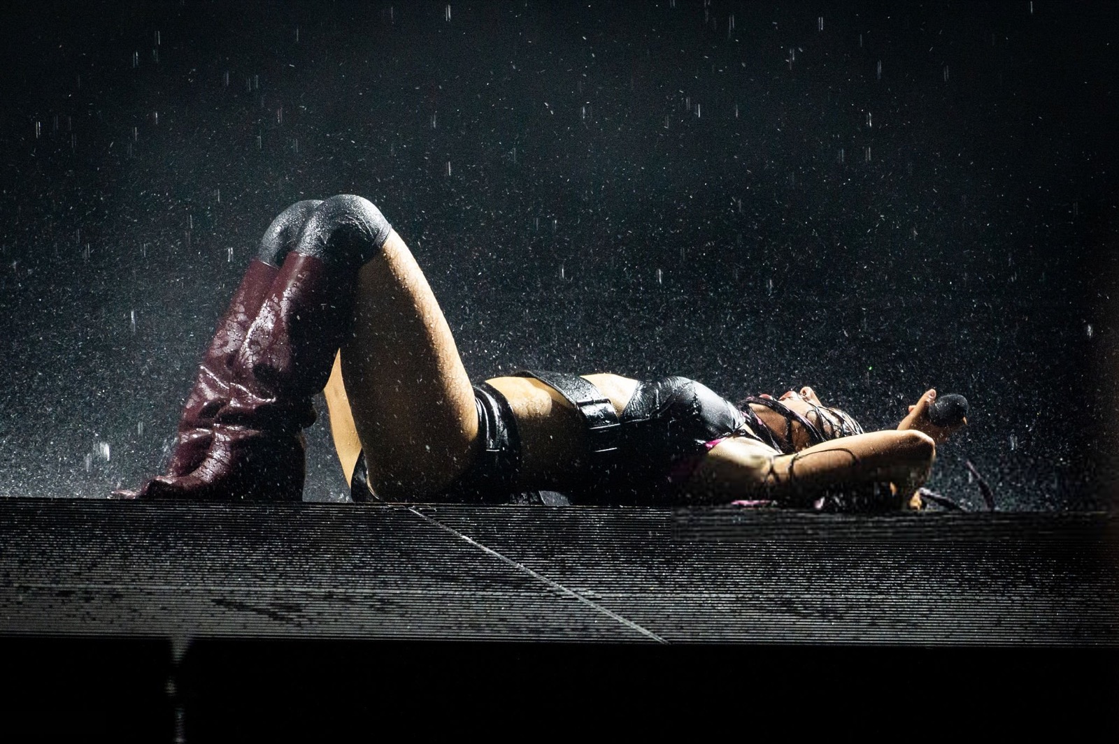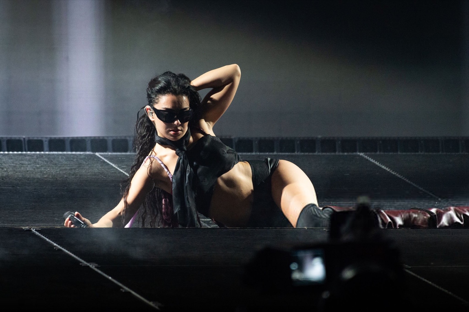 Entre son micro brandi comme une arme et sa tenue minimaliste en cuir, elle semble prête à conquérir le monde… ou à provoquer un scandale vestimentaire.