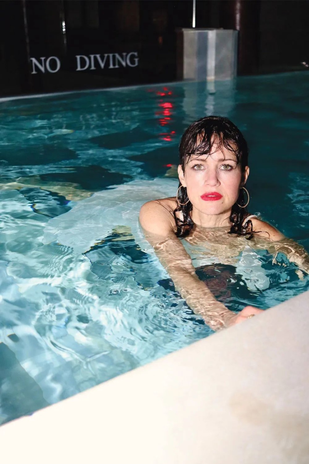 Carla Gugino qui se jette dans une piscine comme si c’était un tournage hollywoodien ! On dirait une héroïne de film d’horreur qui a décidé de pimenter son scénario avec un bain nocturne glamour.