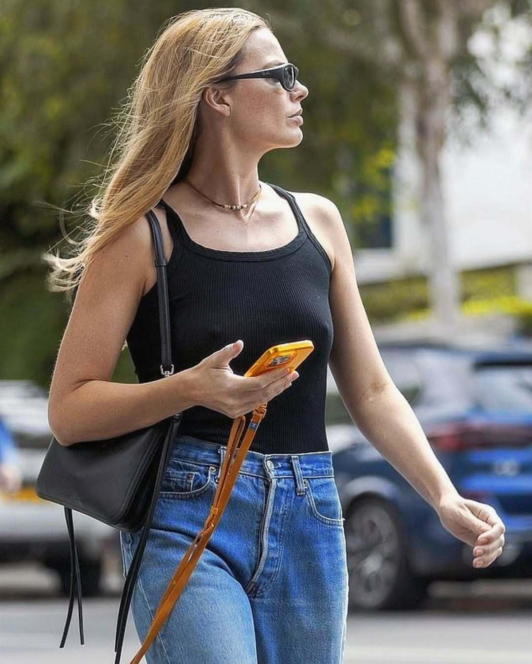 Entre son haut noir moulant et son jean oversized, elle nous donne une leçon de mode tout en scrollant sur son téléphone orange – parce que, bien sûr, elle doit rester connectée au monde pendant qu’on l’admire.