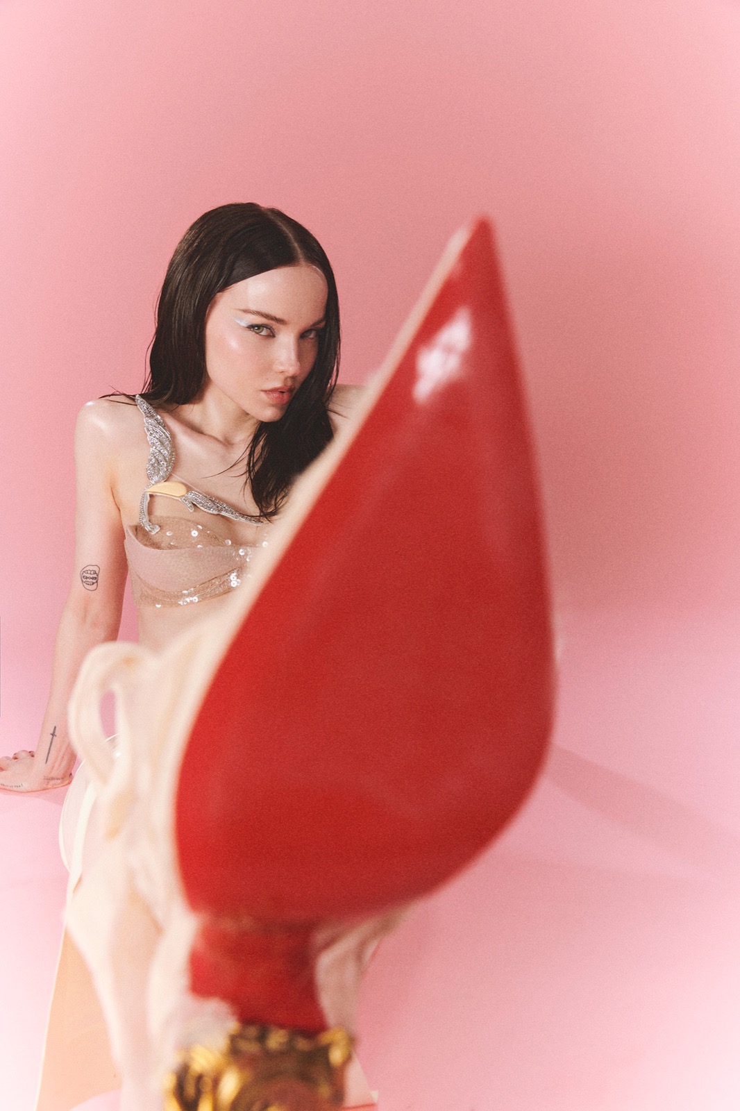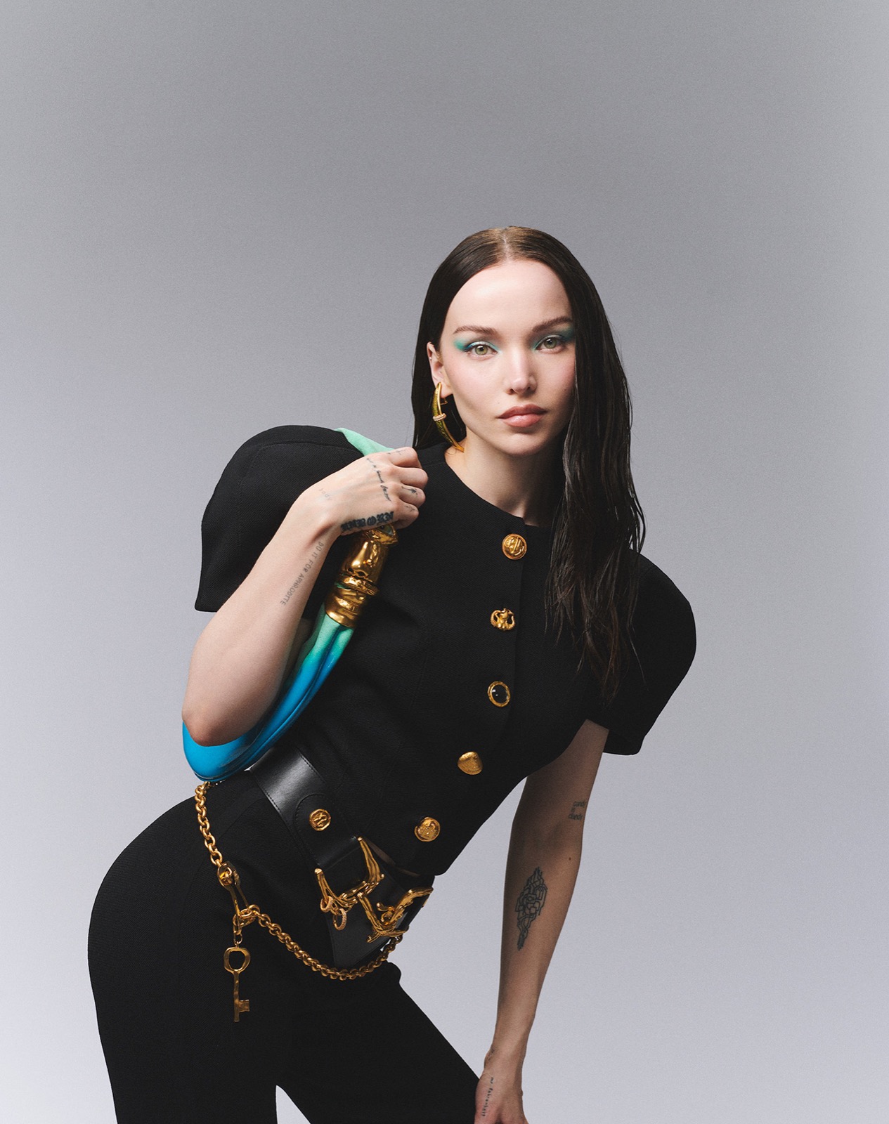Dove Cameron, qui pose comme une déesse punk pour Marie Claire UK ! Entre sa robe noire bardée de boutons dorés et son sac fluo qui hurle les années 80, elle semble dire : « Je suis une œuvre d’art, admirez-moi ! »