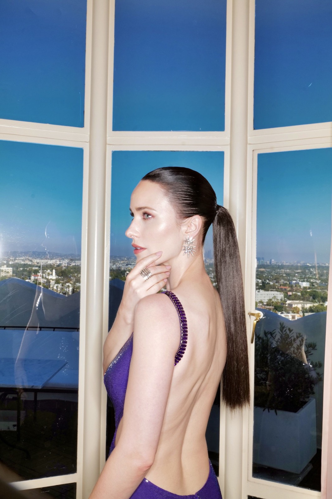 Rachel Brosnahan en couverture de Harper's Bazaar, perchée sur un toit comme une diva aérienne ! Cette robe violette scintillante, avec son dos nu audacieux, hurle "regardez-moi dominer la ville" – ou peut-être juste "je vais tomber si je bouge" !
