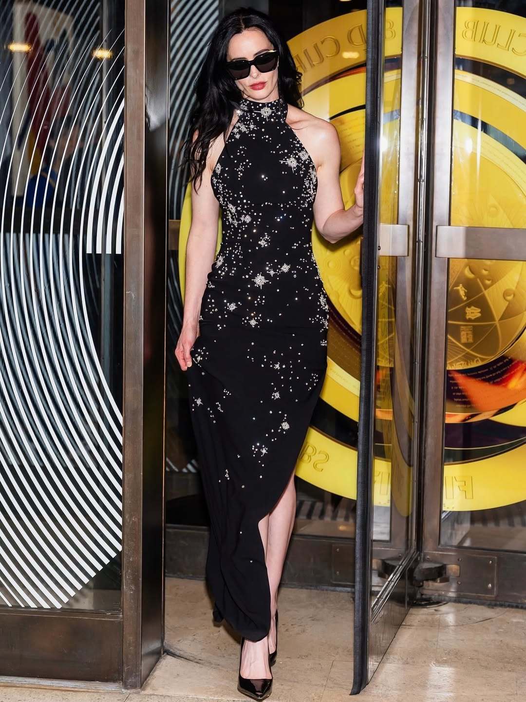 Avec sa robe noire constellée de strass, on dirait une galaxie ambulante, prête à éblouir Hollywood… ou du moins les photographes affamés de glamour.