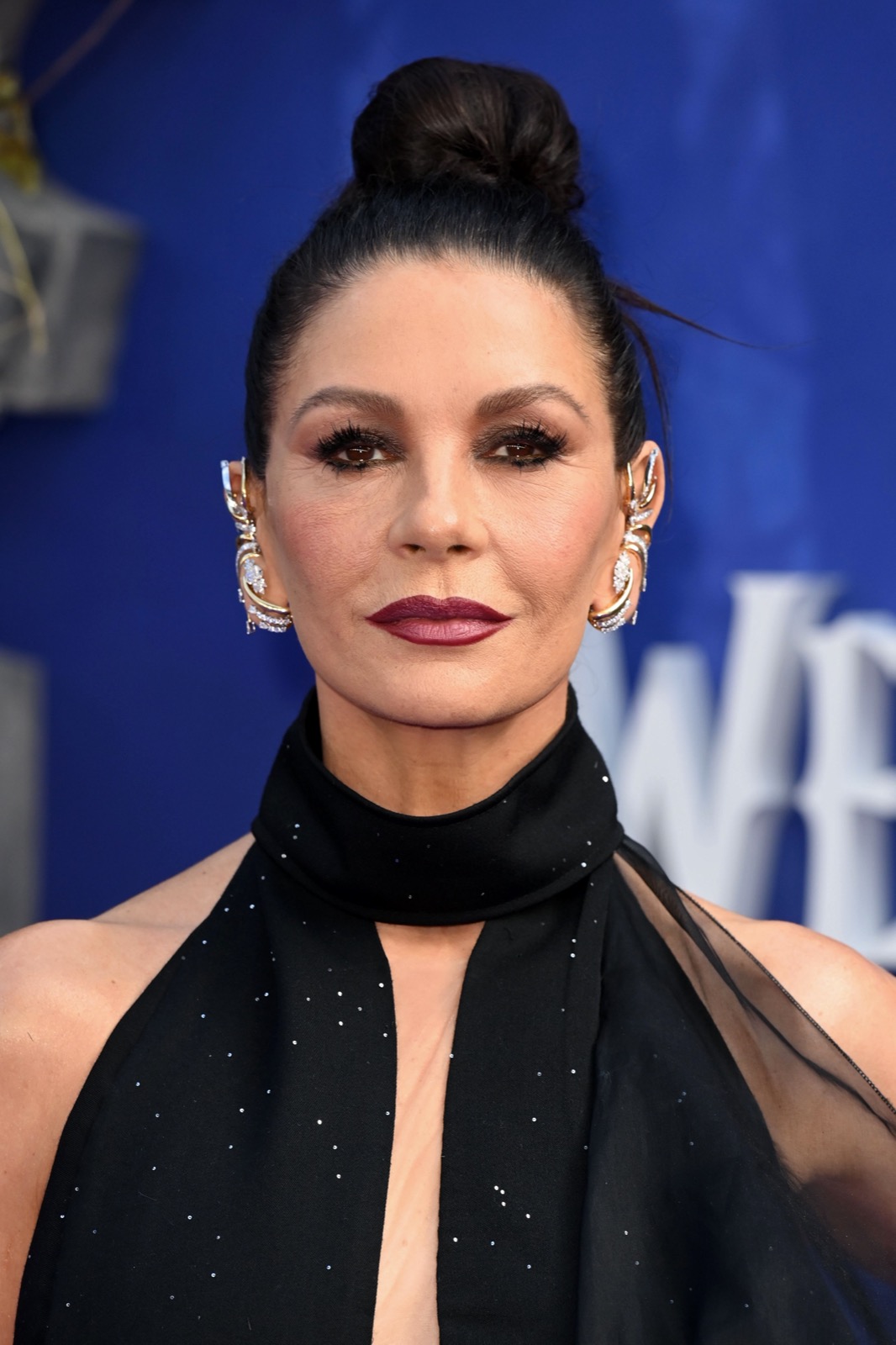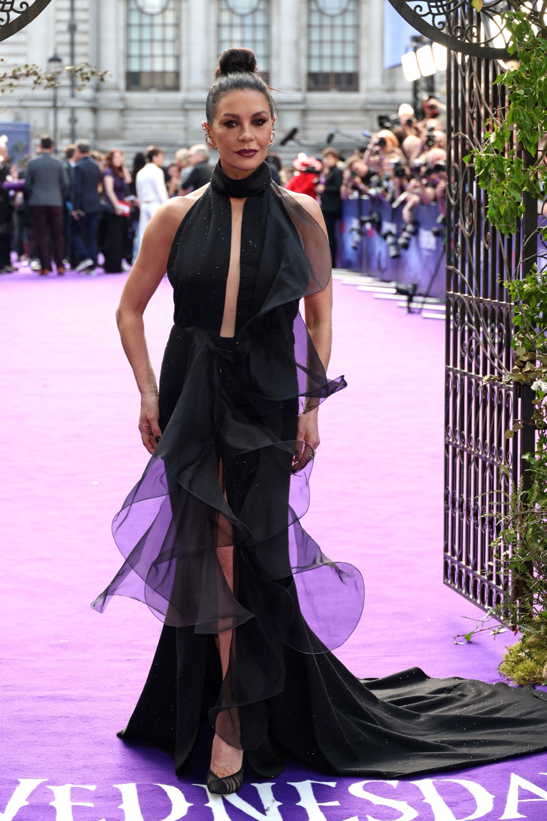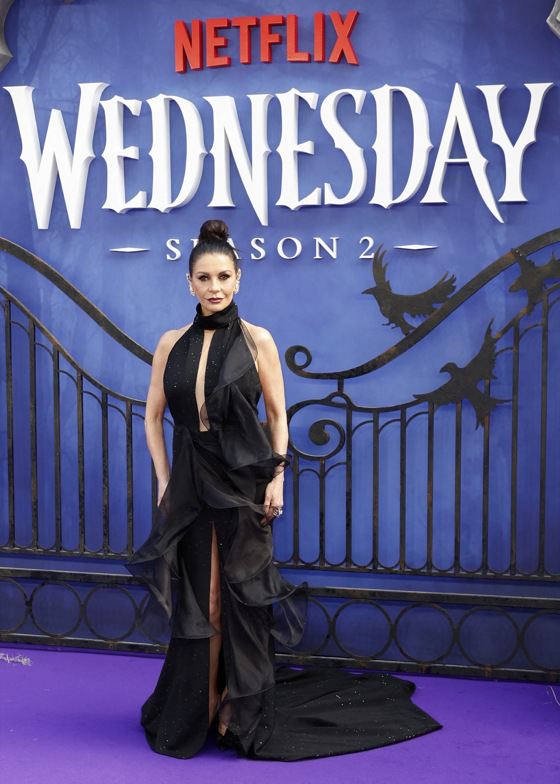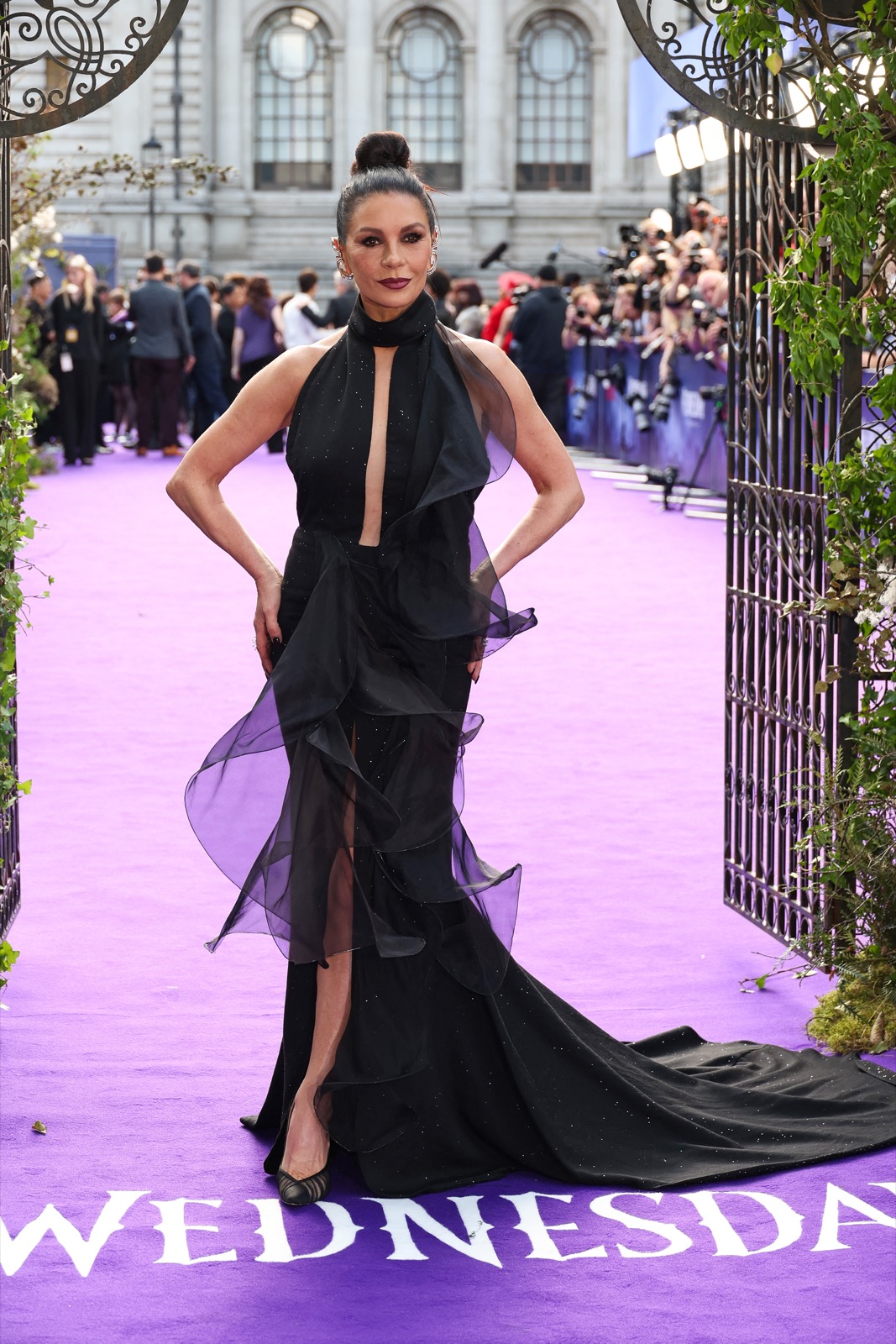 Catherine Zeta-Jones sur le tapis violet de Wednesday, c’est un peu comme si Morticia Addams avait rendez-vous chez un couturier haute couture… mais avait oublié sa cape dans la voiture.