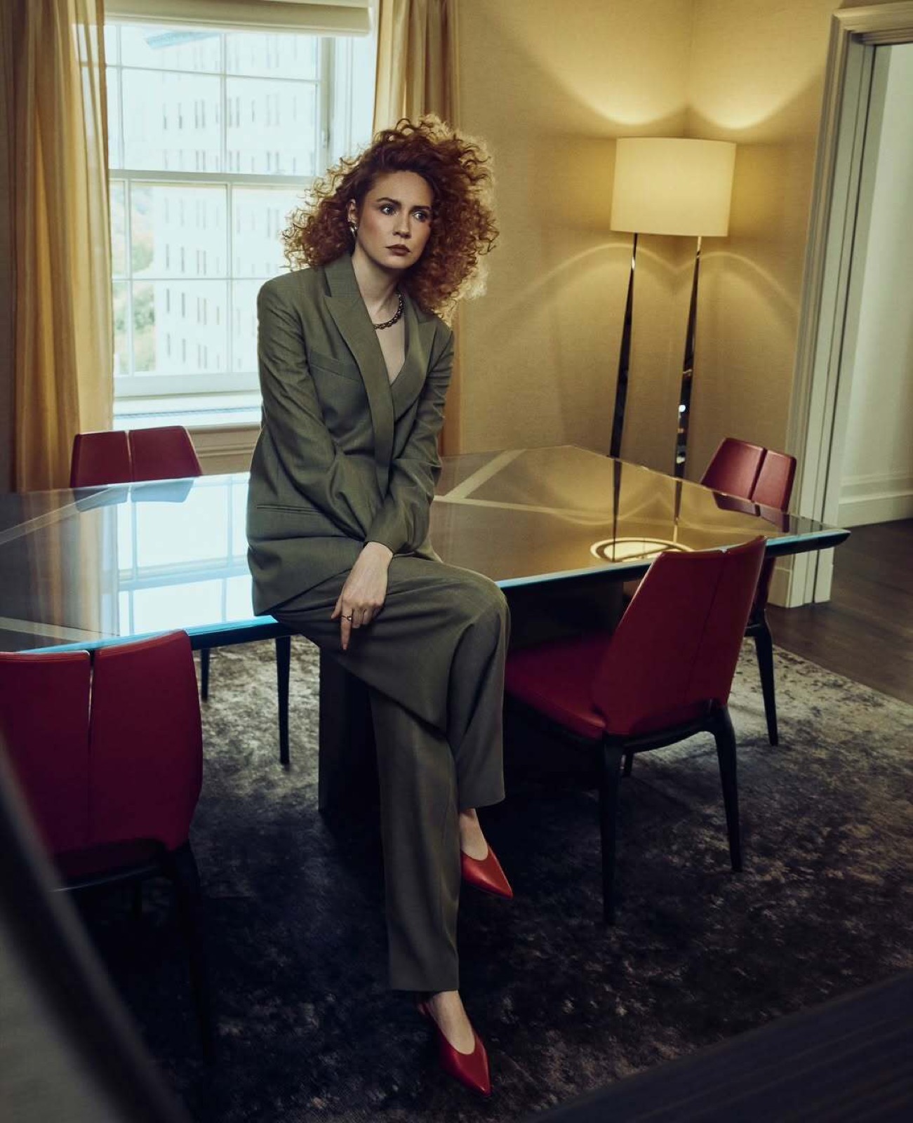 Dans un costume oversize vert olive, elle campe une businesswoman qui aurait oublié de sourire depuis 2017.