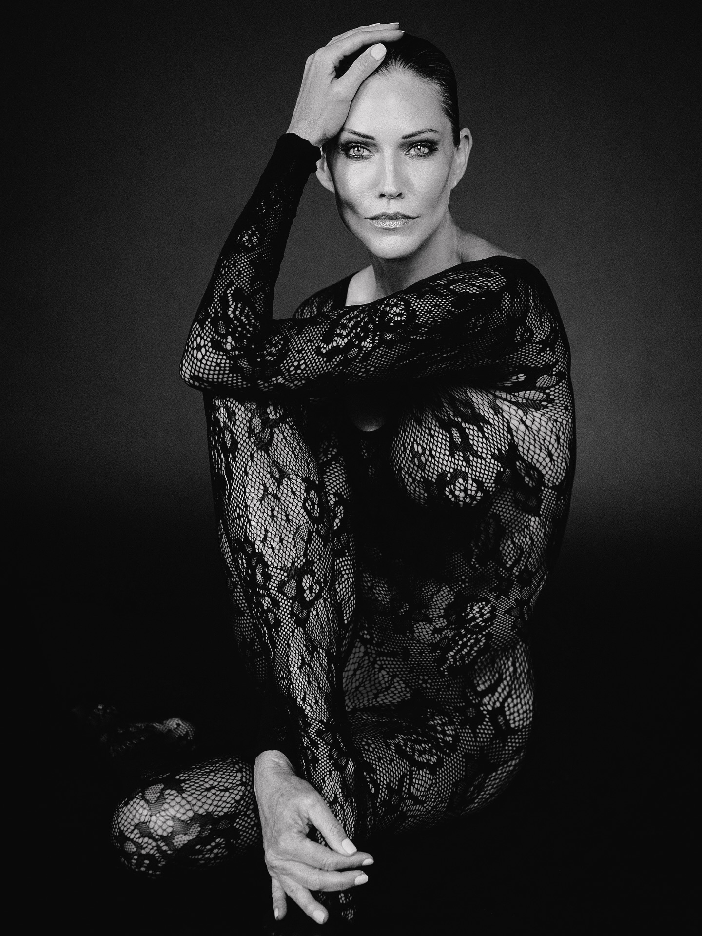 Tricia Helfer, implacable dans son regard perçant et sa posture millimétrée, semble prête à défier les lois de la physique autant que celles du glamour.