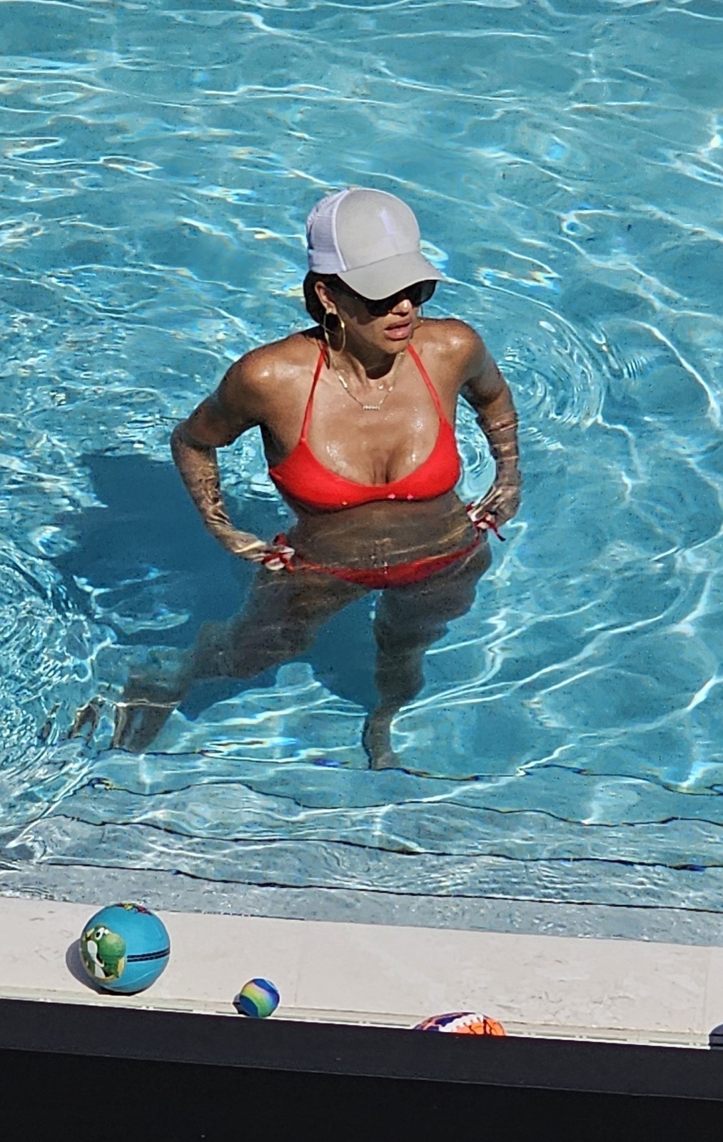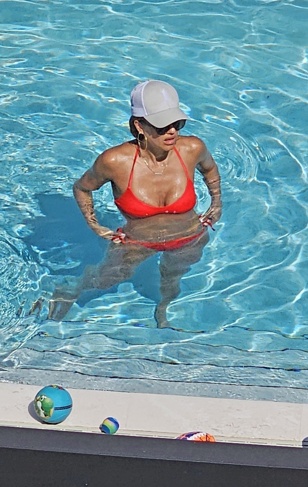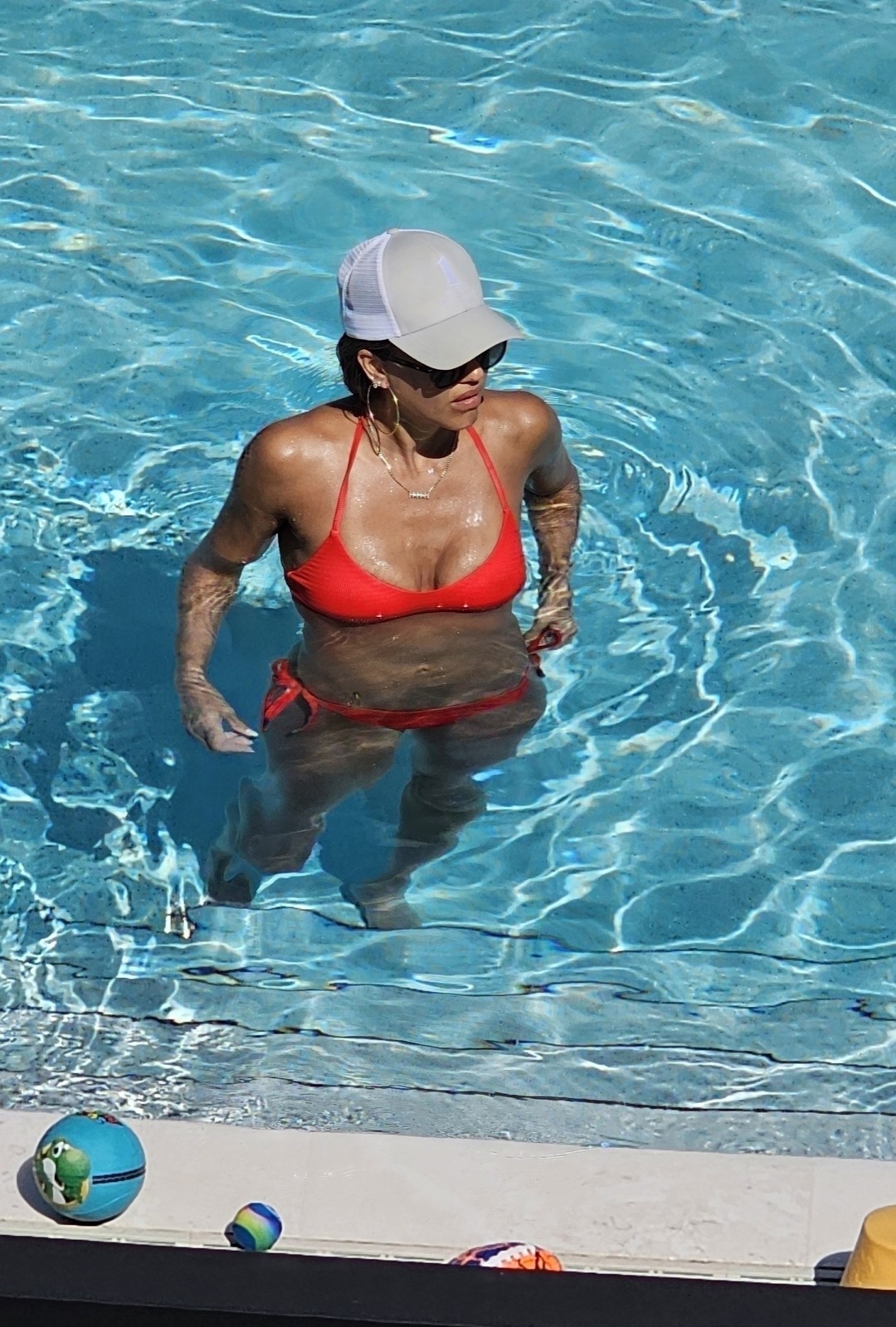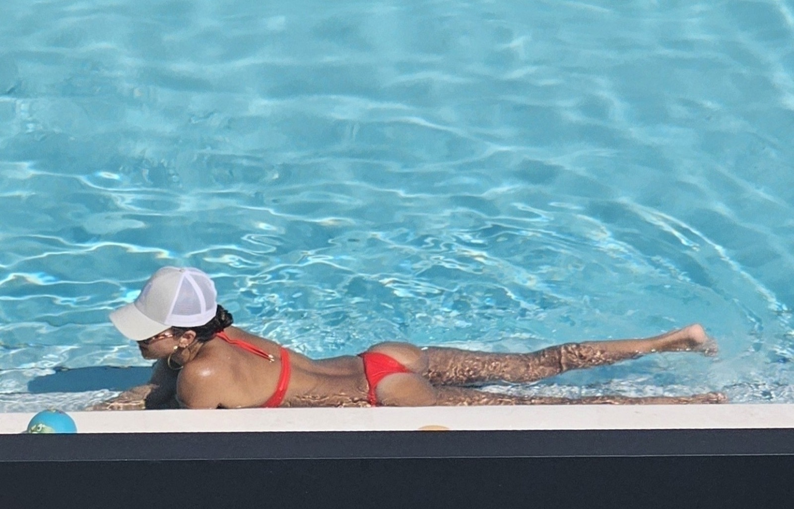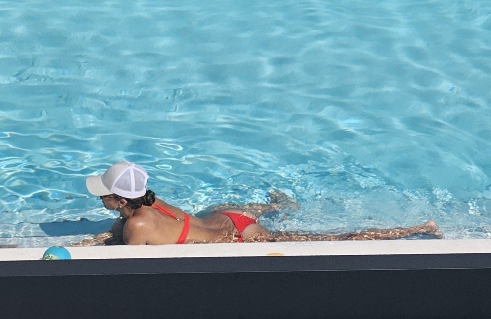Vêtue d’un bikini rouge si minimaliste qu’il pourrait presque être confondu avec un fil Instagram mal cadré, l’actrice transforme une simple piscine en podium aquatique.