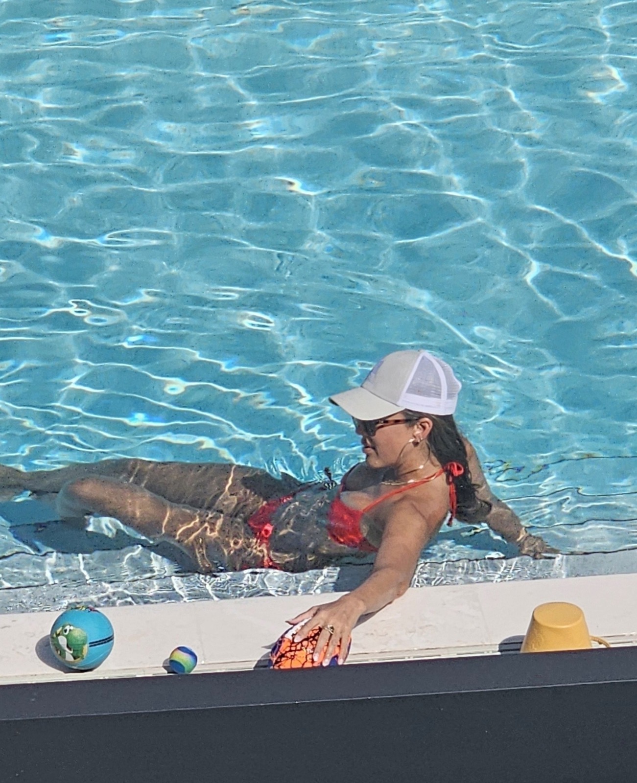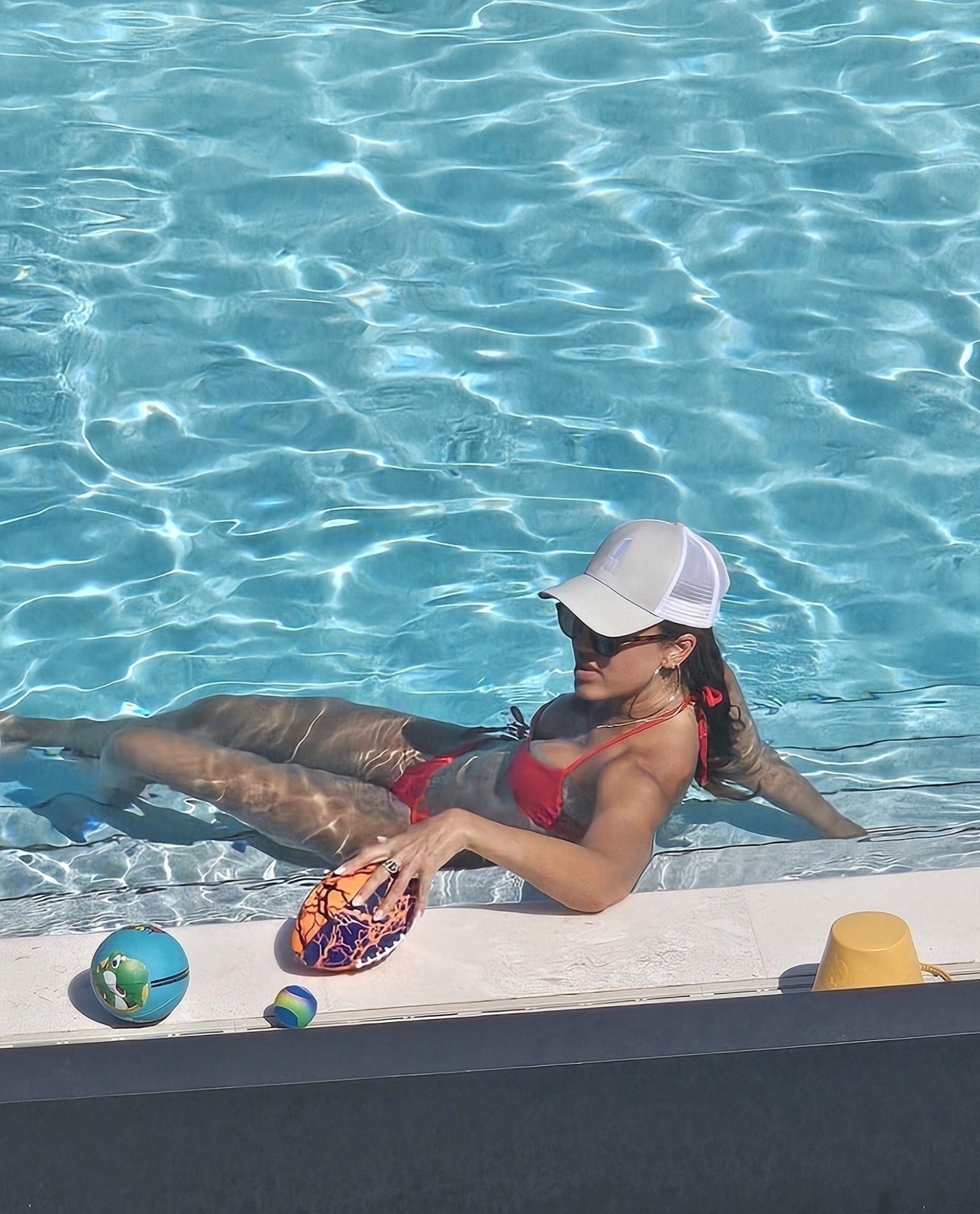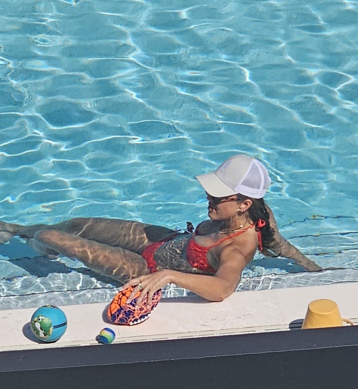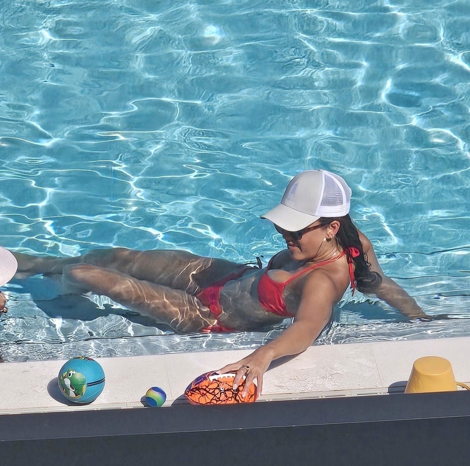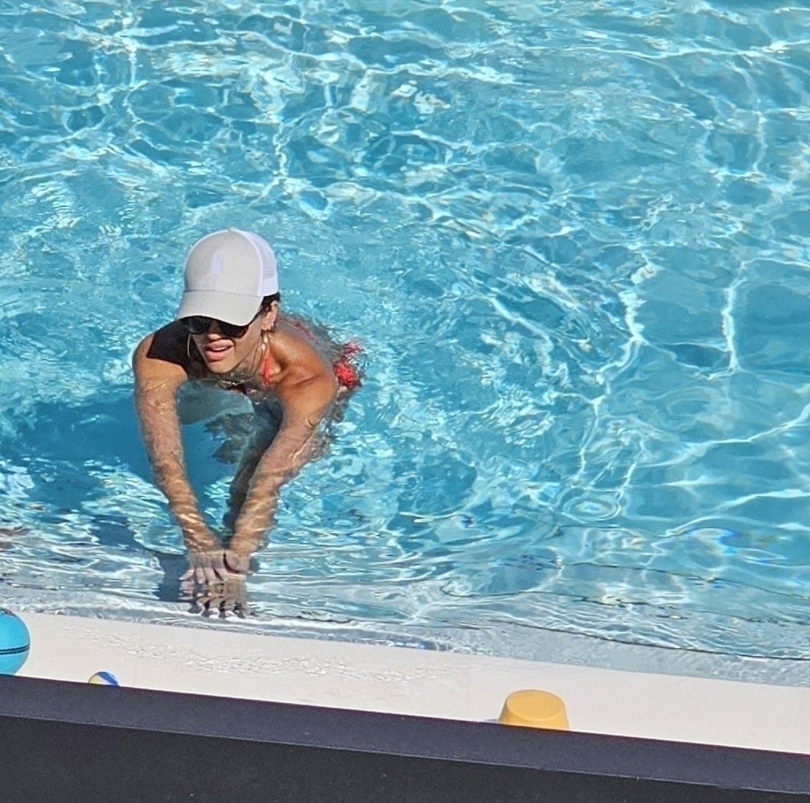 Les balles flottant dans l’eau complètent la scénographie, rappelant qu’on est à la frontière du glamour et du club de vacances familial. Jessica maîtrise ainsi l’équilibre délicat entre star internationale et baigneuse du dimanche, prouvant que même en bikini minuscule, la mise en scène reste impeccable.