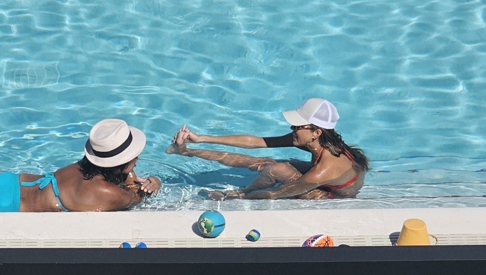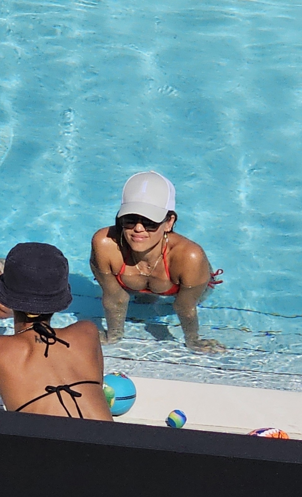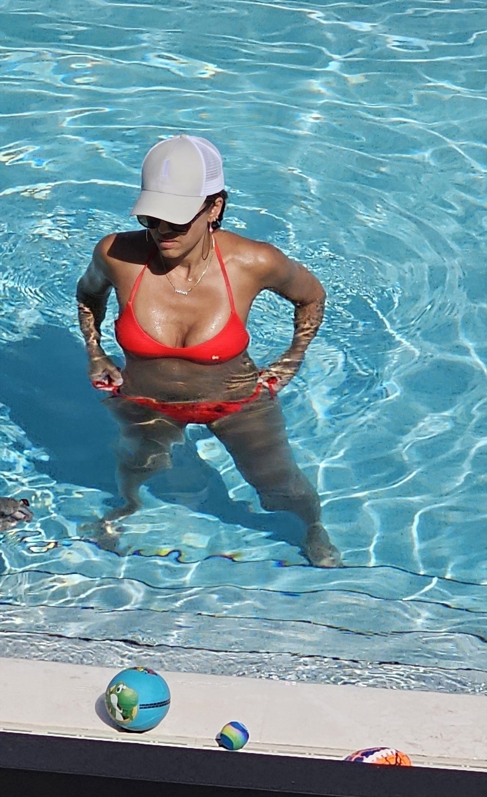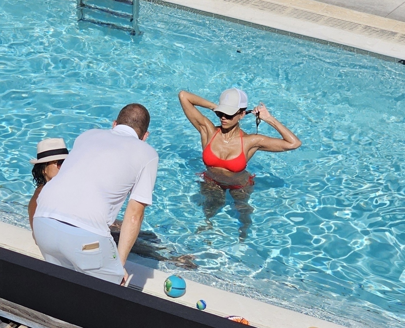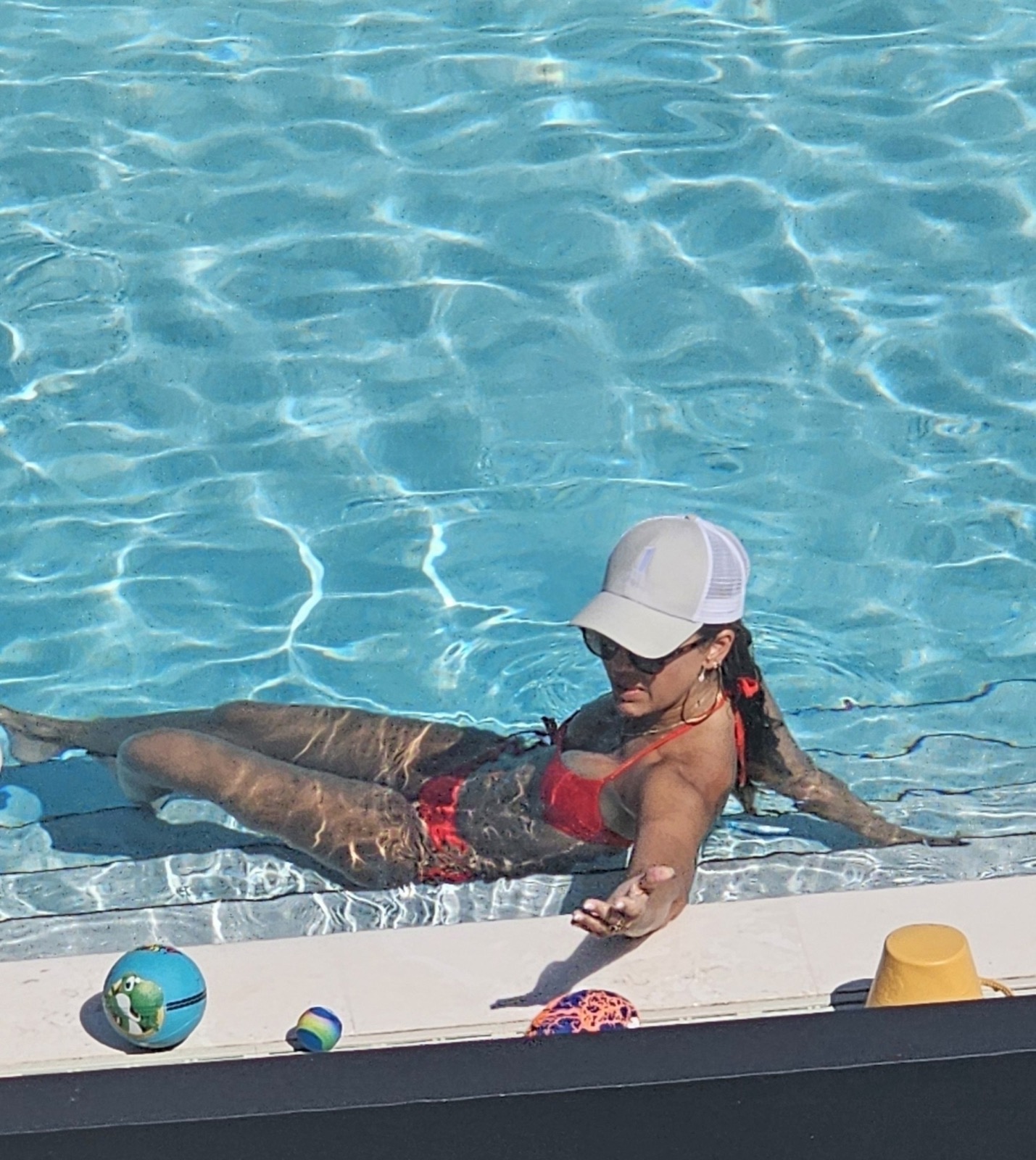 Les balles flottant dans l’eau complètent la scénographie, rappelant qu’on est à la frontière du glamour et du club de vacances familial. Jessica maîtrise ainsi l’équilibre délicat entre star internationale et baigneuse du dimanche, prouvant que même en bikini minuscule, la mise en scène reste impeccable.