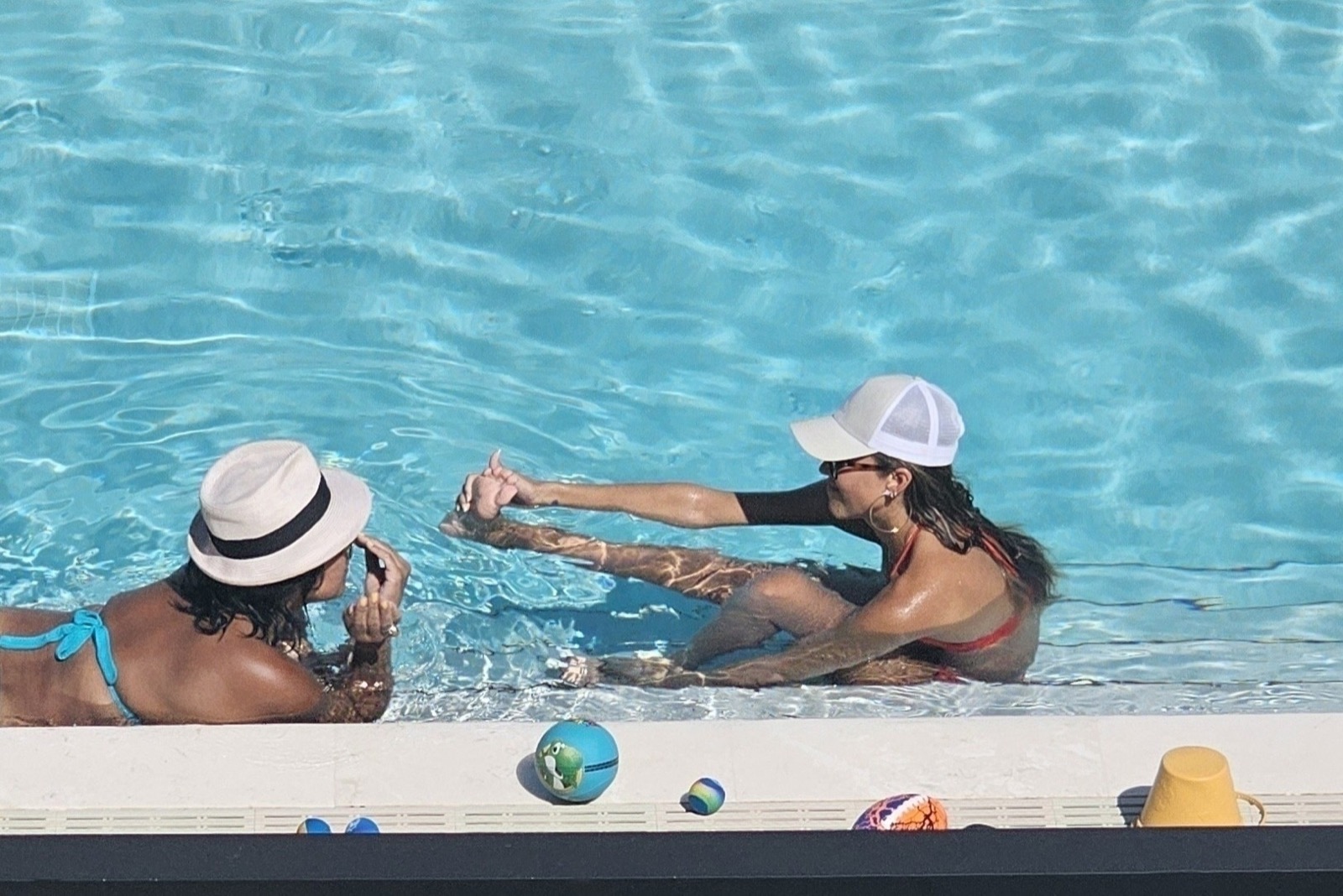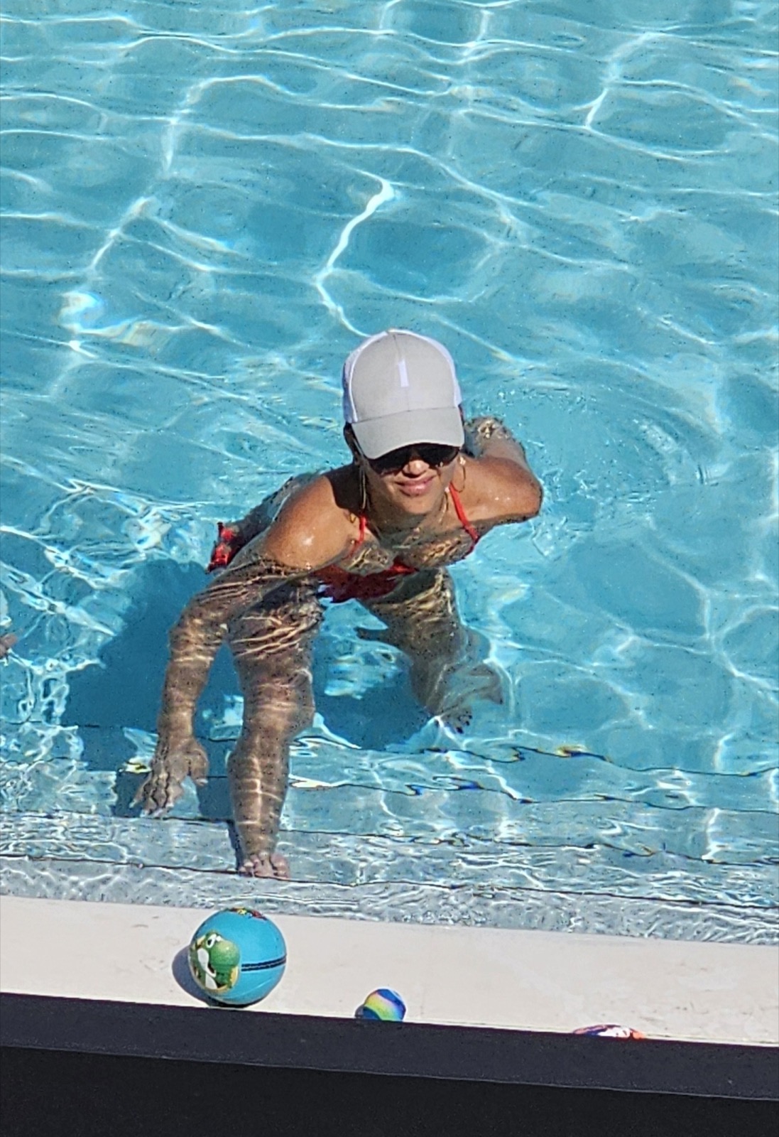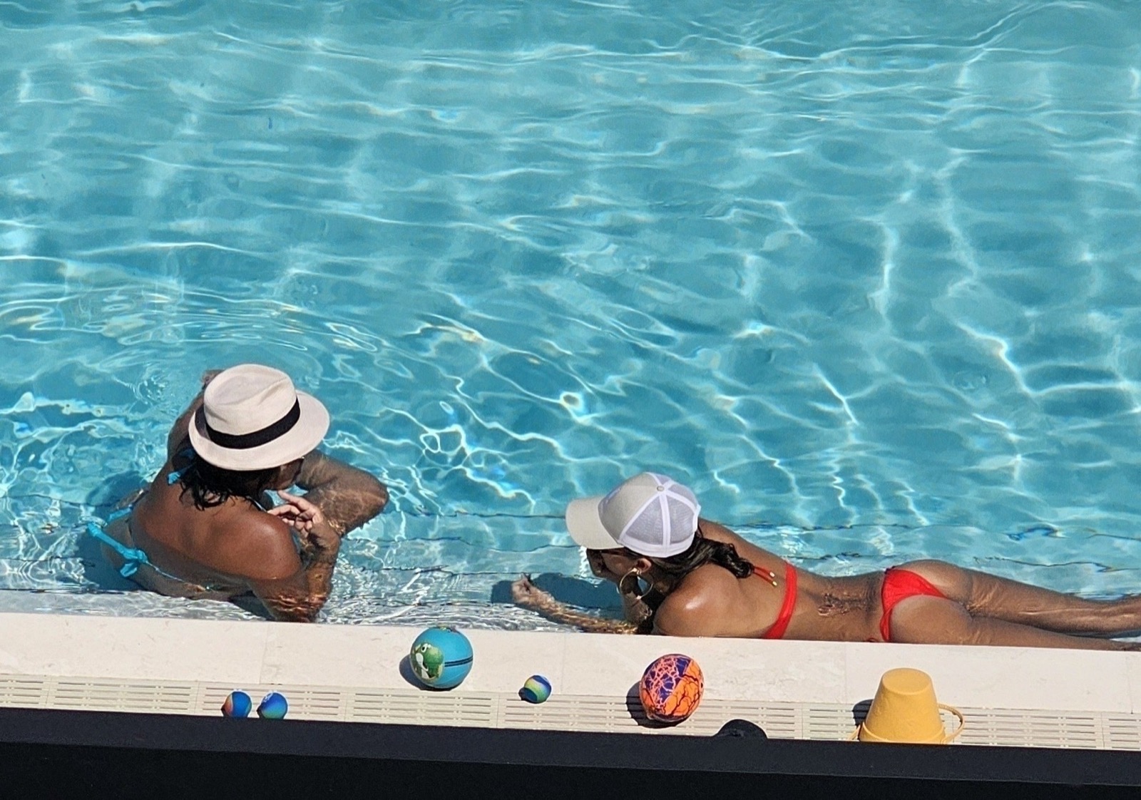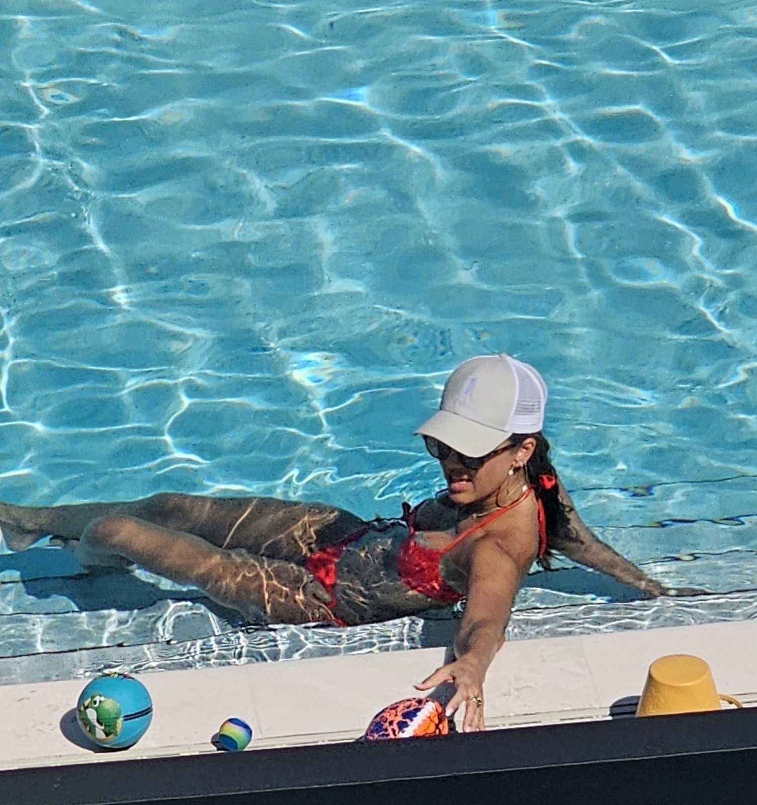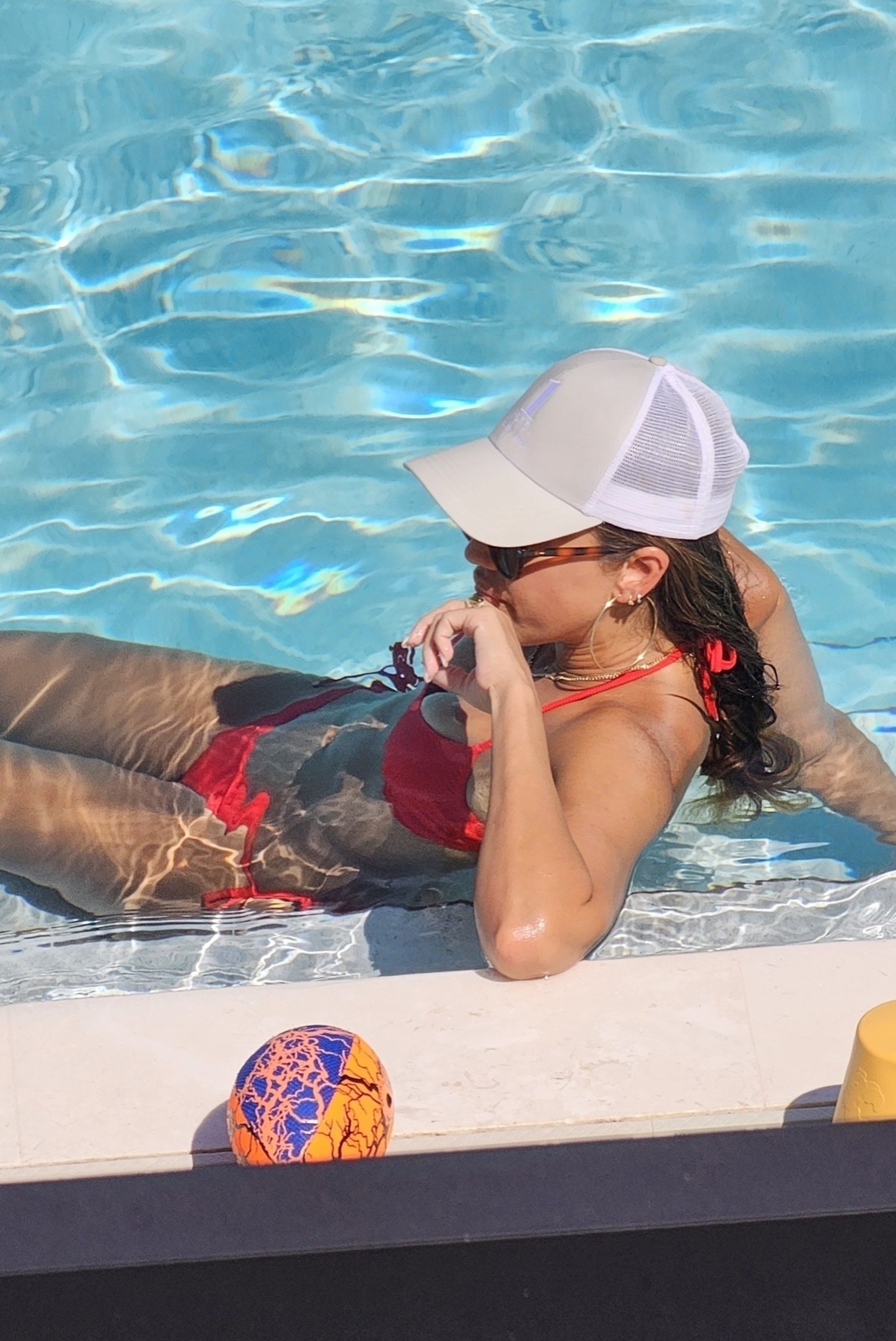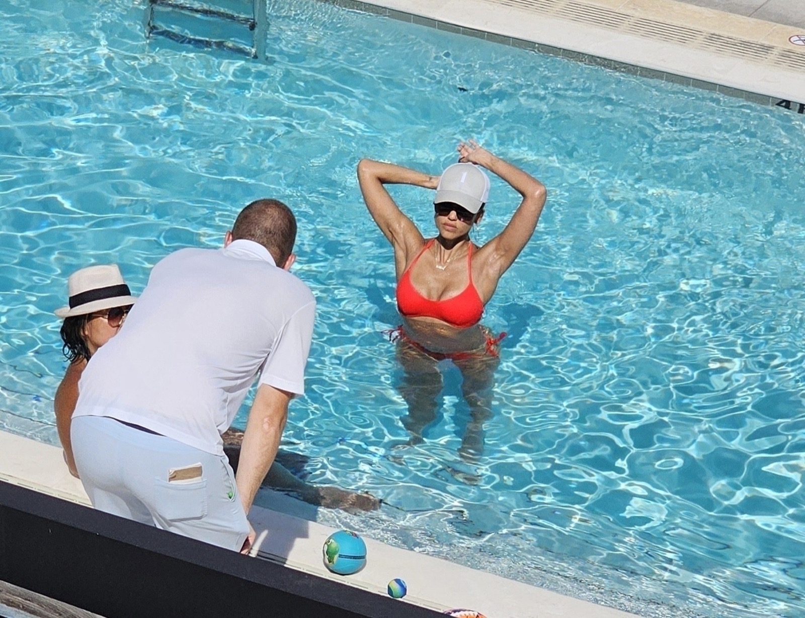 Les balles flottant dans l’eau complètent la scénographie, rappelant qu’on est à la frontière du glamour et du club de vacances familial. Jessica maîtrise ainsi l’équilibre délicat entre star internationale et baigneuse du dimanche, prouvant que même en bikini minuscule, la mise en scène reste impeccable.