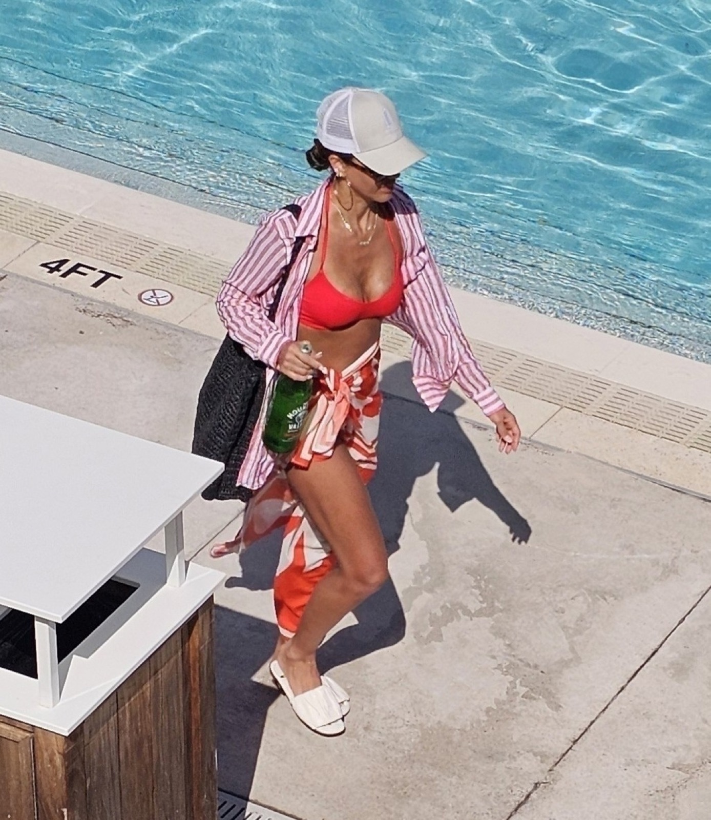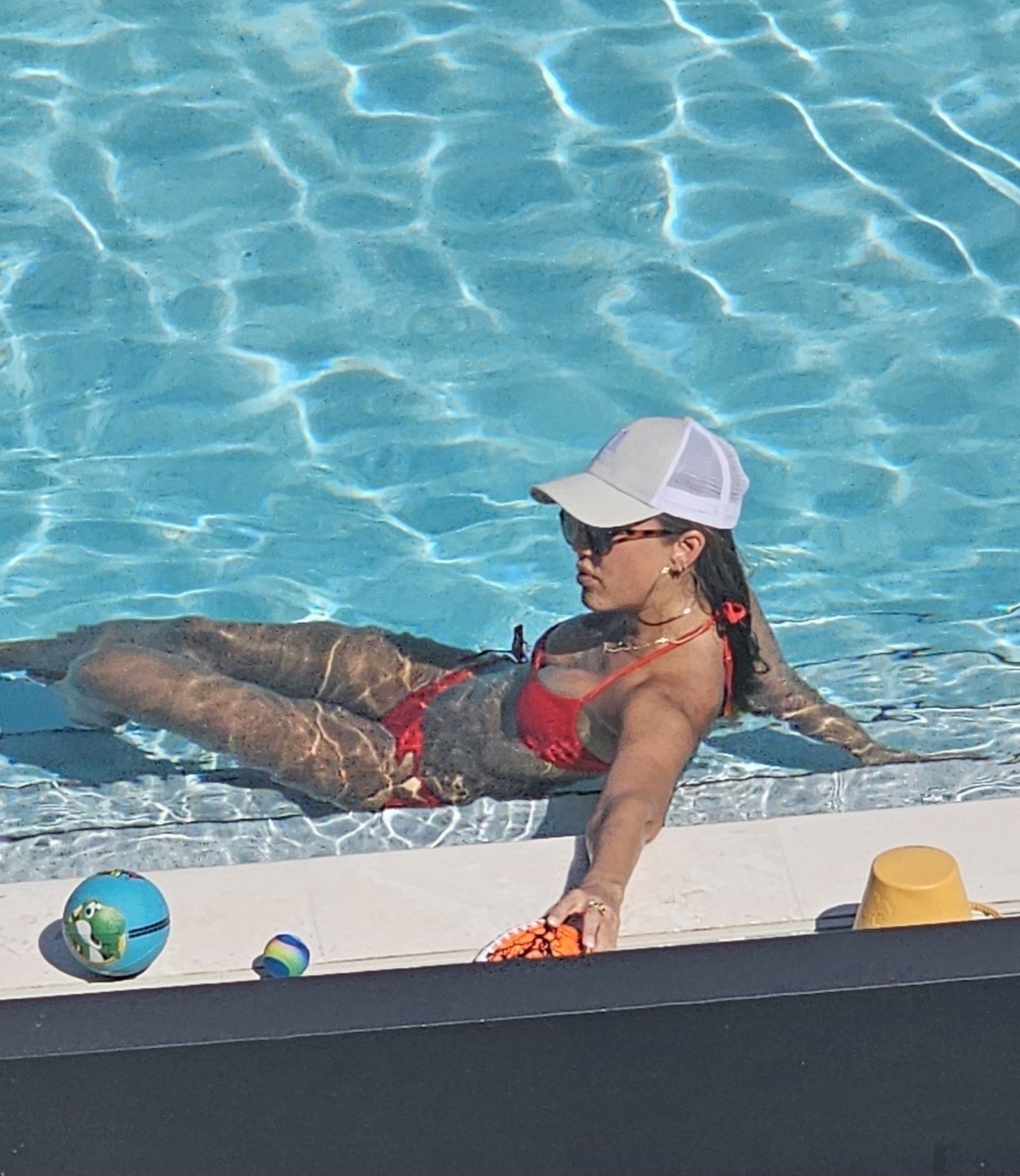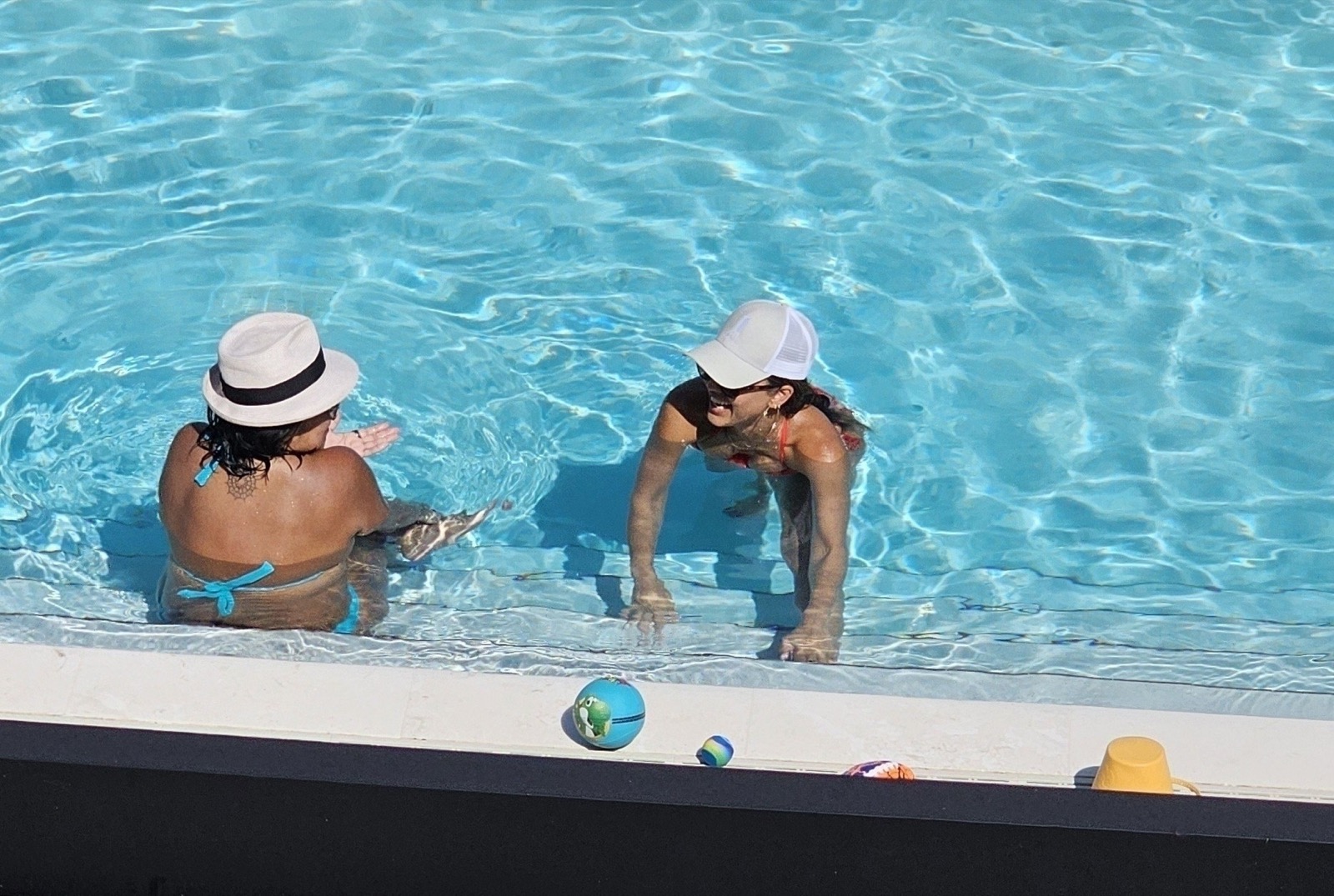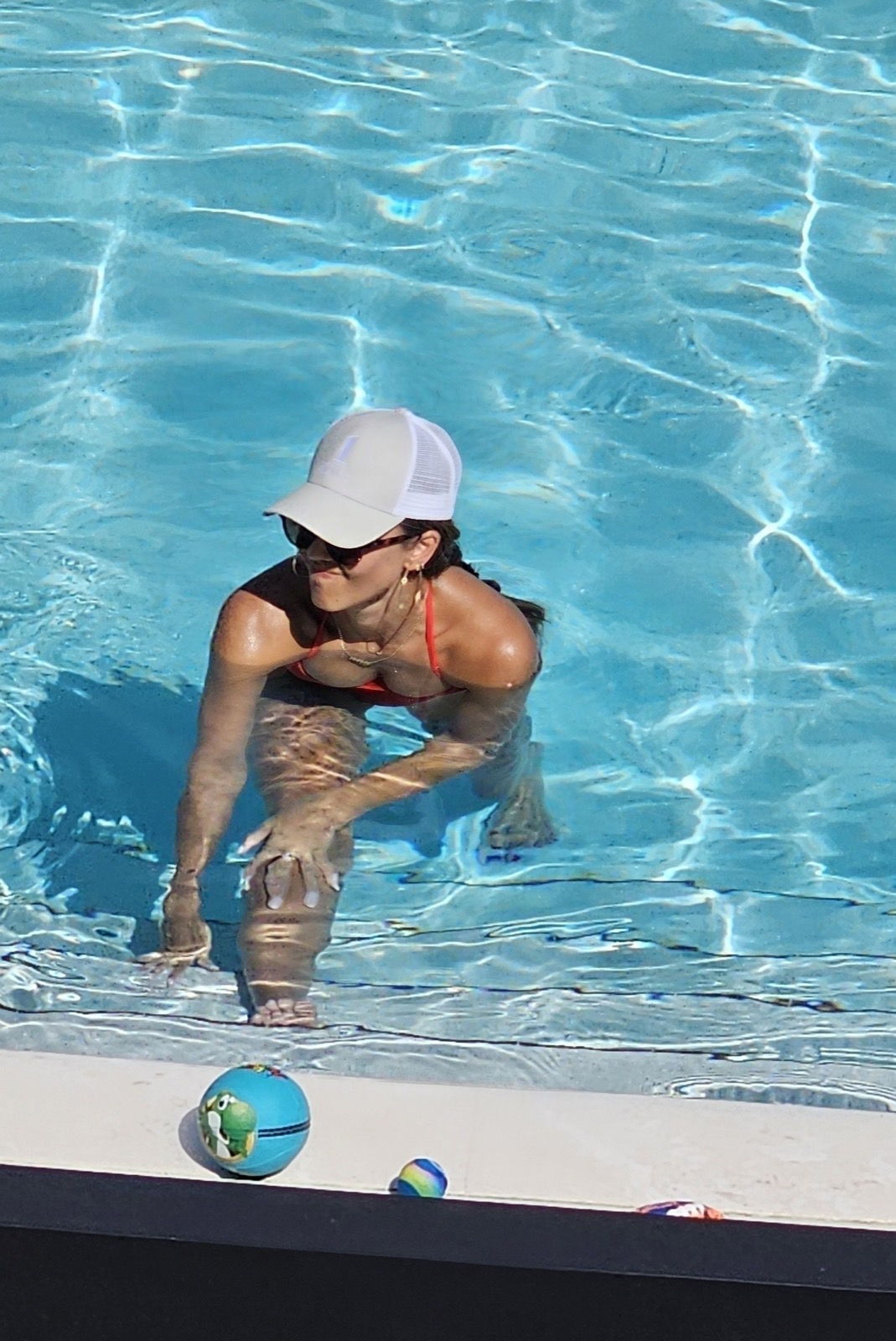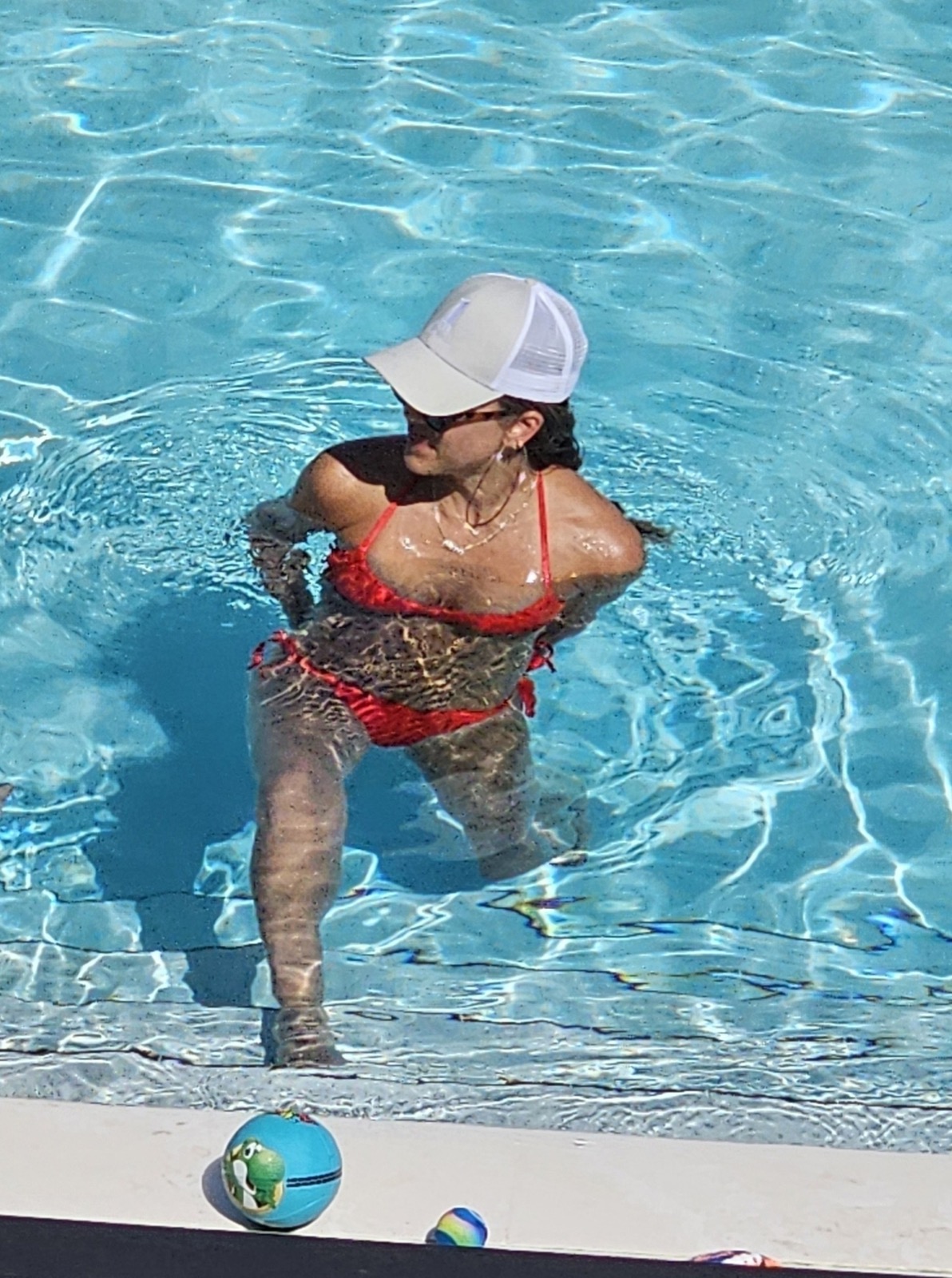 Les balles flottant dans l’eau complètent la scénographie, rappelant qu’on est à la frontière du glamour et du club de vacances familial. Jessica maîtrise ainsi l’équilibre délicat entre star internationale et baigneuse du dimanche, prouvant que même en bikini minuscule, la mise en scène reste impeccable.
