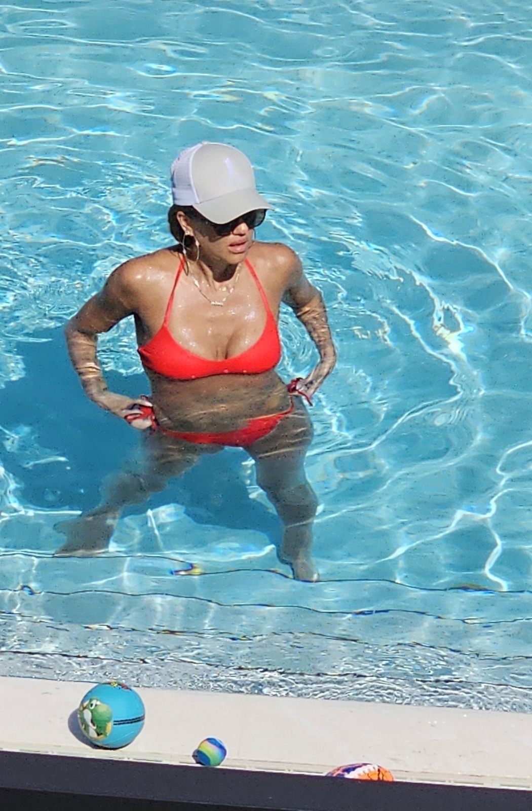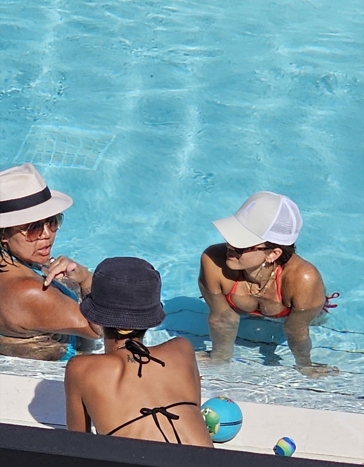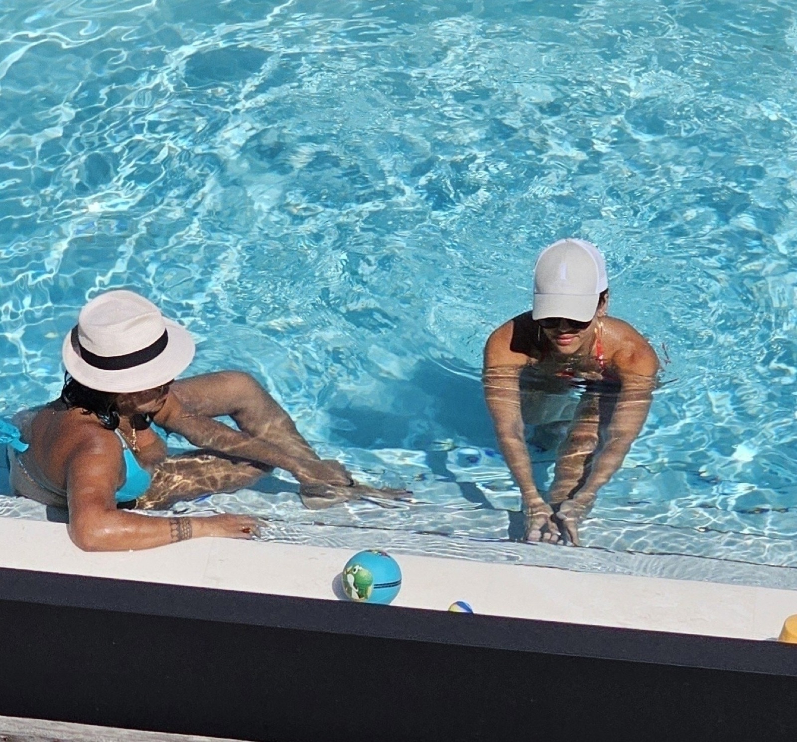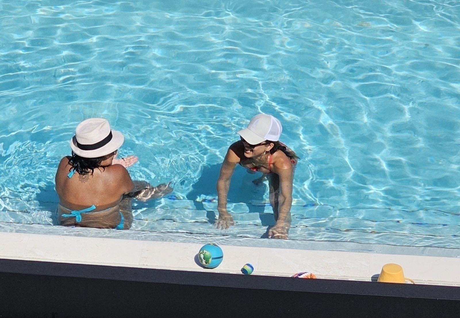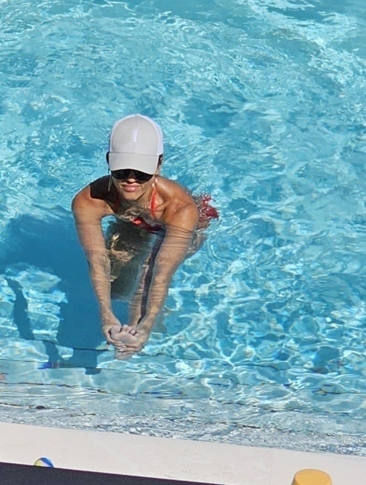Les balles flottant dans l’eau complètent la scénographie, rappelant qu’on est à la frontière du glamour et du club de vacances familial. Jessica maîtrise ainsi l’équilibre délicat entre star internationale et baigneuse du dimanche, prouvant que même en bikini minuscule, la mise en scène reste impeccable.