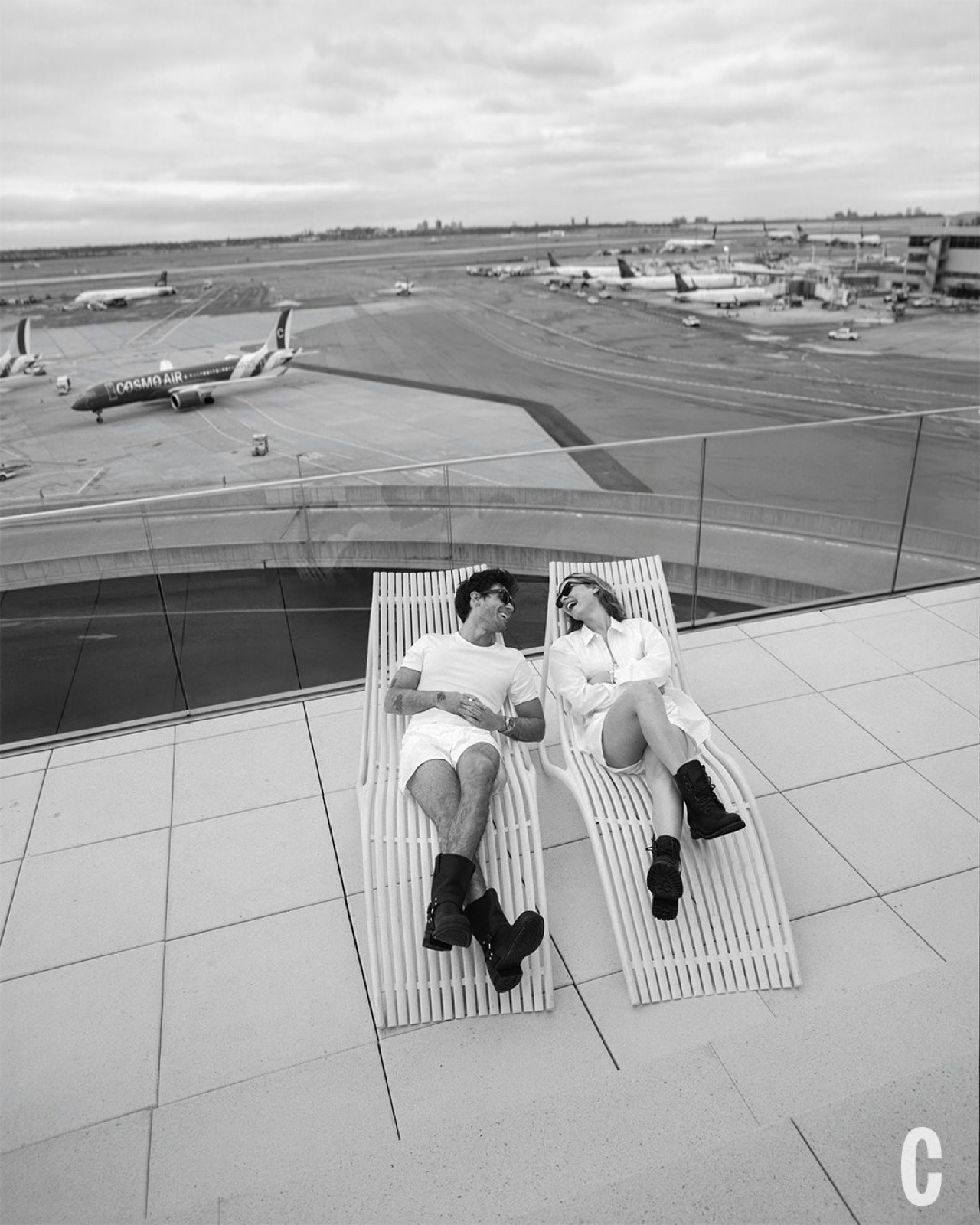 Cosmopolitan nous offre ici une vision d’avenir de la mode : un couple en cuir noir posé sur un canapé rouge flamboyant, comme si l’enfer avait soudainement décidé d’ouvrir un showroom.