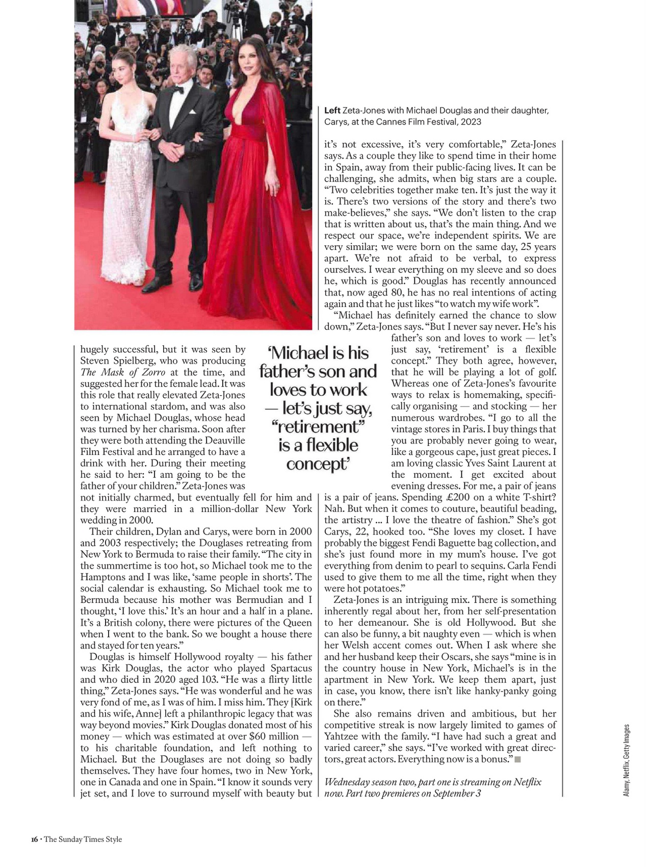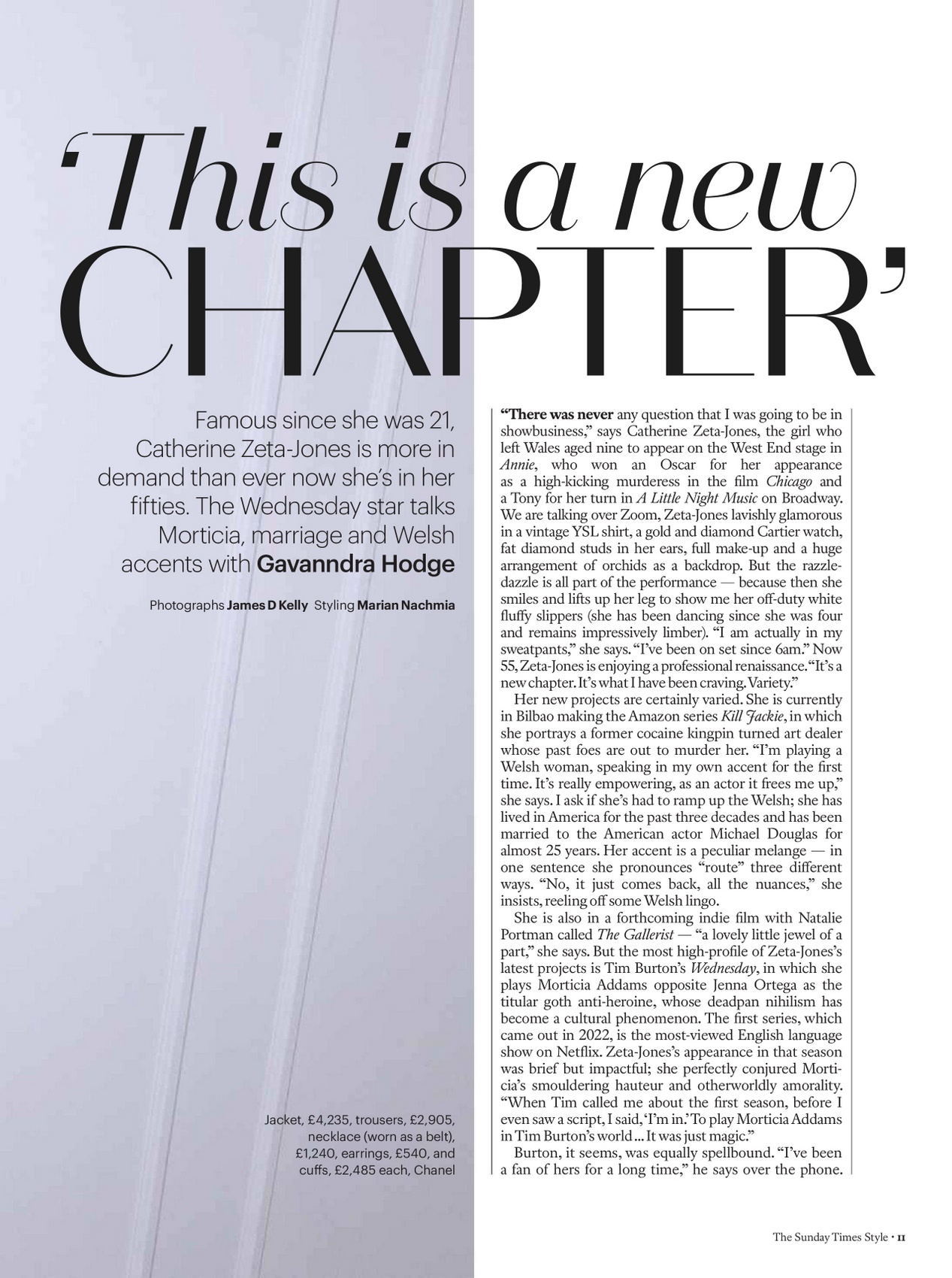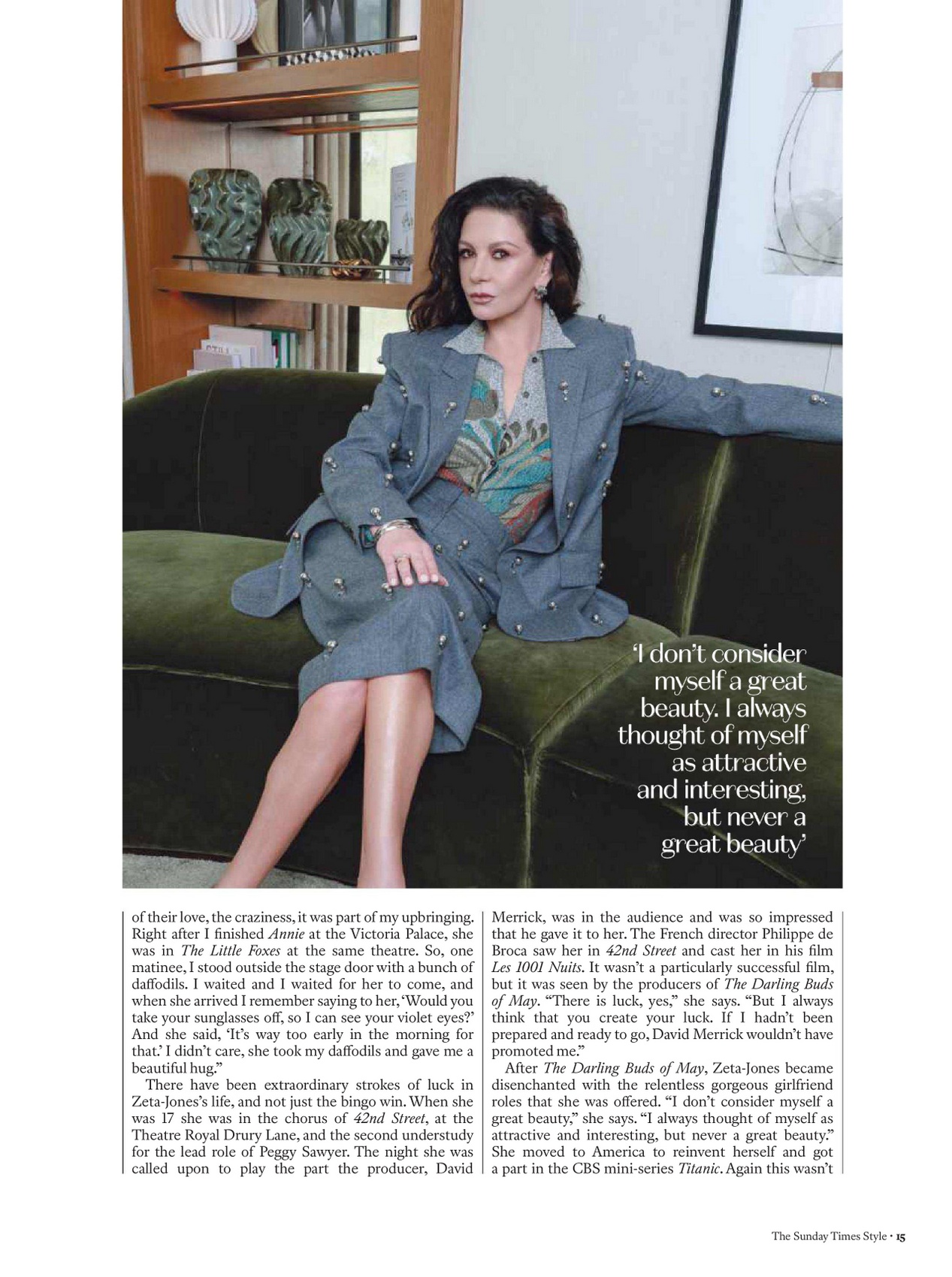 Voici donc Catherine Zeta-Jones, assise nonchalamment sur un fauteuil comme si la vie entière n’était qu’une suite de shootings posés.