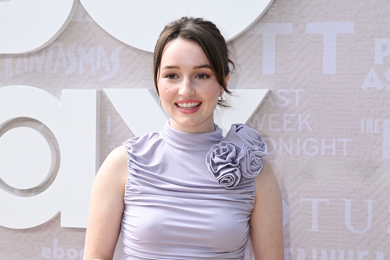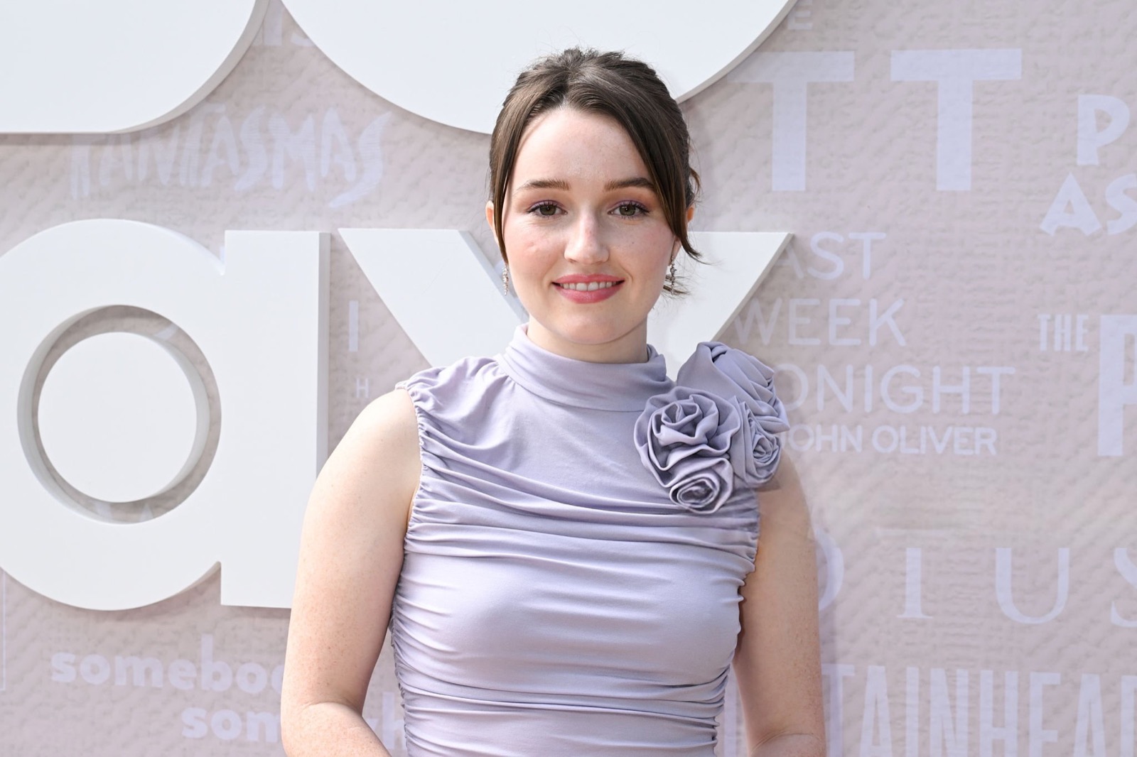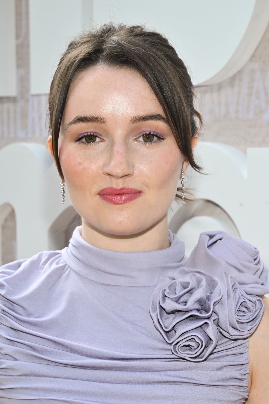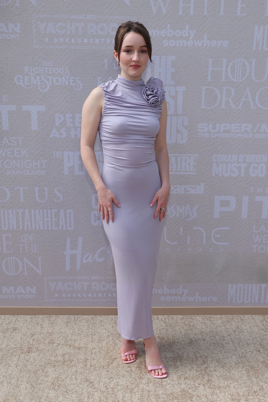 Sous le soleil hollywoodien, Kaitlyn Dever s’avance en robe lilas moulante, agrémentée d’une fleur plissée à l’épaule comme si elle venait de s’échapper d’un bouquet de gala.