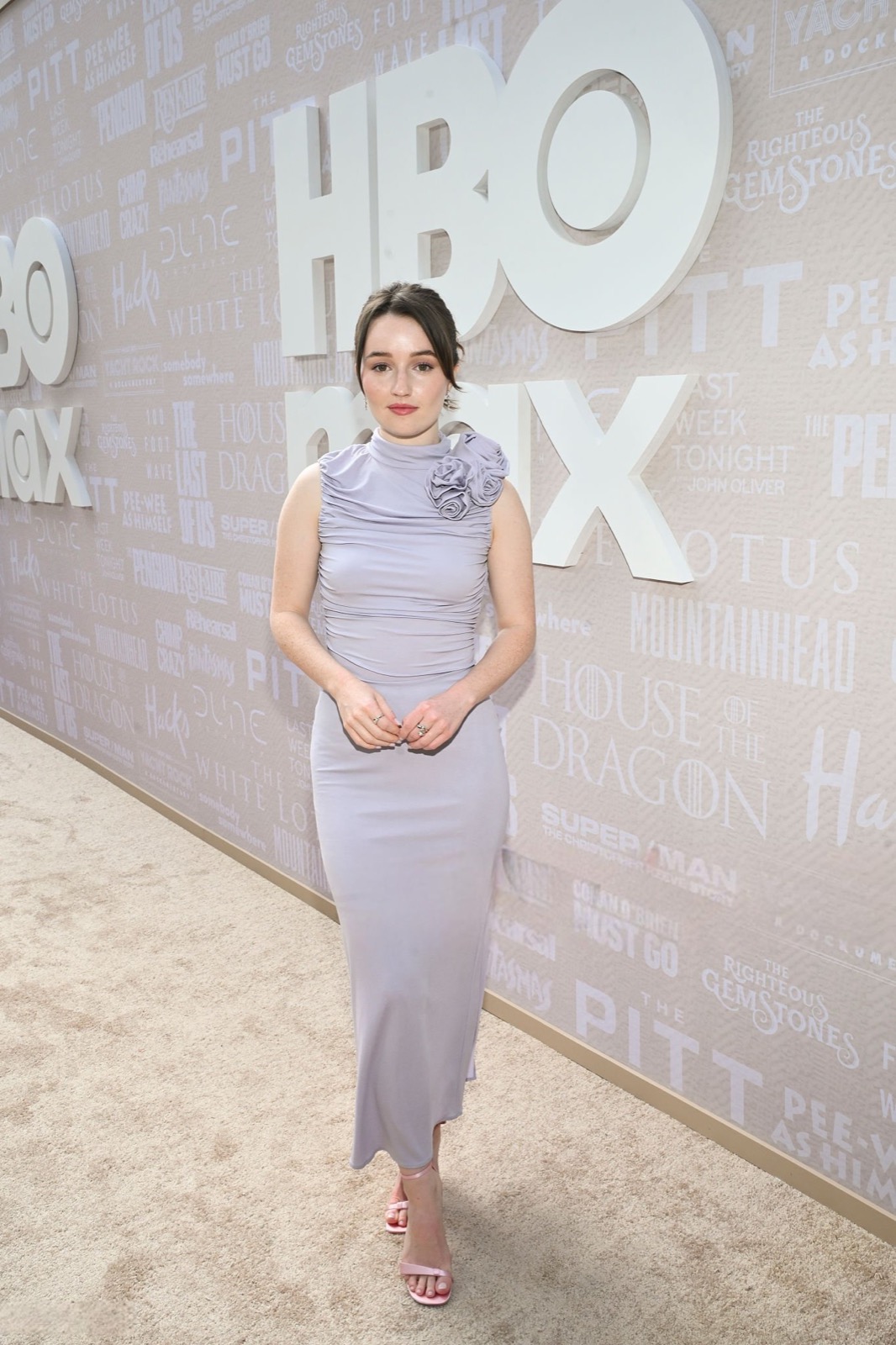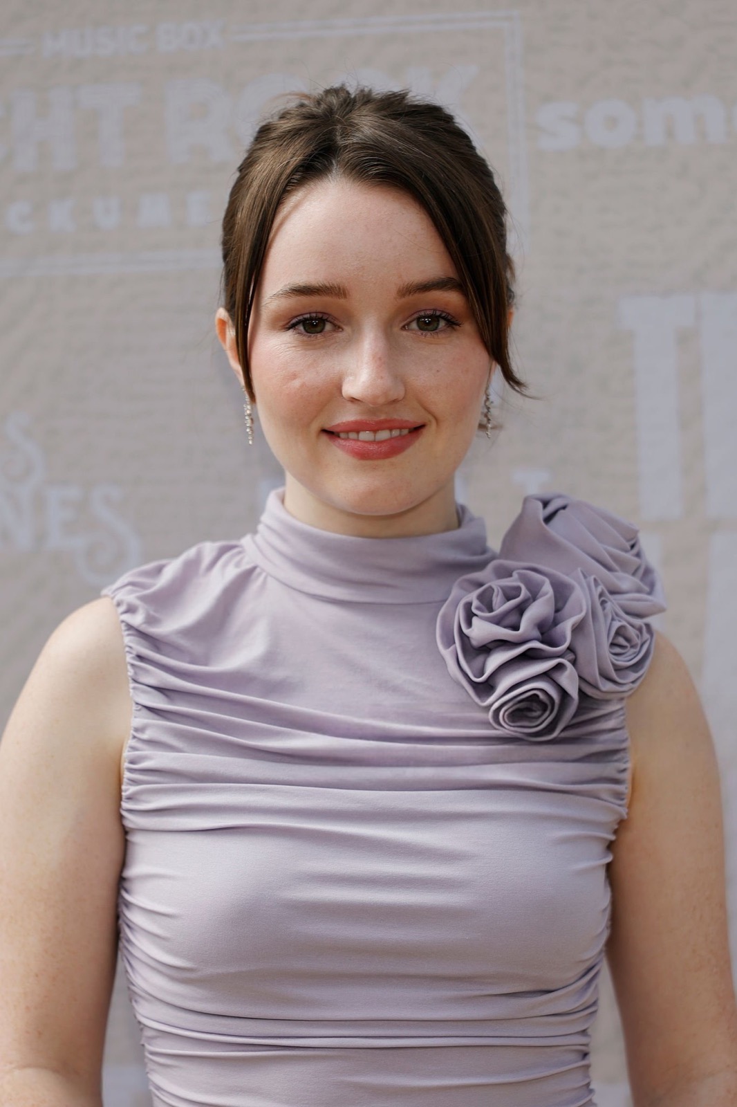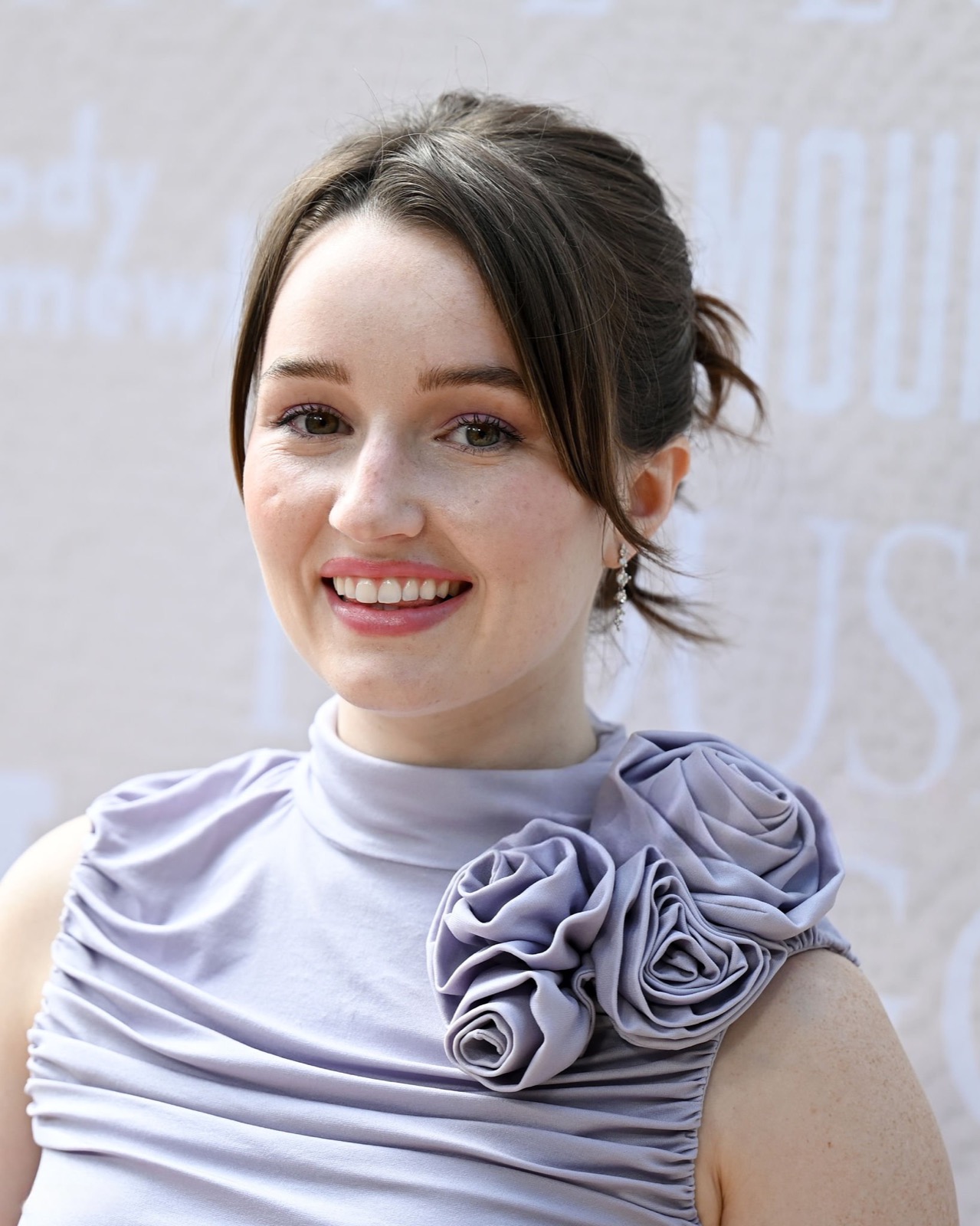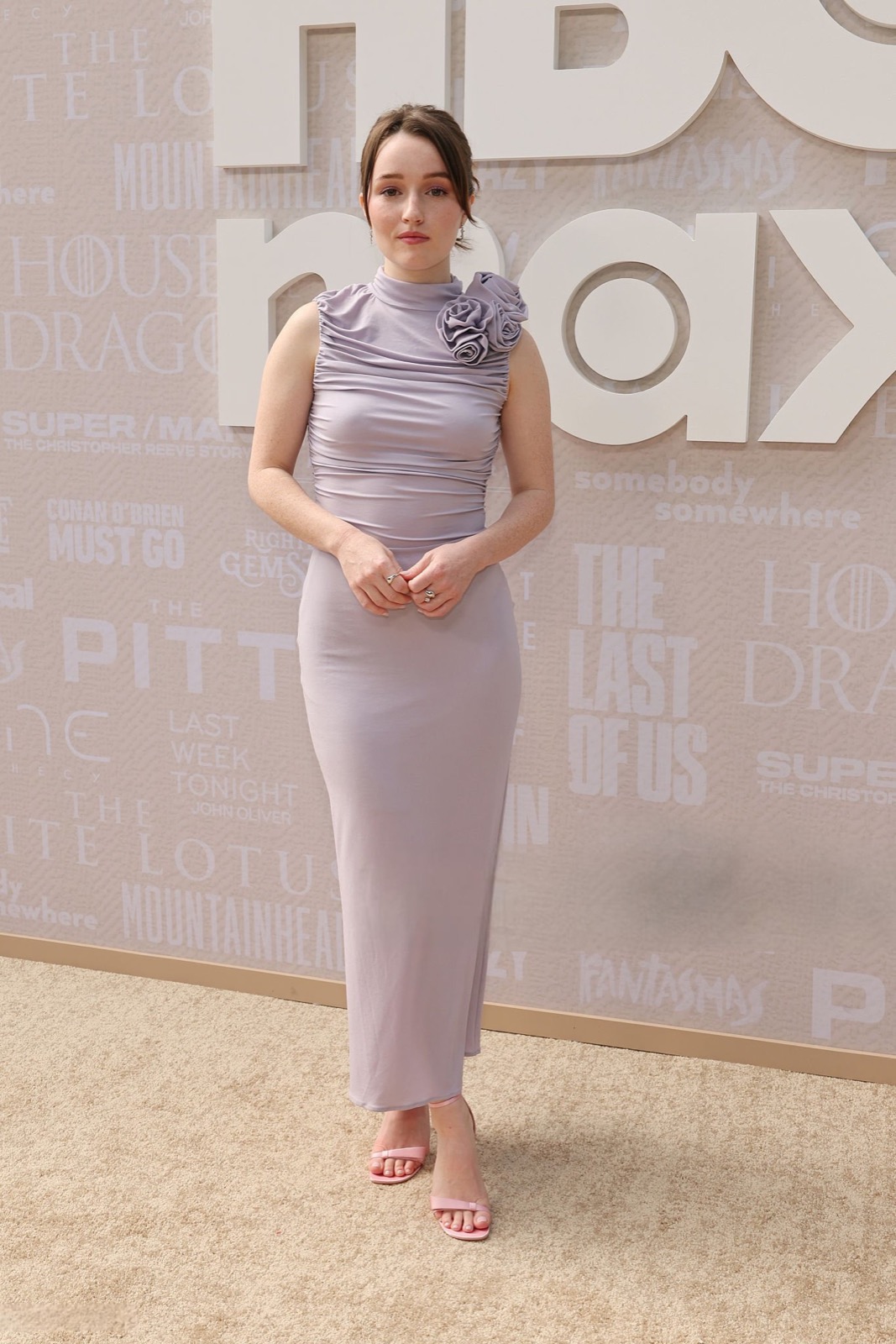 Sous le soleil hollywoodien, Kaitlyn Dever s’avance en robe lilas moulante, agrémentée d’une fleur plissée à l’épaule comme si elle venait de s’échapper d’un bouquet de gala.