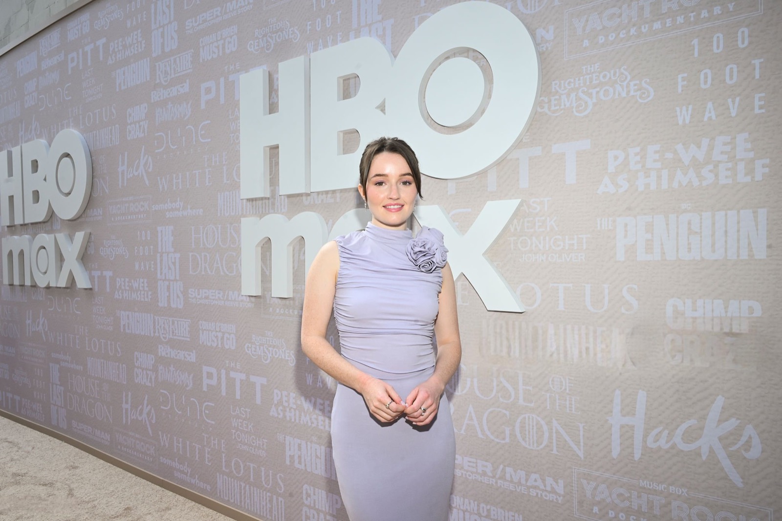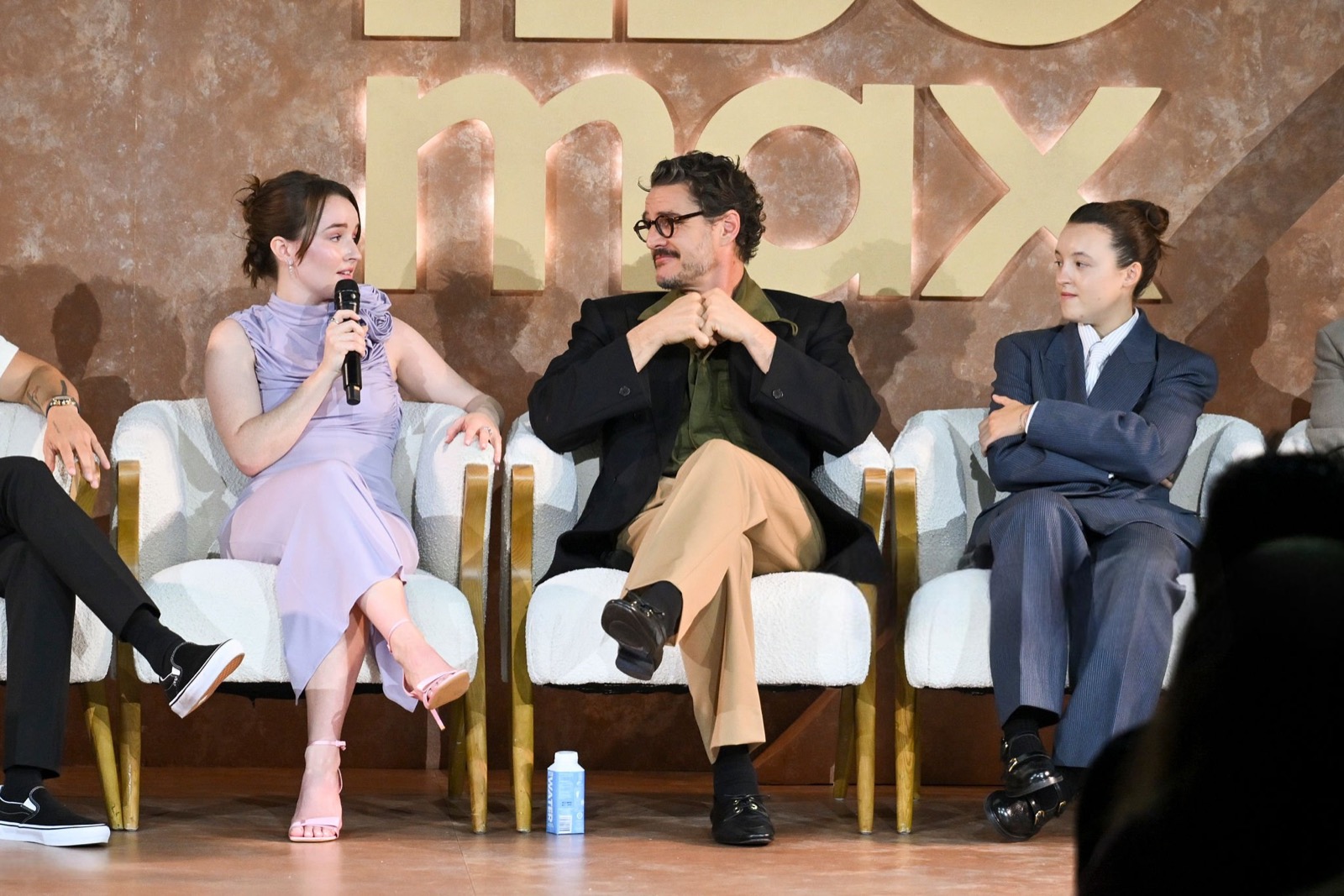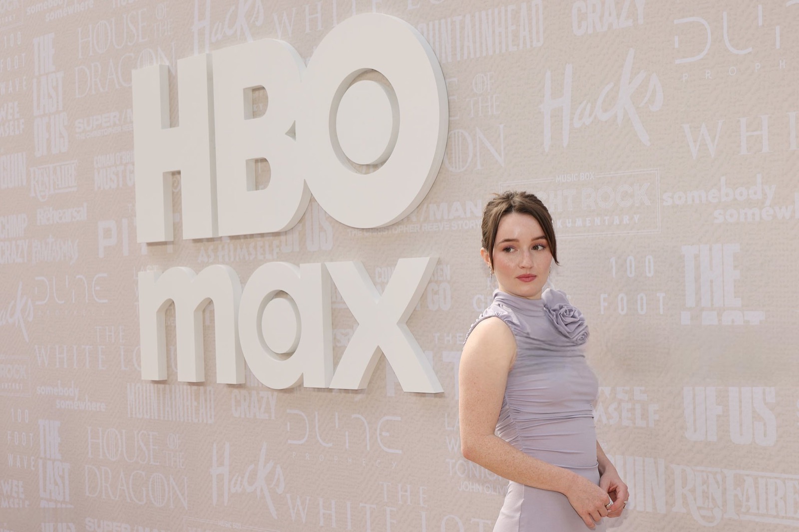 Sur scène, micro en main, elle se transforme en intervenante sérieuse, perchée entre fauteuils molletonnés, coincée entre discussions et sourires polis. L’arrière-plan HBO Max martèle le prestige du moment, mais tout respire le cérémonial un peu forcé, où l’élégance millimétrée se frotte à l’ennui institutionnel.