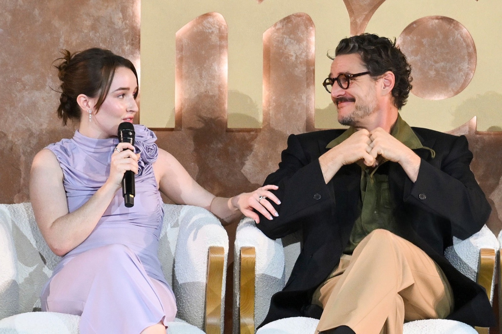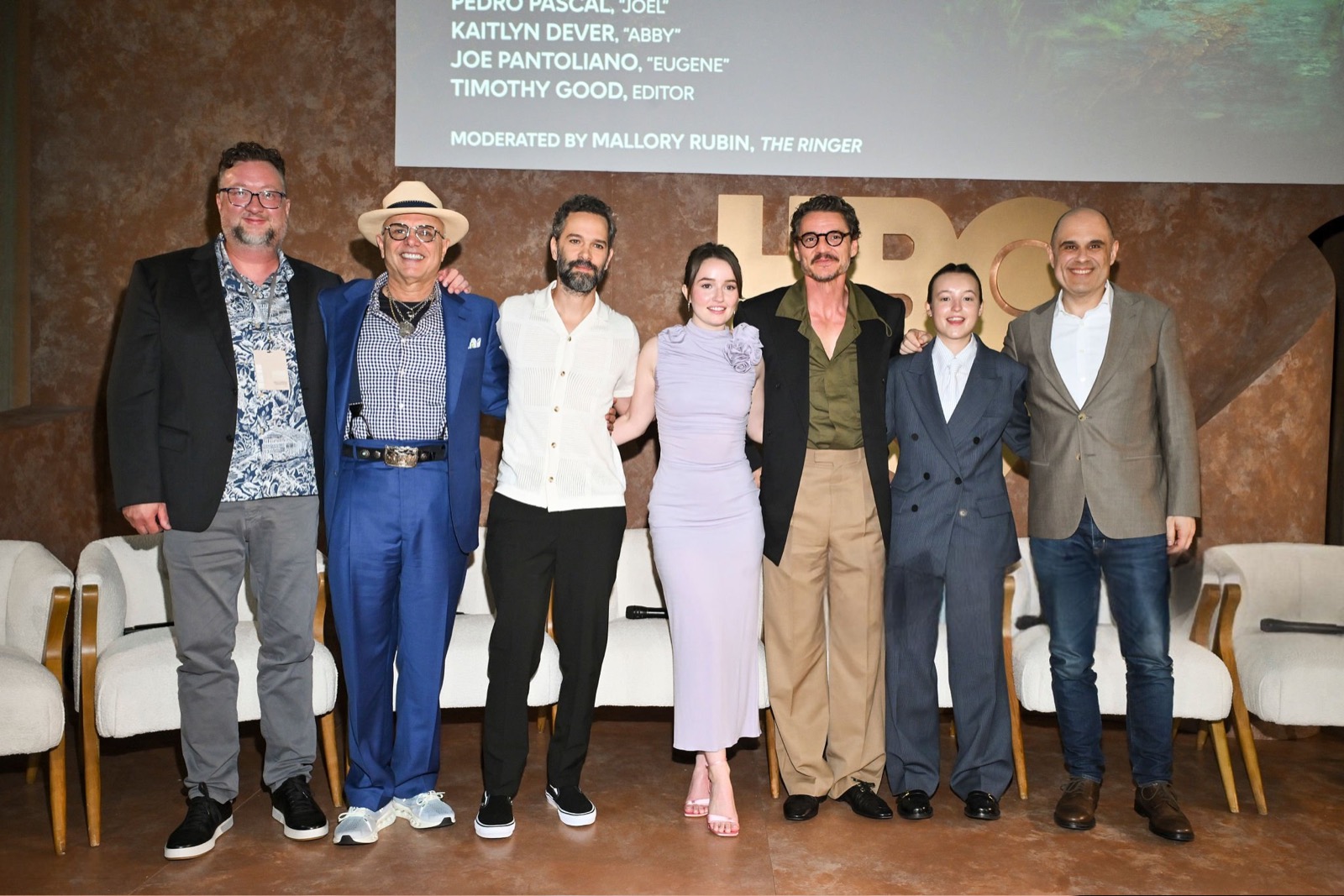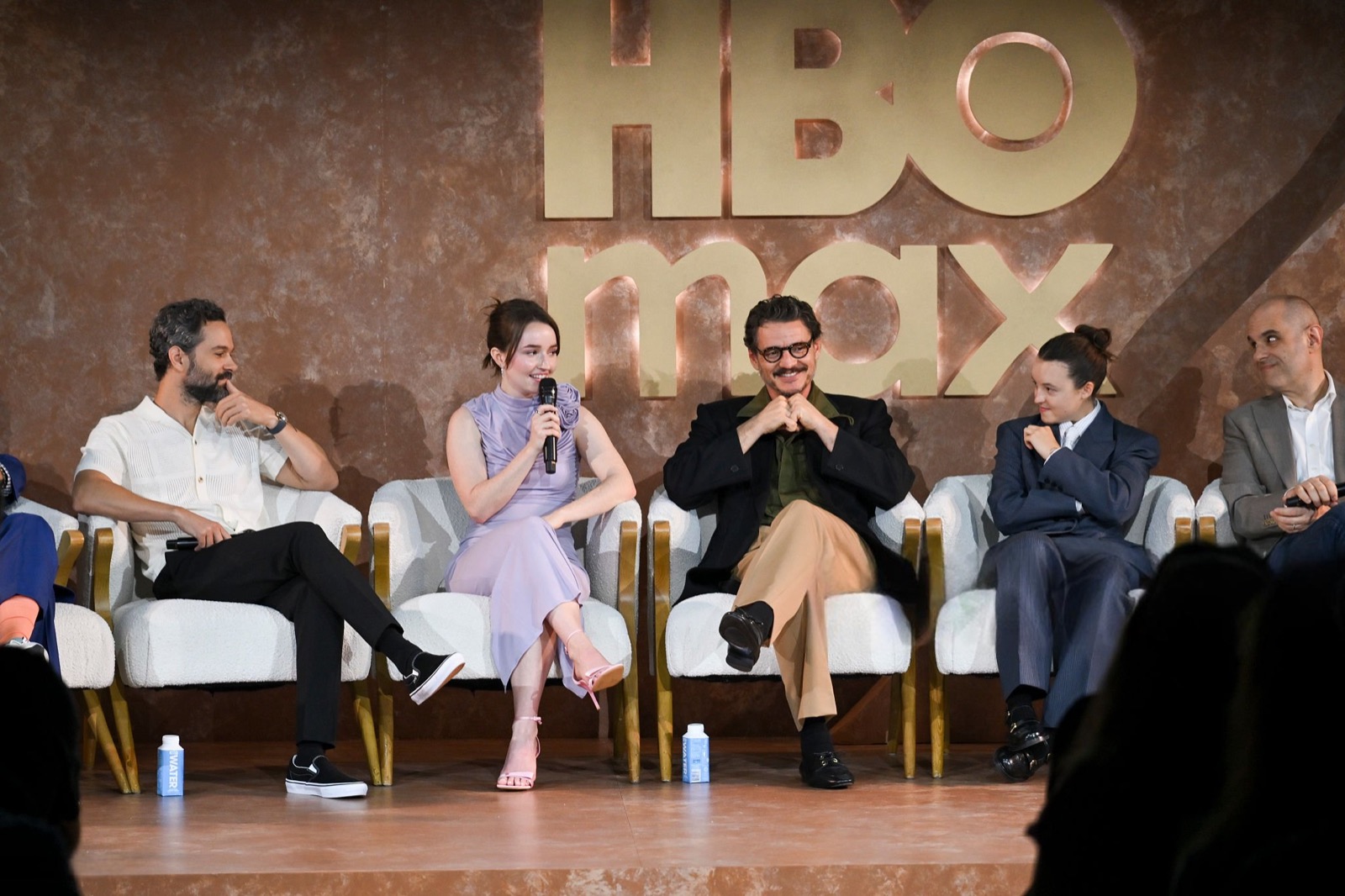 Sur scène, micro en main, elle se transforme en intervenante sérieuse, perchée entre fauteuils molletonnés, coincée entre discussions et sourires polis. L’arrière-plan HBO Max martèle le prestige du moment, mais tout respire le cérémonial un peu forcé, où l’élégance millimétrée se frotte à l’ennui institutionnel.