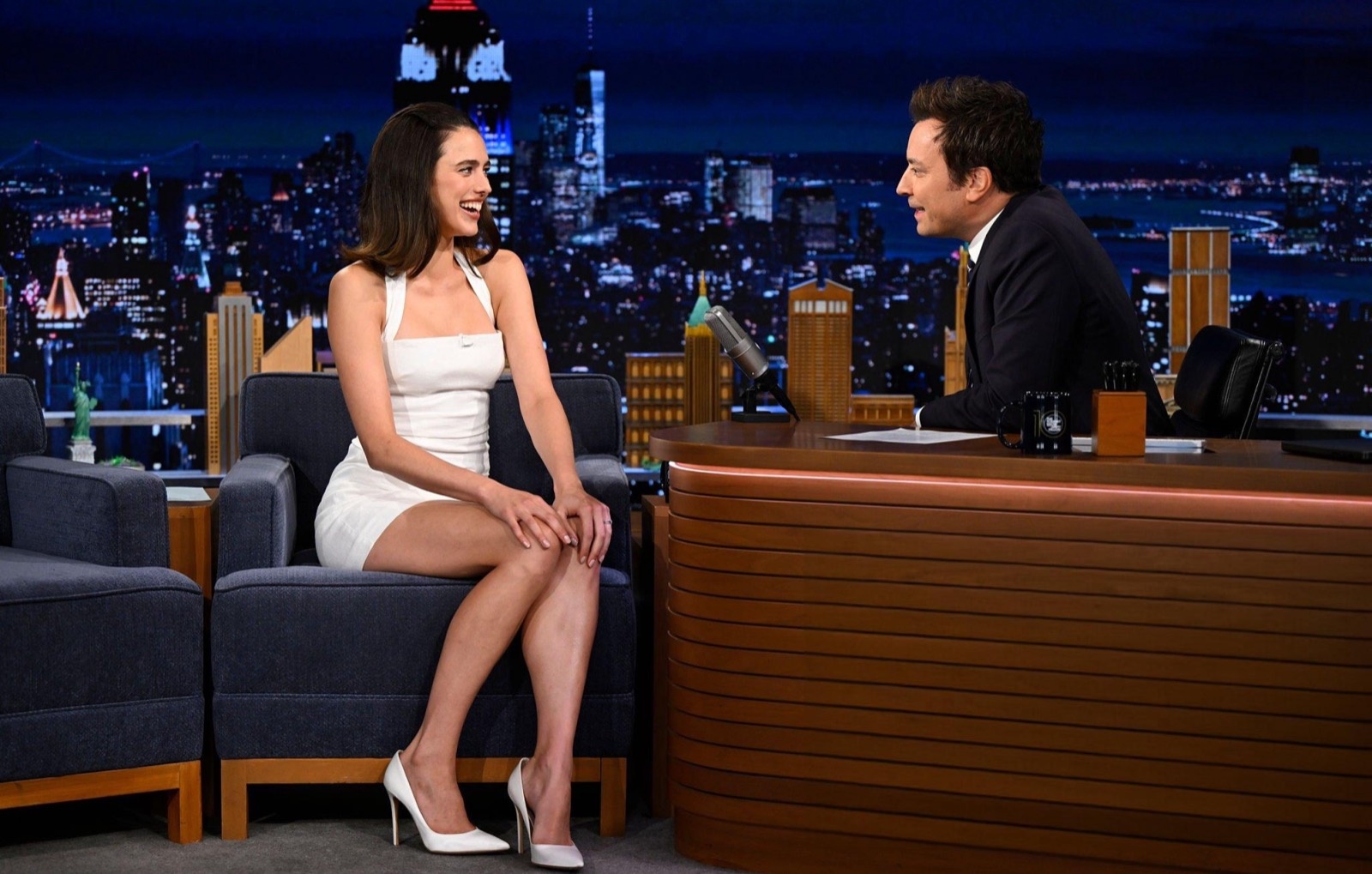Margaret Qualley débarque sur le plateau de Jimmy Fallon comme si elle sortait d’un cabaret chic des années 60, avec une mini-robe blanche à dos nu qui tient plus de la serviette de plage bien repassée que de la haute couture.