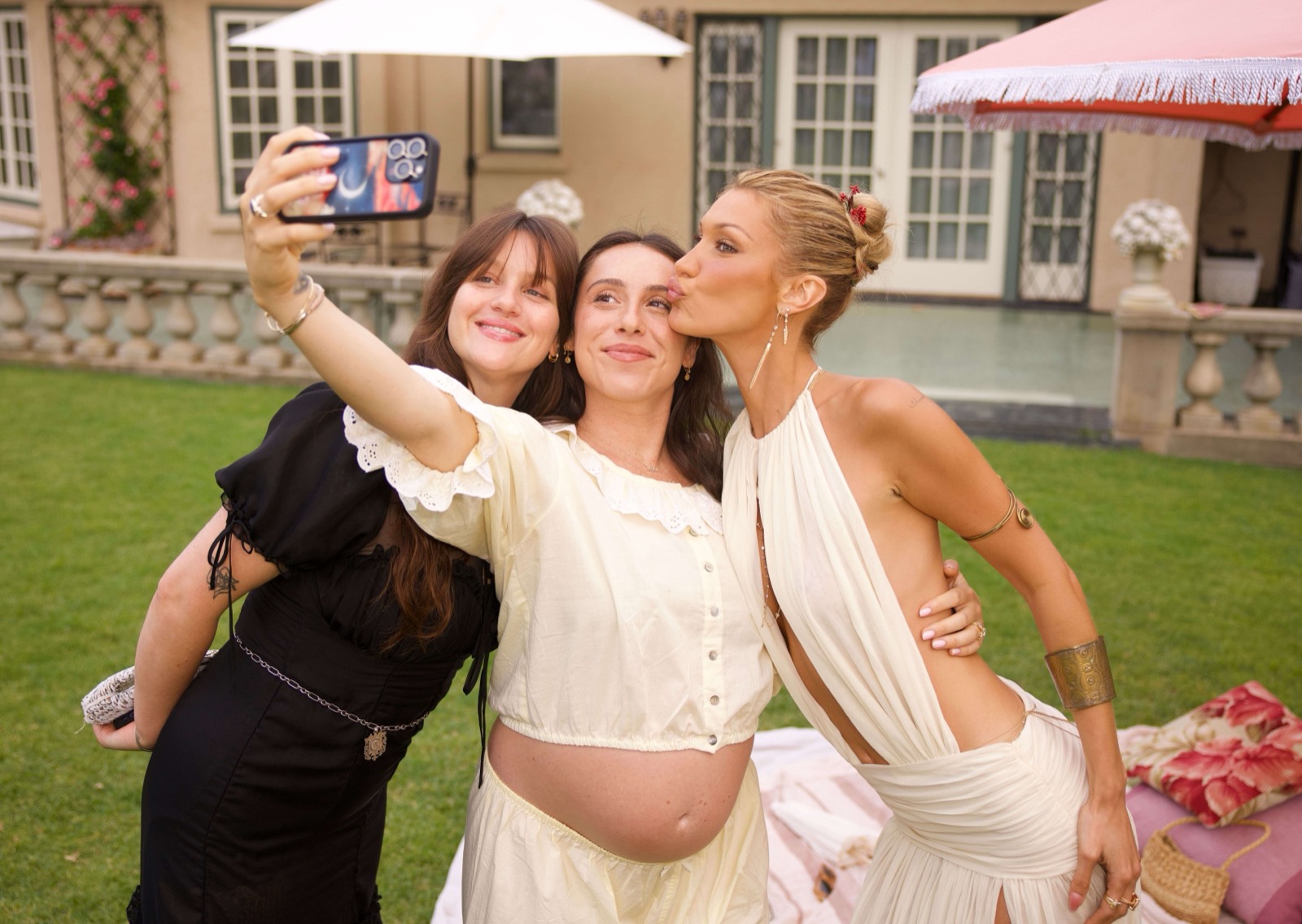 Drapée dans une robe blanche dos nu façon déesse grecque, elle alterne entre selfies, bisous appuyés et poses calculées qui feraient passer un shooting de Vogue pour une réunion de famille.