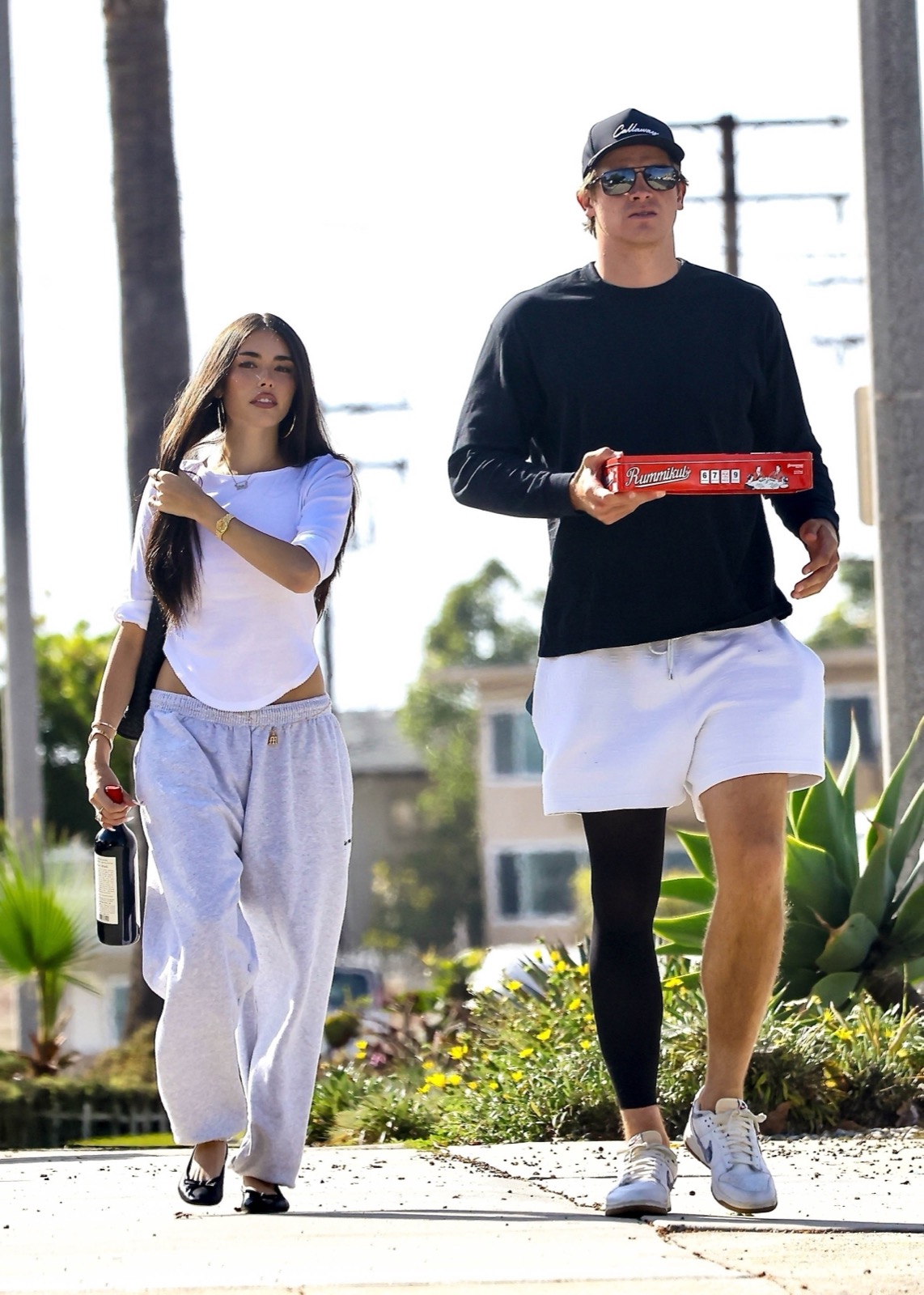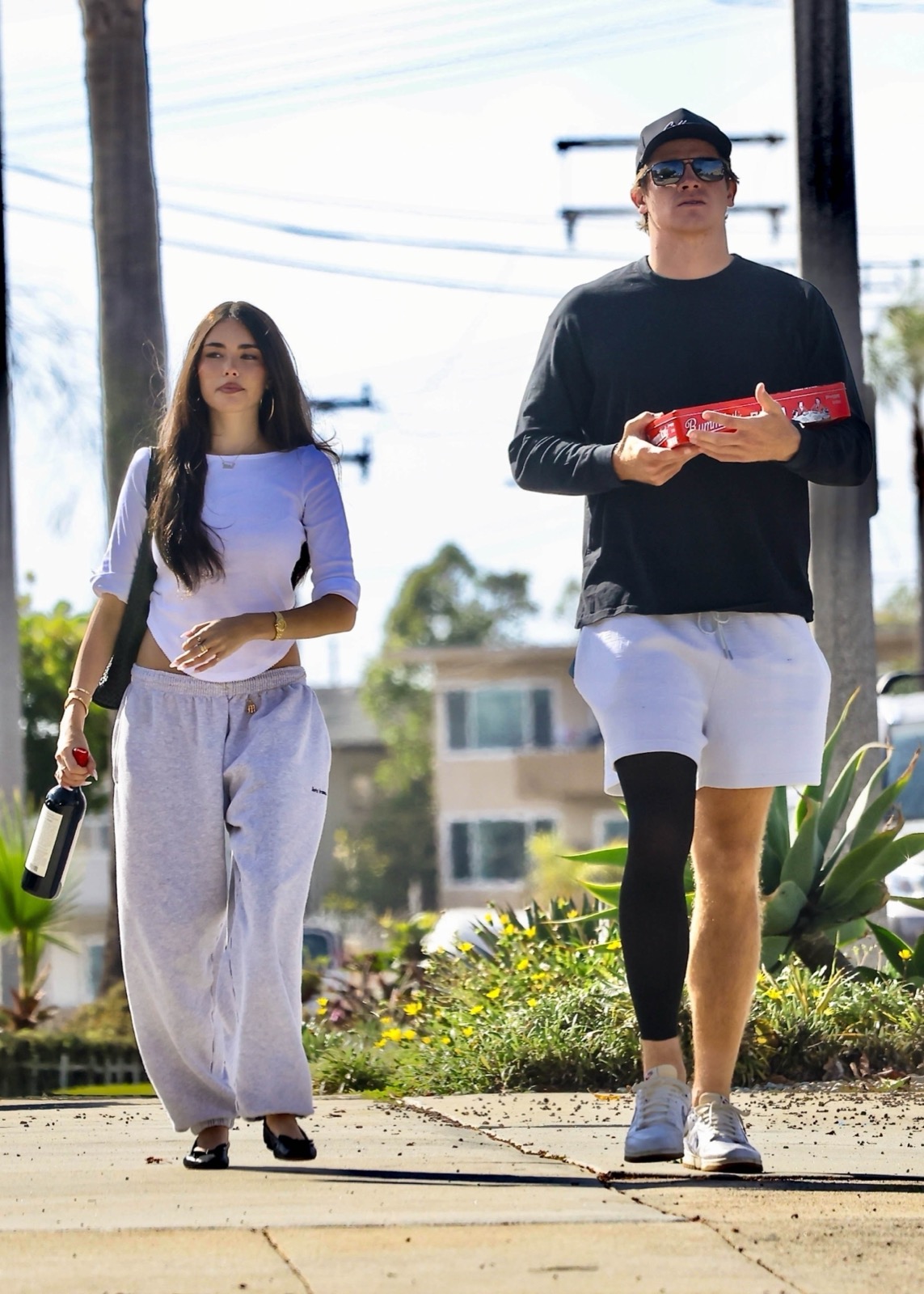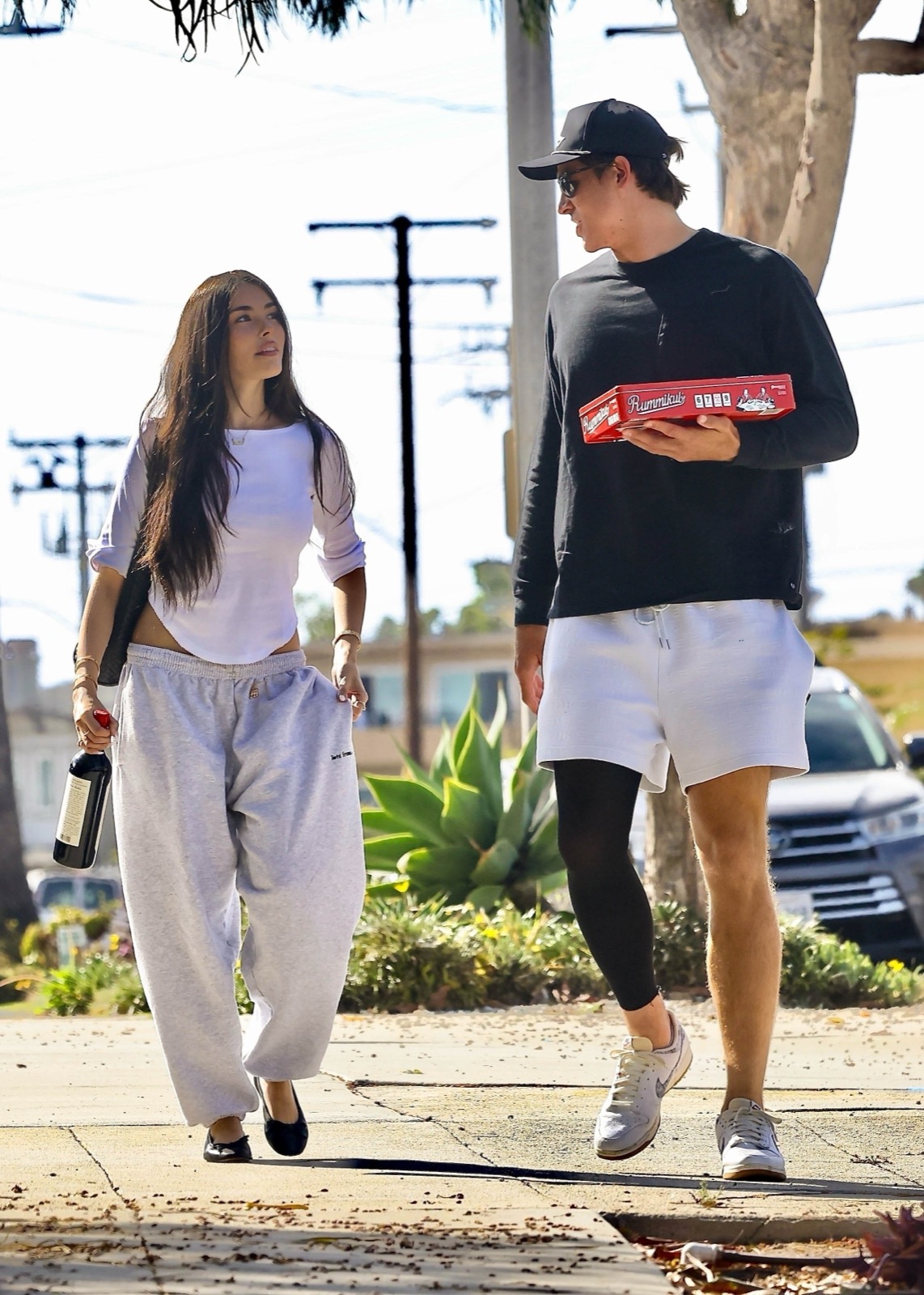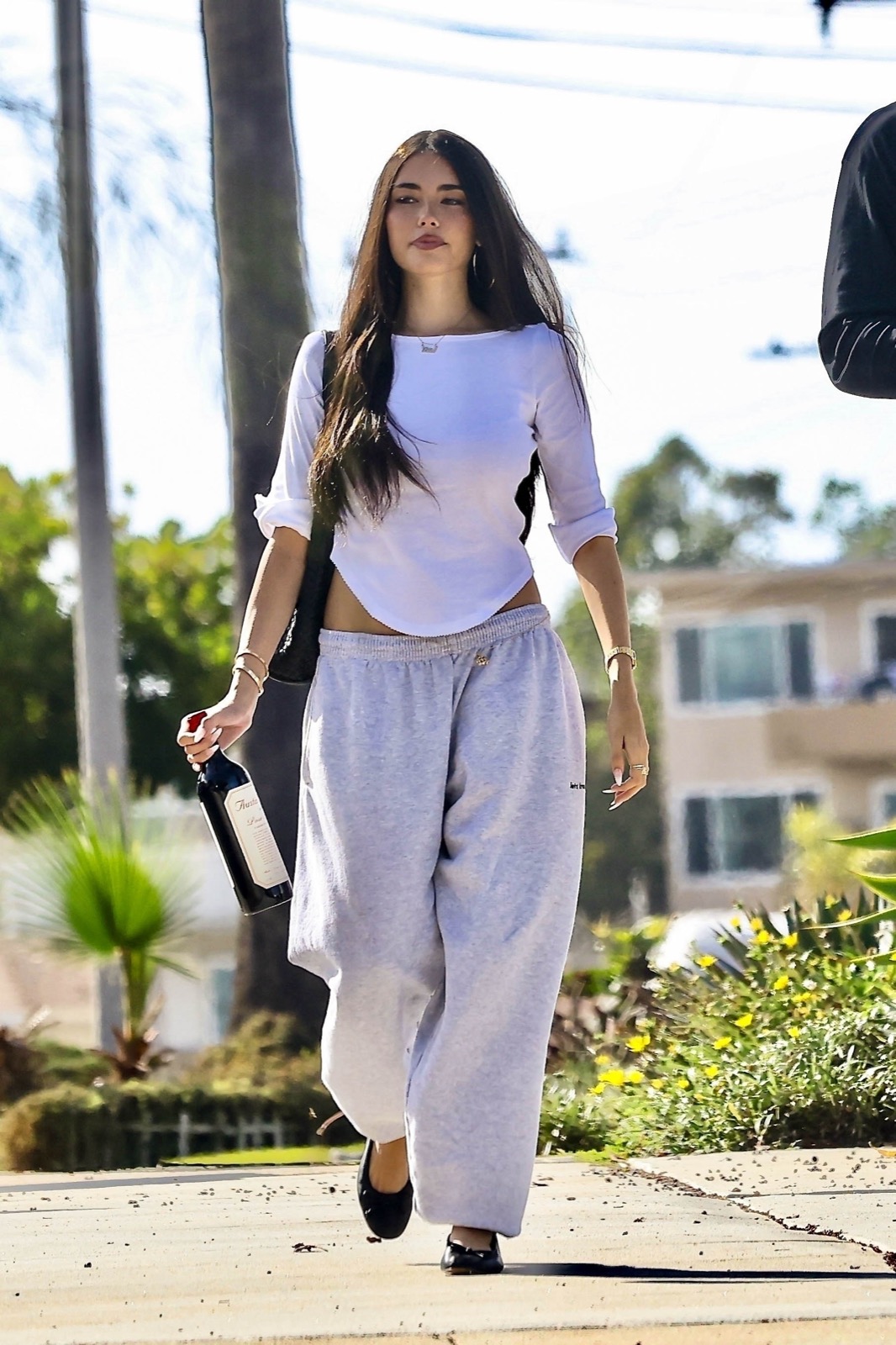 Dans les rues ensoleillées de Redondo Beach, Madison Beer a troqué le tapis rouge pour un combo plus terre-à-terre : un jogging gris clair, un top blanc ajusté et des ballerines noires, le tout accessoirisé par une bouteille de vin – détail chic et pratique.