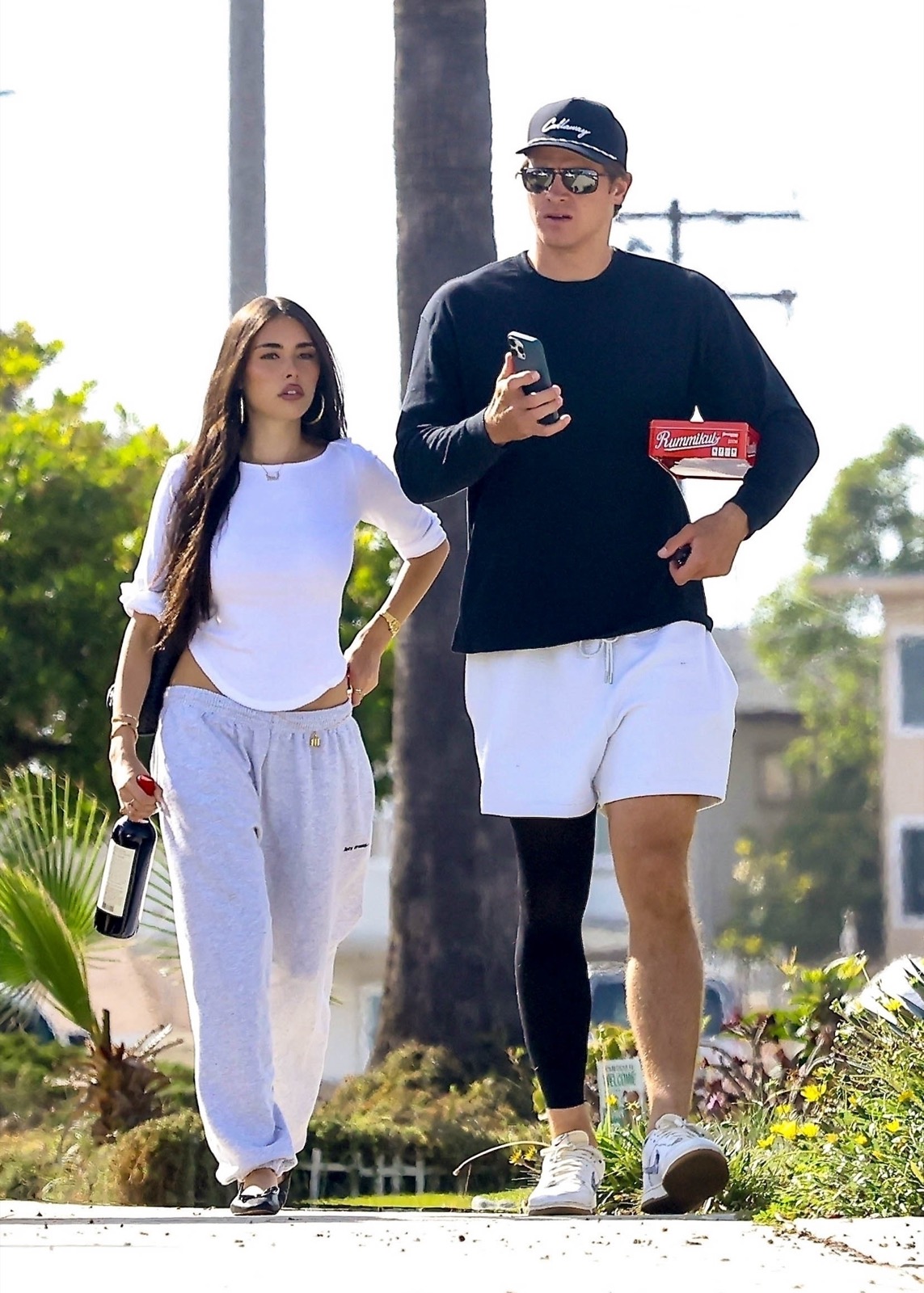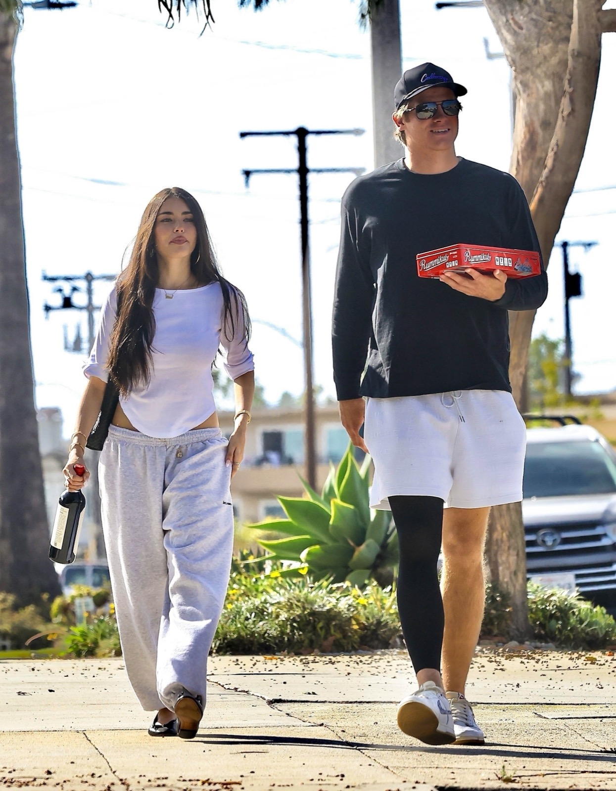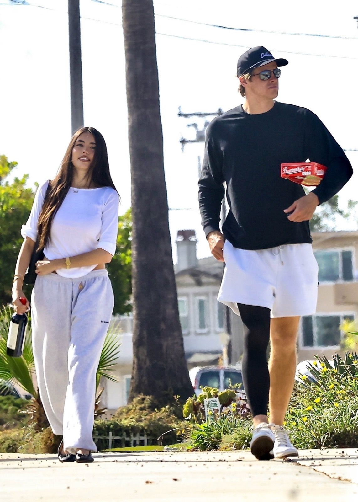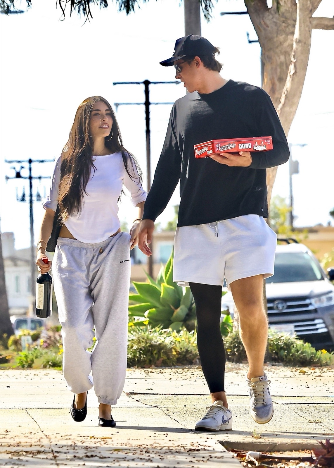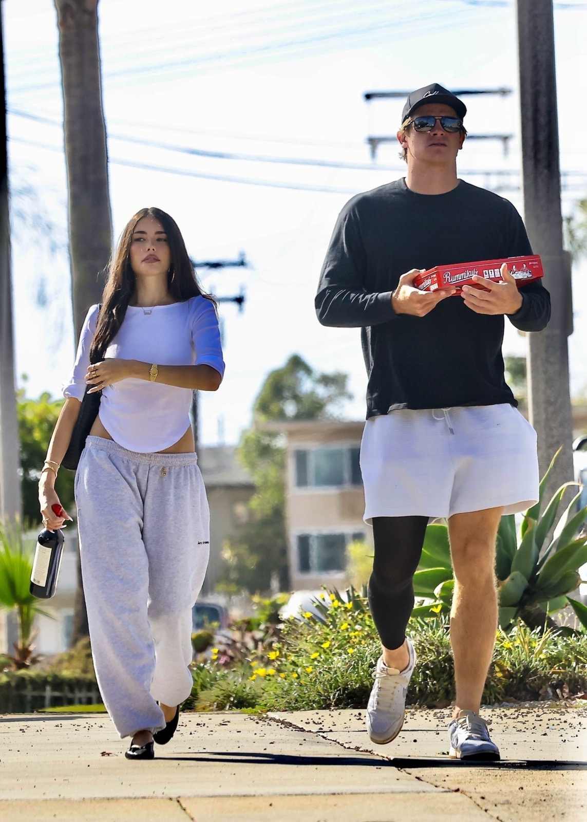 Dans les rues ensoleillées de Redondo Beach, Madison Beer a troqué le tapis rouge pour un combo plus terre-à-terre : un jogging gris clair, un top blanc ajusté et des ballerines noires, le tout accessoirisé par une bouteille de vin – détail chic et pratique.