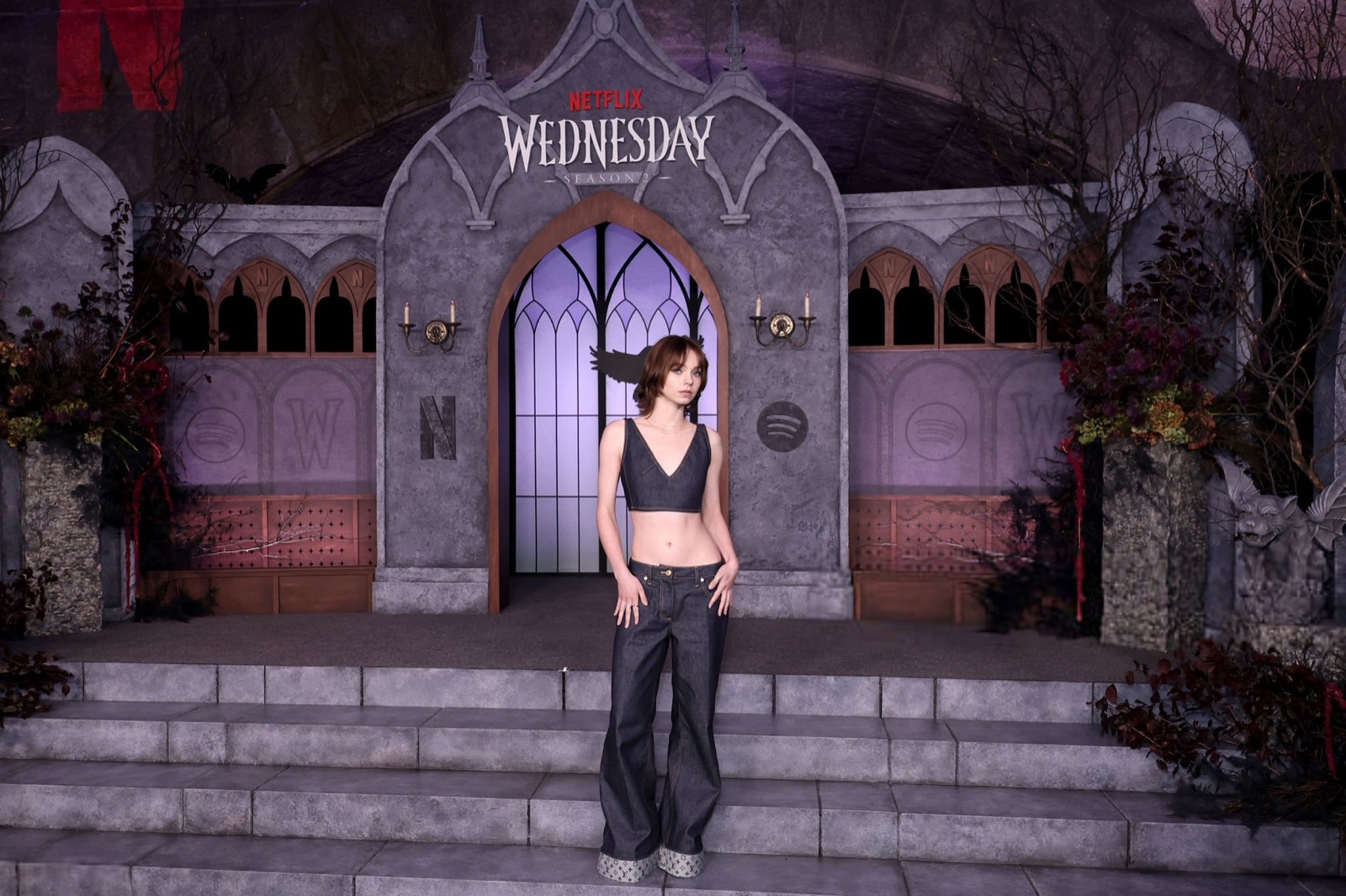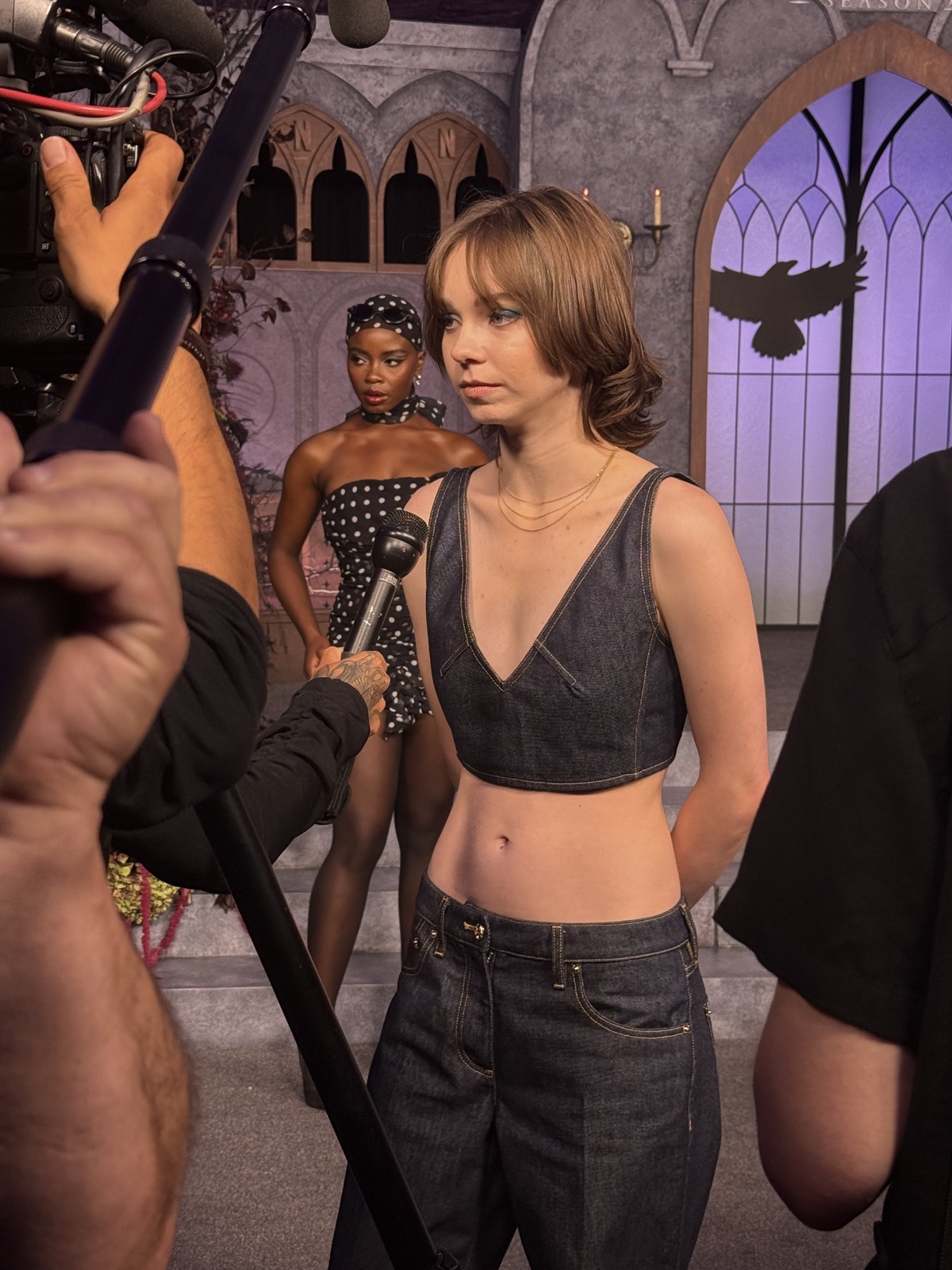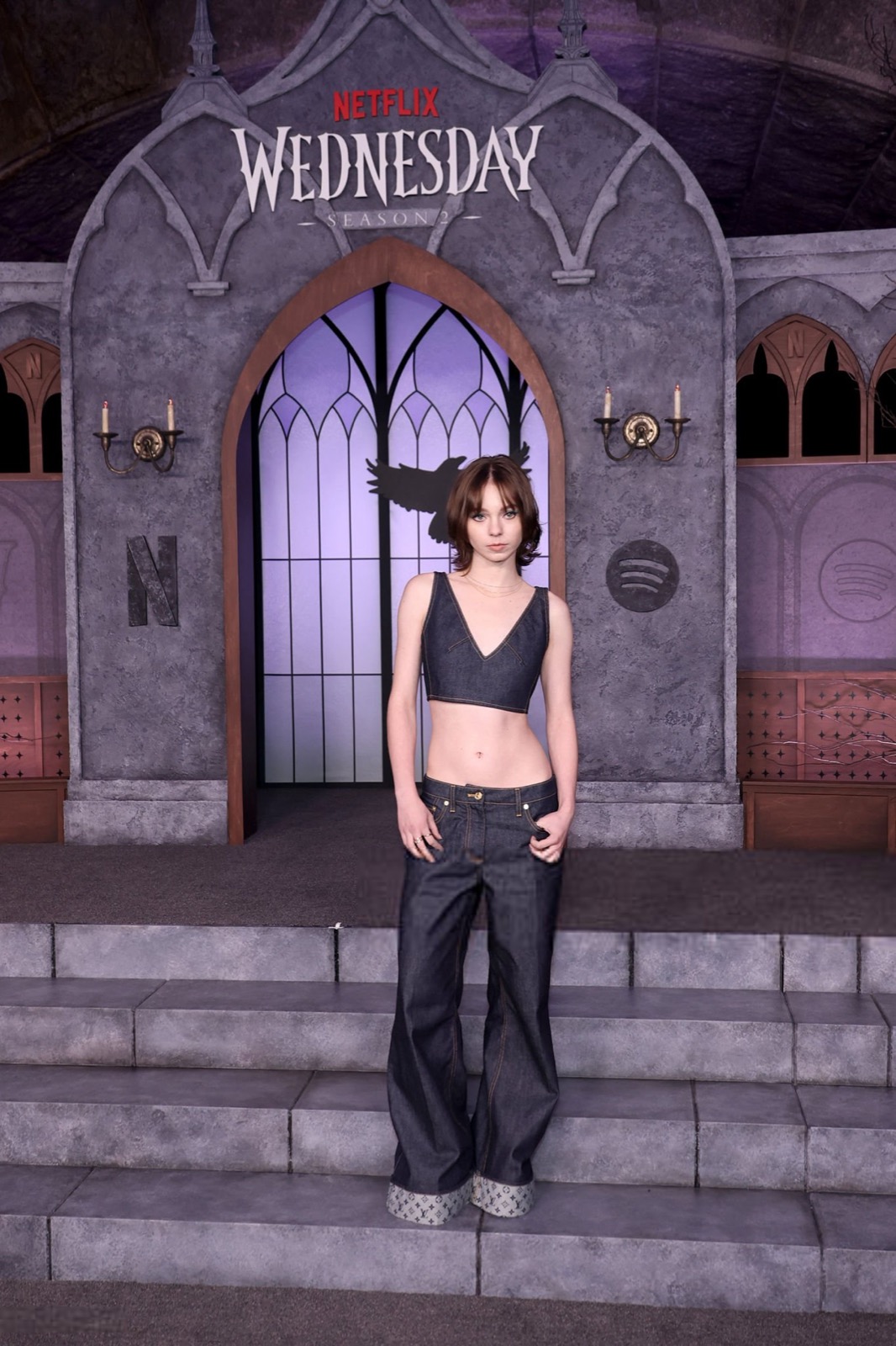 Devant un décor gothique digne de la série Wednesday, Emma Myers a opté pour un ensemble en denim brut. Un crop top à décolleté plongeant et un jean large à revers siglés, histoire de rappeler que le diable se cache dans les détails.
