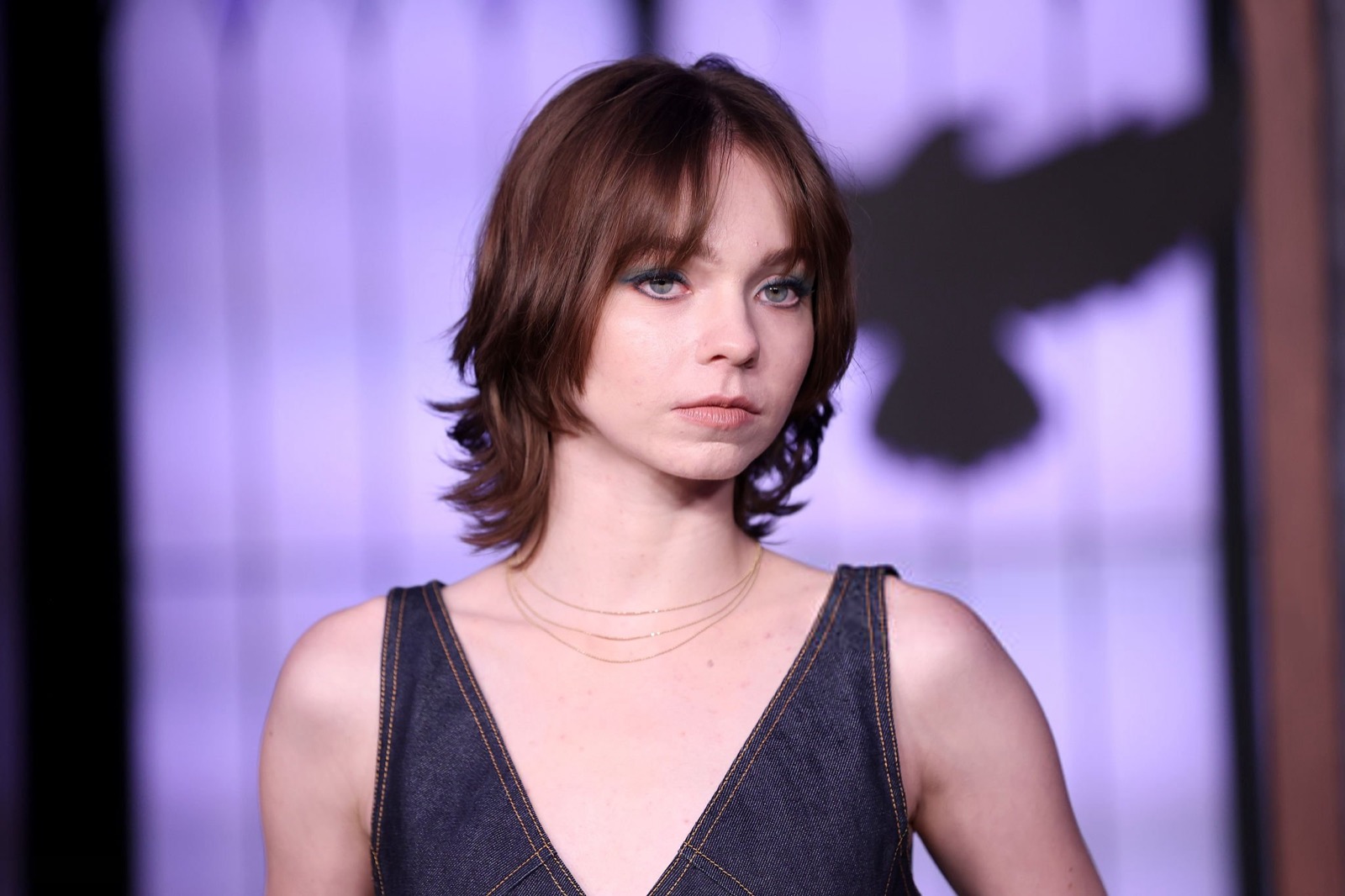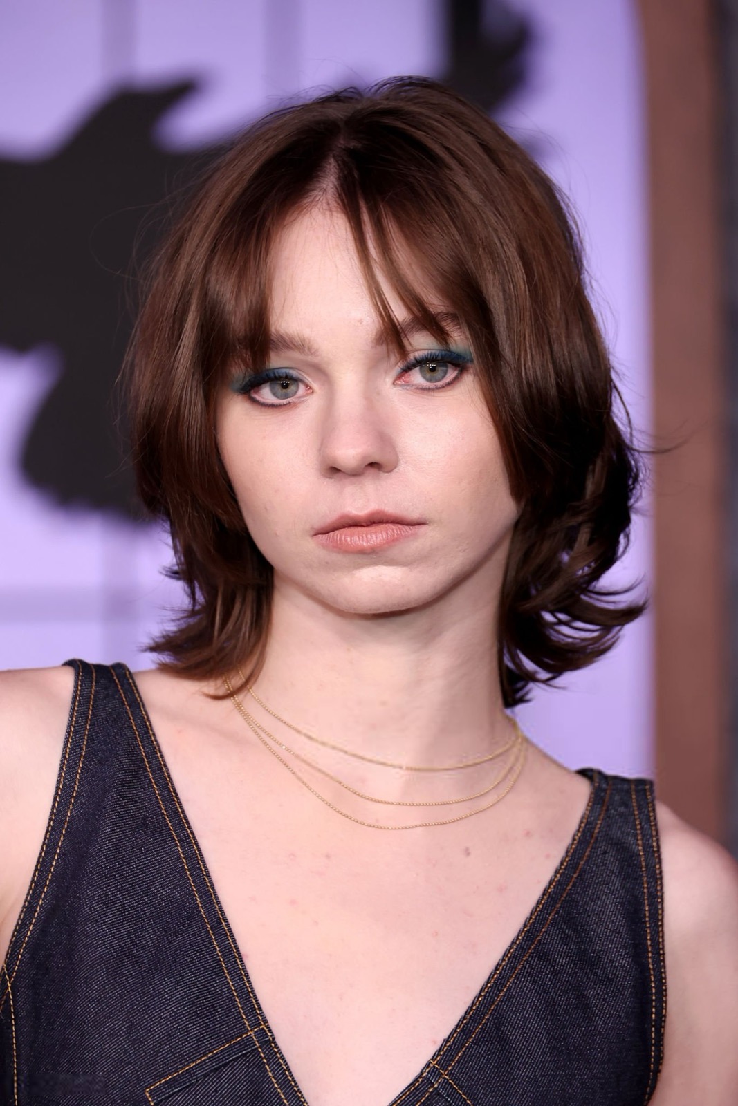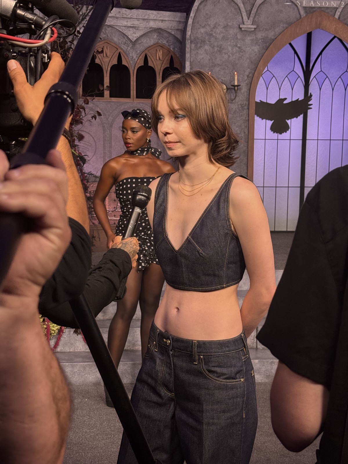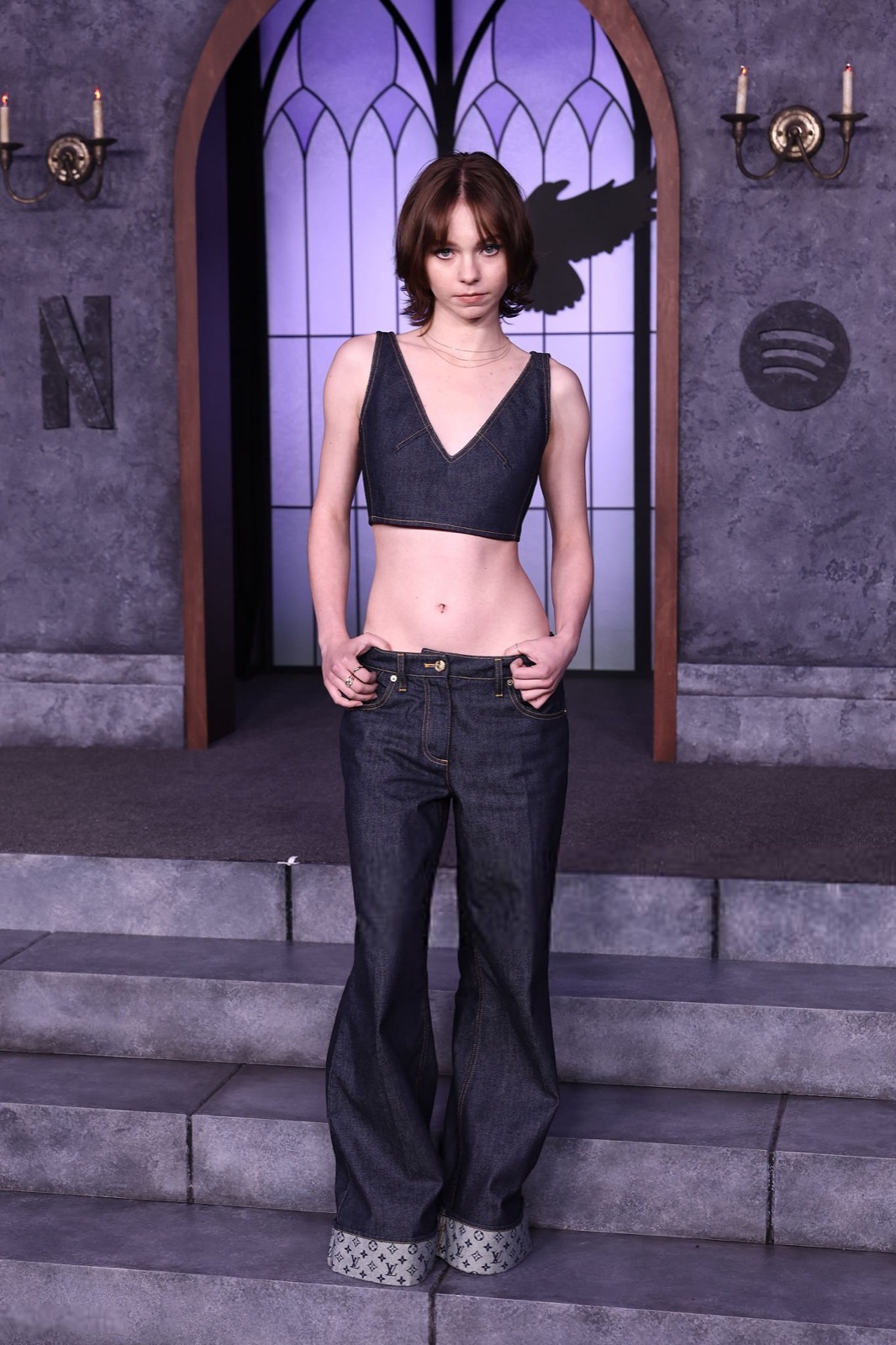 Devant un décor gothique digne de la série Wednesday, Emma Myers a opté pour un ensemble en denim brut. Un crop top à décolleté plongeant et un jean large à revers siglés, histoire de rappeler que le diable se cache dans les détails.