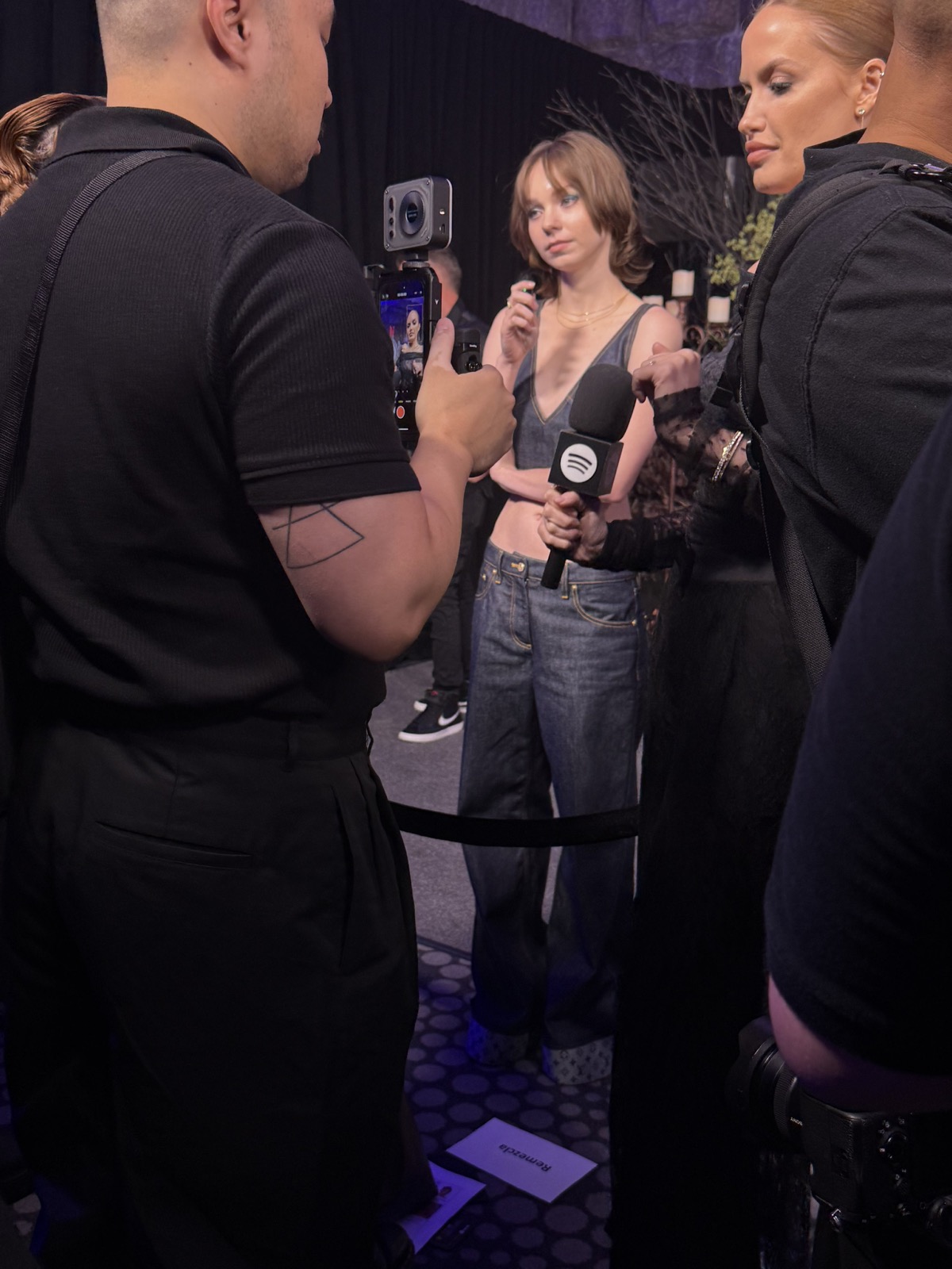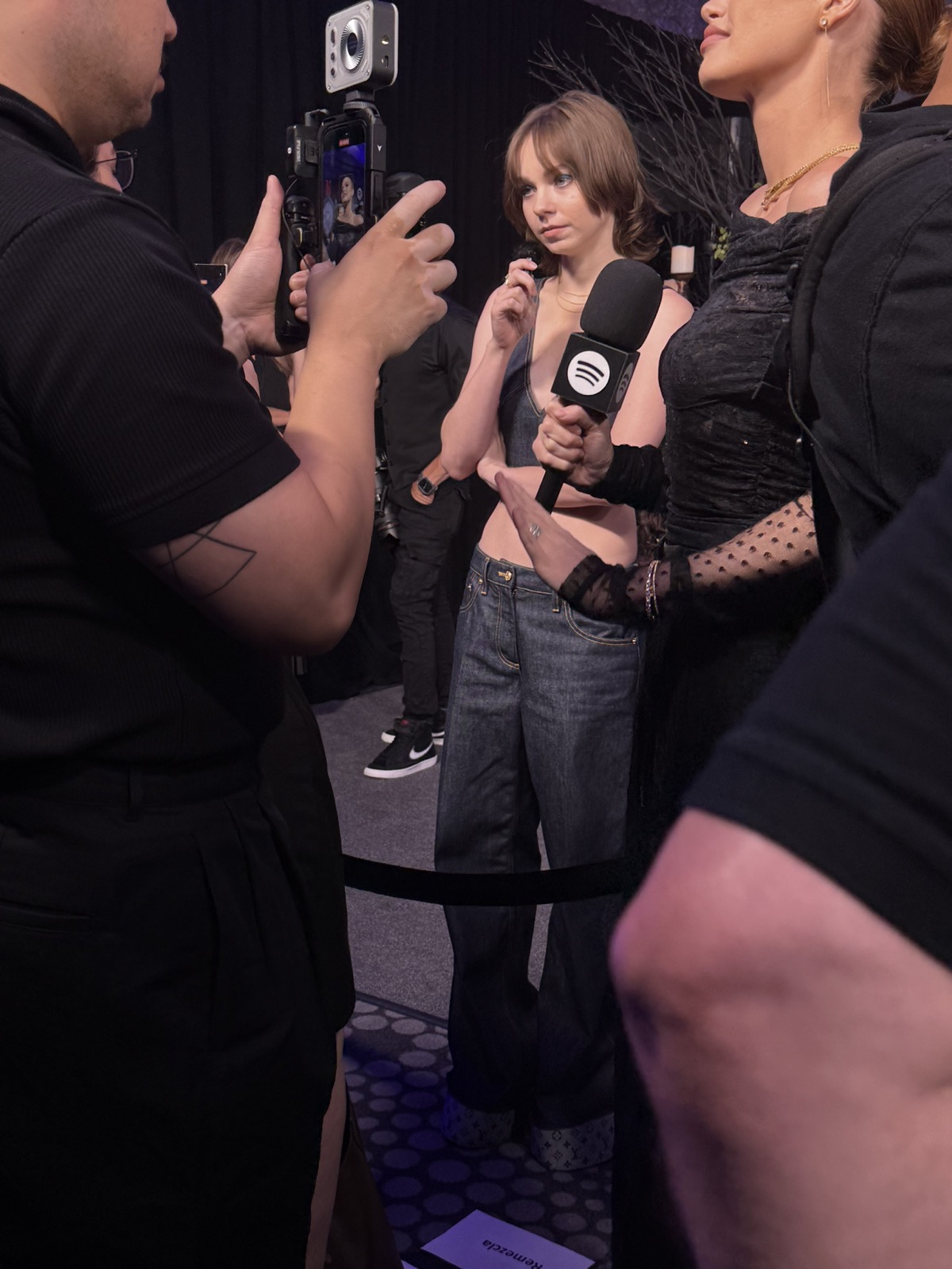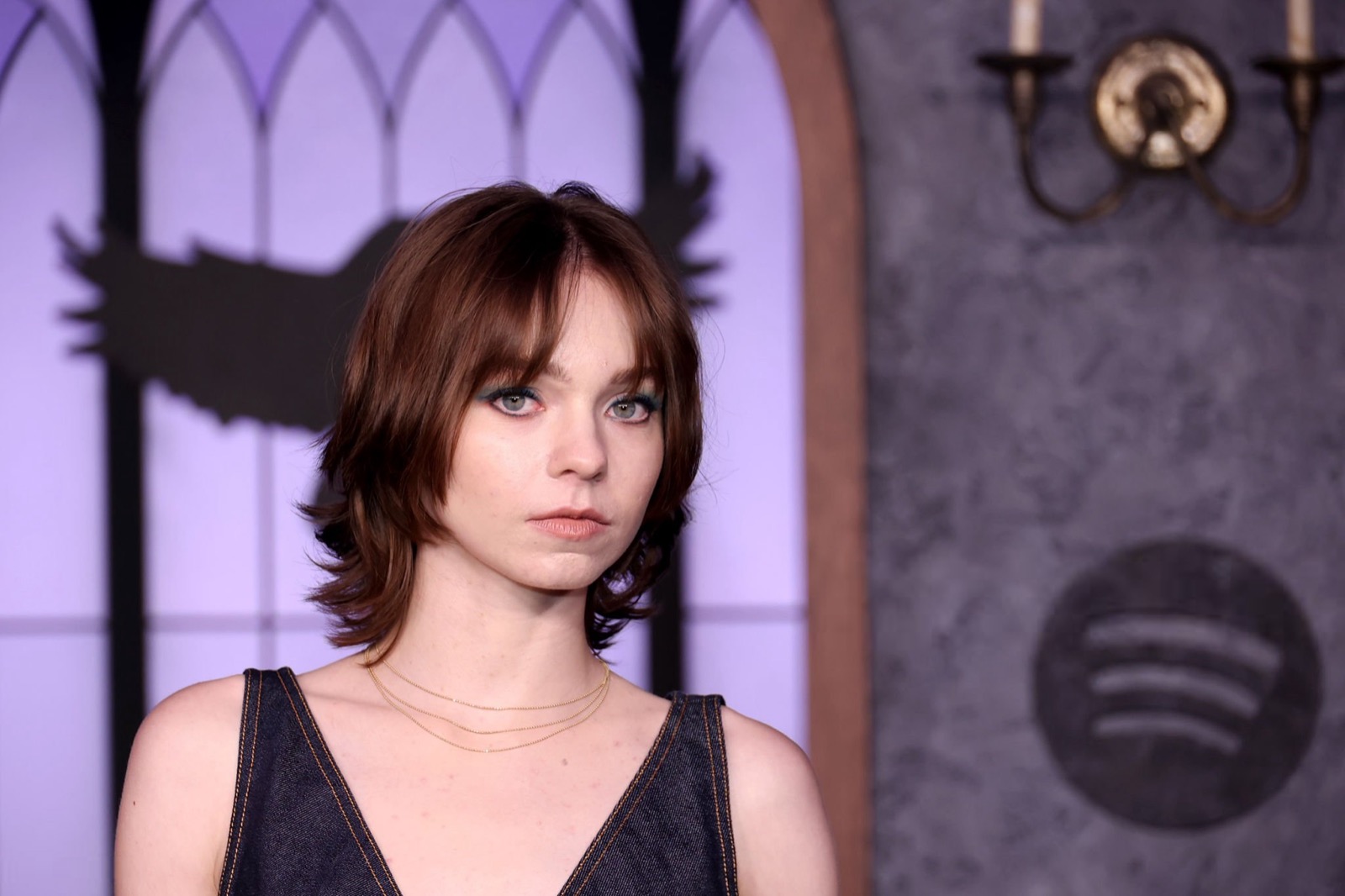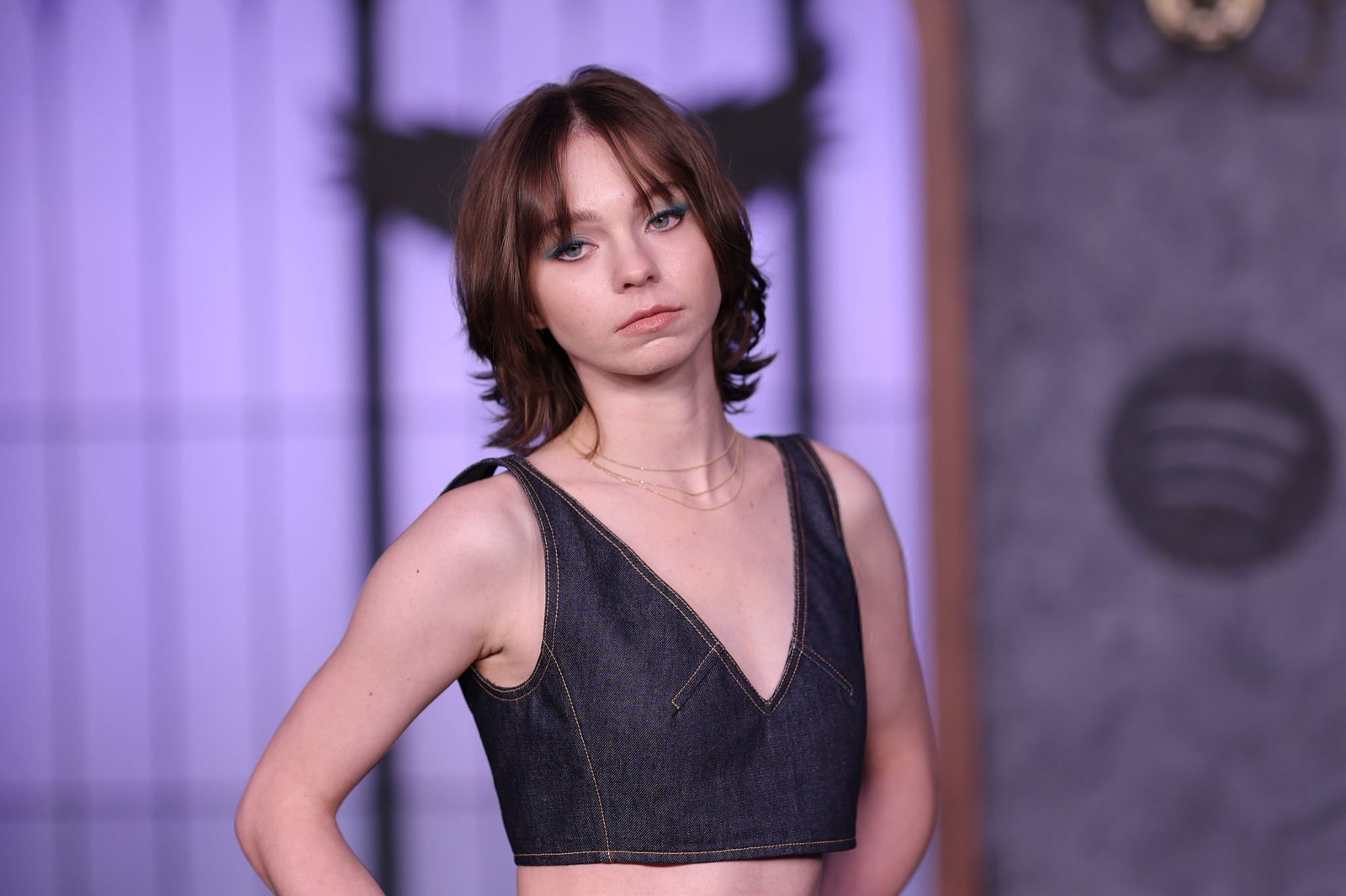 L’actrice pose avec une nonchalance calculée, les mains dans les poches, le regard d’acier, comme si elle n’avait pas remarqué les projecteurs. Autour d’elle, les symboles de Netflix et Spotify trônent fièrement, ambiance partenariat corporate déguisé en cérémonie gothique.