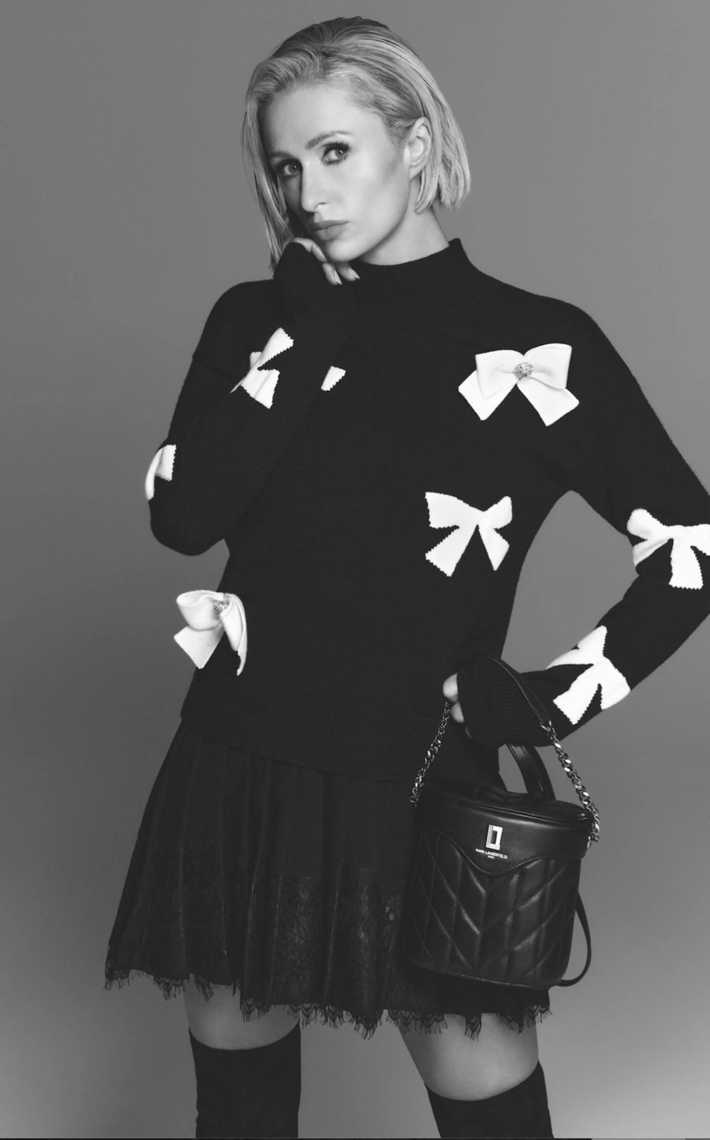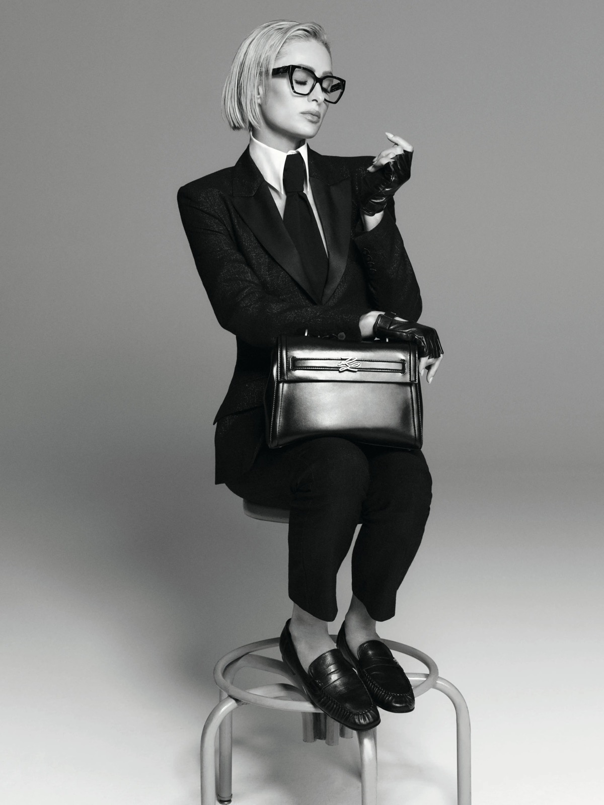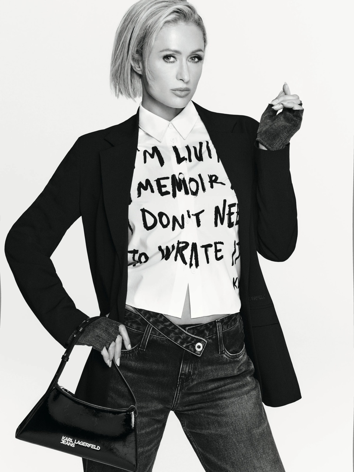 Dans ce shooting glacé, Paris Hilton se drape de noir et d’ironie, perchée entre tailleur structuré et bottes oversize, brandissant son sac comme s’il s’agissait d’un sceptre. Les gants en cuir et les manches pelucheuses ajoutent la dose de drame qu’on attend d’une campagne Karl Lagerfeld.